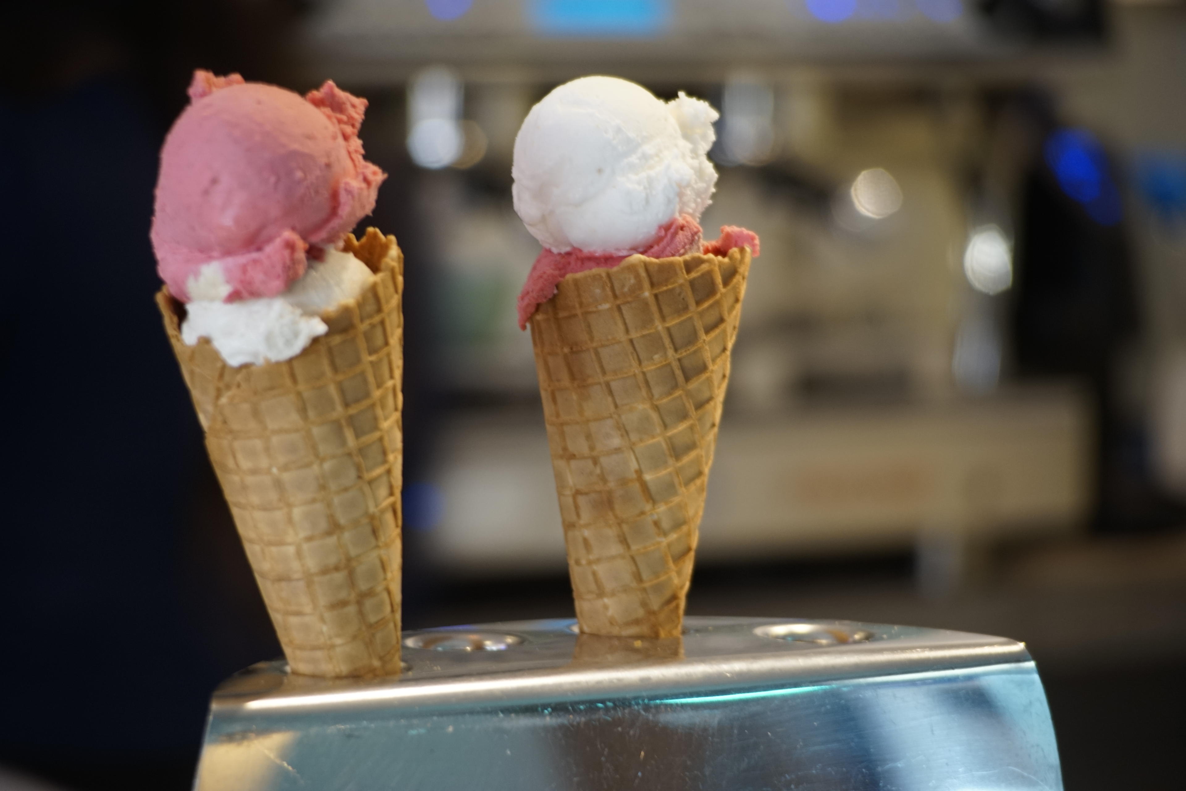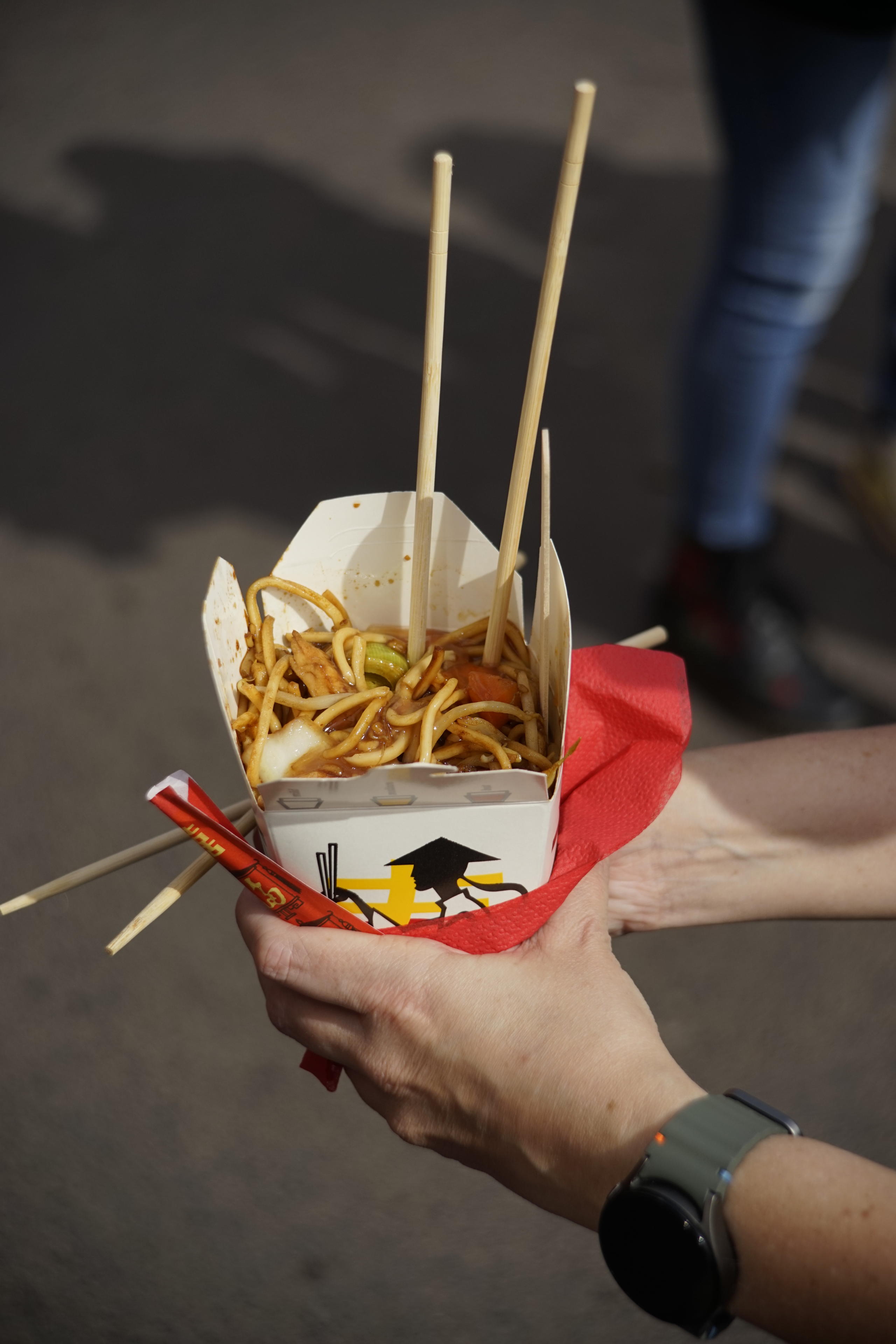 Nach diesem aufregenden Ausflug aufs Riesenrad hatten wir Hunger und wir haben uns Nudeln am chinesischen Stand mit genommen. Die waren sogar einigermaßen essbar für die Kategorie "Nahrungsmittel, die man auf der Kirmes erwerben kann". Ich würde sogar so weit gehen zu sagen, die waren durchaus lecker. Nun lag es aber auch vielleicht daran, dass ich Hunger hatte wie ein Tier! Wie einer von diesen T.-rexen, die hier überall rum hingen. Aber nicht nur das: Danach sind wir noch mal runter bis zur Kirche und haben im angeblich besten Eiscafe der Stadt je zwei Kugeln aufs Hörnchen applizieren lassen! Weil: Lecker. Das war glaube ich unser drittes Eis dieses Jahr, hatten wir nachgerechnet? Oder das vierte? Wir gehen zu wenig vor die Tür, ich merk das wieder. Haben uns dann jedenfalls beim Gemeindesaal (oder was ist das da) auf ein der Bänke niedergelassen und unser Eis gegessen.