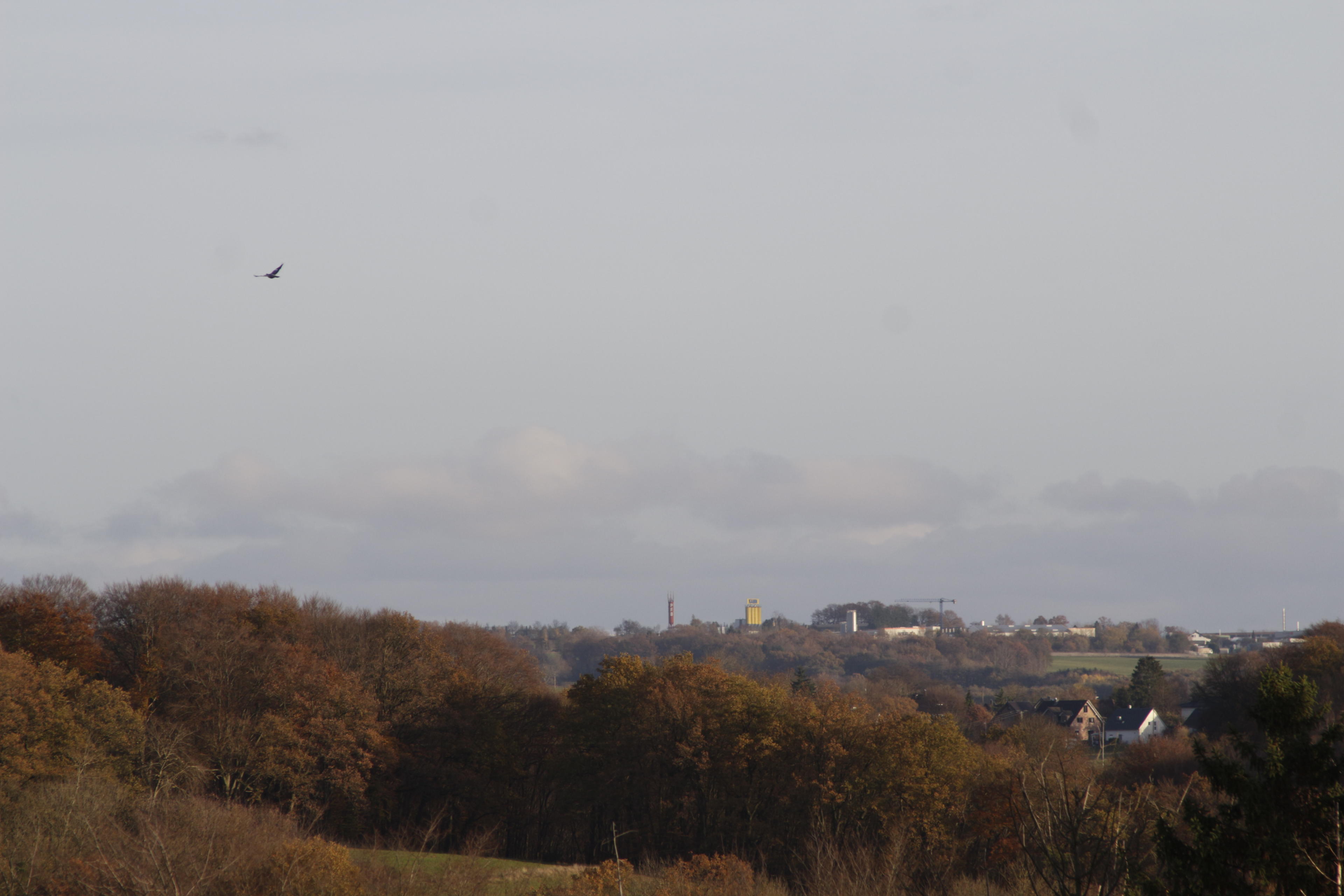 Ich bin da besser in der Disziplin "faul auf der Sonnenliege liegen" aufgestellt. Die Sonne steht hier leider in die andere Richtung, zumindest abends um diese Tageszeit. Das hat allerdings auch Vorteile: Man kann den Blick schweifen lassen, ohne die ganze geblendet zu werden. Bis hinten raus nach Rheinlandpfalz kann man gucken. Da steht so ein Turm rum, direkt hinter der Grenze. Selbst mit der beschränkten Auflösung der Canon und dem nicht ganz so scharfen 75-300mm kann man da tatsächlich noch was lesen. PFB steht wohl auf dem Silo-Dings, KANN auf dem anderen, klotzigen Teil daneben, was wohl auch irgendwelche Vorrats-Behälter sind. (Siehe Google Streetview, aber Vorsicht vor den Tracking-Cookies!