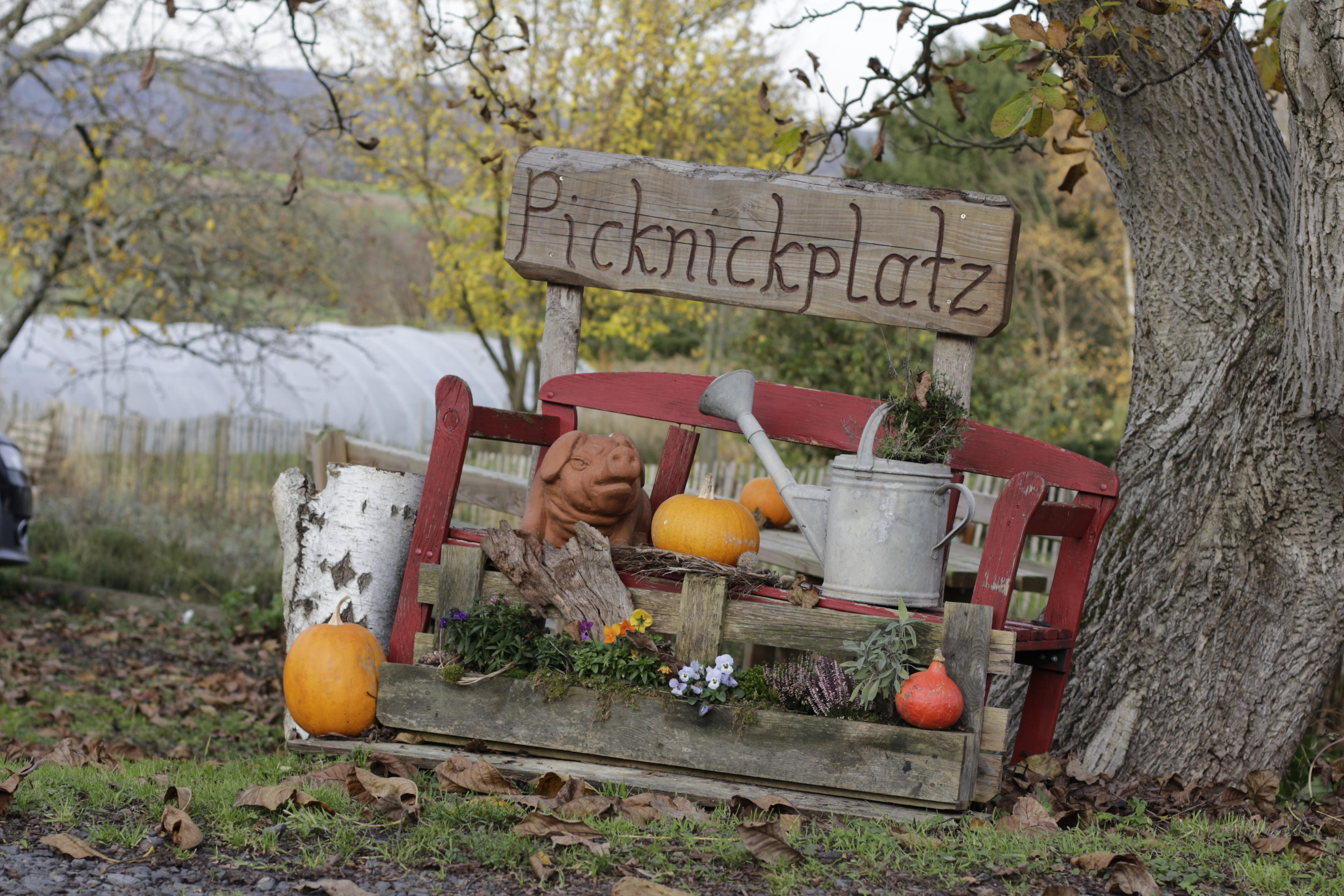 Wenn man den Weg weiter runter geht, kommt man als erstes mal an einen Hofladen, bevor man in das eigentliche Dorf Süchterscheid gelangt. Der Picknickplatz ist zwar nett, aber ich wüsste jetzt echt nicht, wo man sich da hin setzten sollte, da ist ja alles belegt.