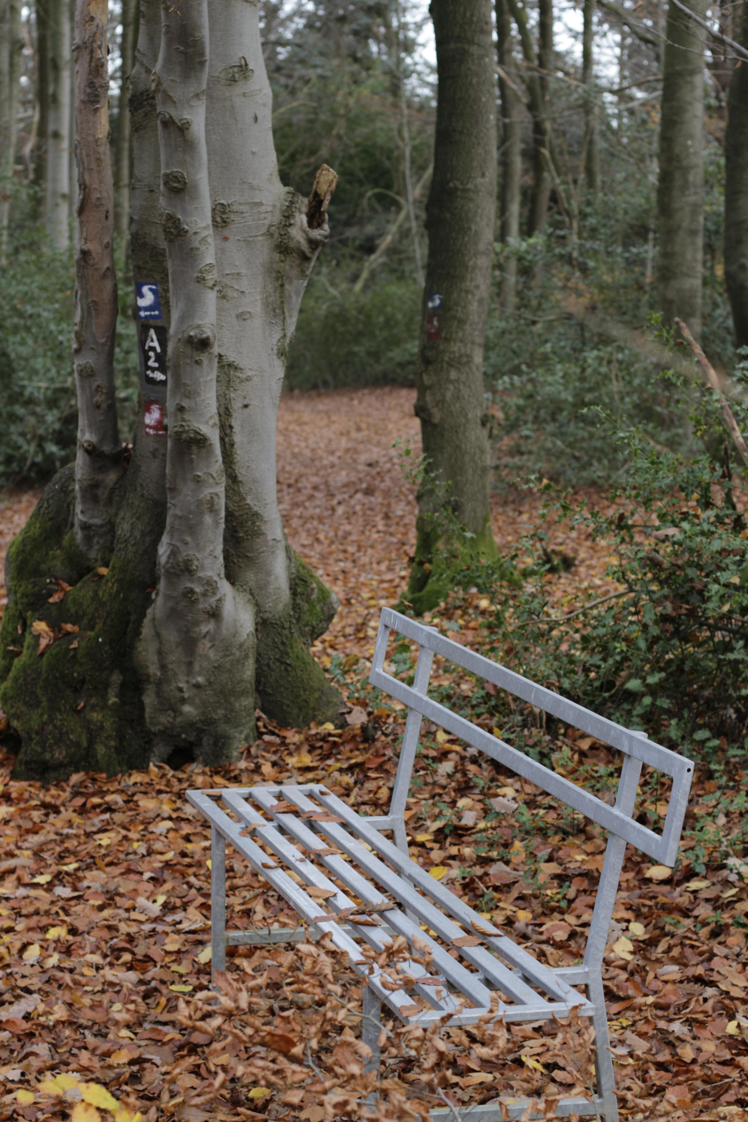 Ich meine mich dunkel zu erinnern, dass ich das gleiche Absperrband bereits schon mal fotografiert habe. Warum das da hängt, ist mir allerdings genau so schleierhaft wie die Begrenzungspfosten weiter oben. Ich nehme an, die haben was mit dem Gedöns zu tun, das hier hinter der Hecke steht. Sieht aus wie Baumaschinen. Gegenüber jedenfalls eine weitere Bank der faulen Liegesorte.