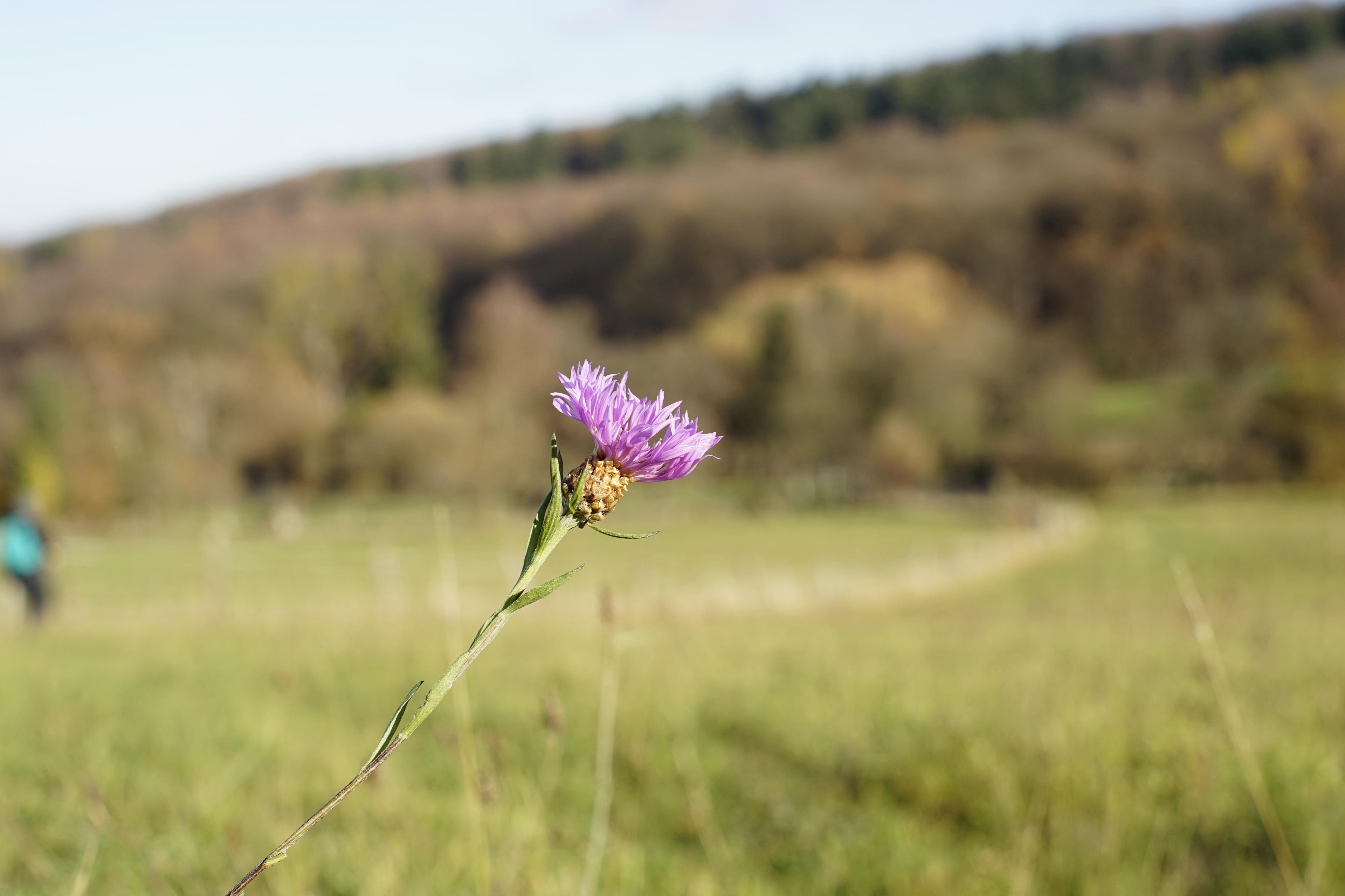 Da es auch hier oben recht kühl war, haben wir uns recht flott für den Abstieg entschieden. Nicht nur das, auch das Essen hat so kräftig aus der Küche heraus geduftet, dass ich Hunger gekriegt habe. Deswegen noch schnell ein paar Blumen mit dem Tele bearbeitet, das Vogelhaus eingepackt und die Lampe im Vorgarten ebenfalls, aber dann auch wirklich los, durch den Frost der letzten Nacht, der auf der Rückseite tatsächlich nicht getaut war. Scheinbar schafft es in dieser Jahreszeit die Sonne nicht mehr über den Berg. Runter den anderen Weg genommen, der leider sehr steinig ist und zudem von Herbstlaub verdeckt, sodass wir erst mal an der Abzweigung vorbei gelaufen sind, weil wir den gar nicht wahrgenommen hatten, und dann habe ich mir so richtig meine Wanderstiefel gewünscht. Das Profil an meinen Schuhen ist auch nur noch so mäßig. Früher hat sowas mal länger gehalten! Musste ich jedenfalls aufpassen, mich nicht auf den Popo zu setzen, also eher keine Fotos gemacht.