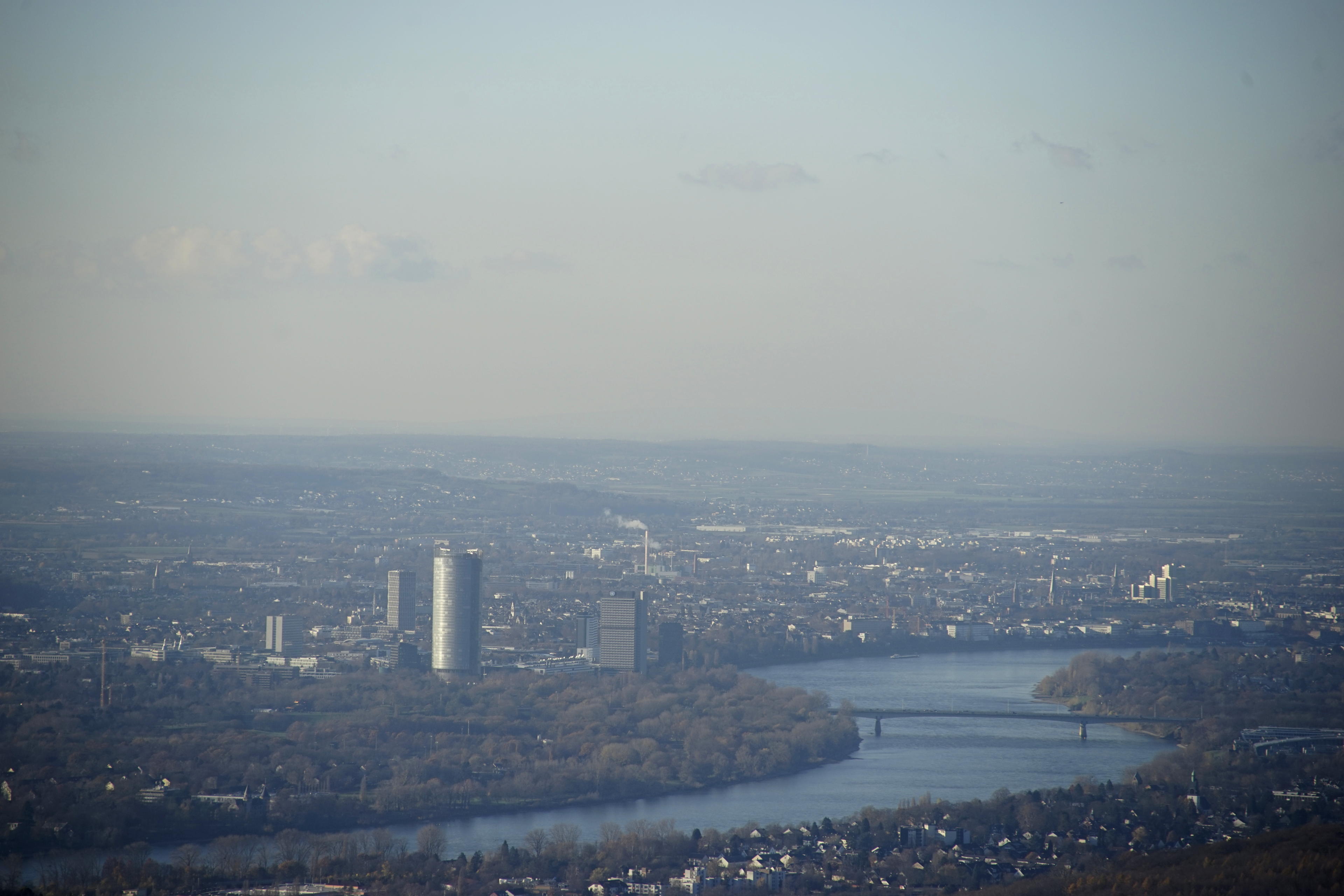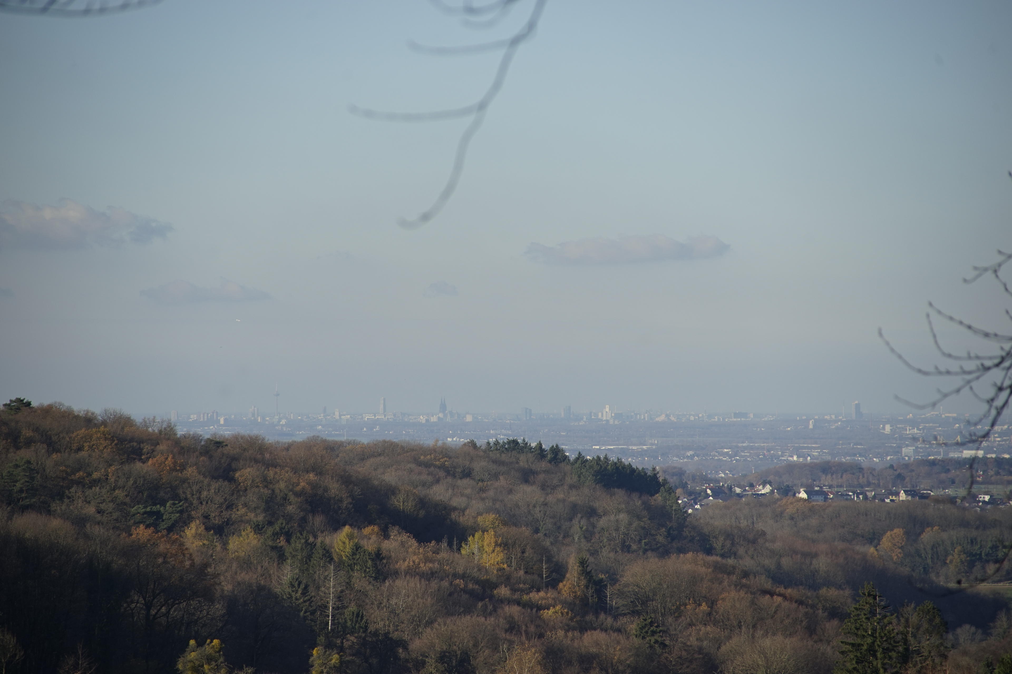 Von hier oben hat man jedenfalls auch schon mal einen sehr spannenden Blick auf das Rheintal und die Industrie am Horizont jenseits von Köln, bevor es dann in den Wald hinein geht und man den eigentlichen Anstieg auf den Berg hinauf hinter sich bringen muss. Bis hier hin war das ja nur Übung, jetzt wird es ernst.