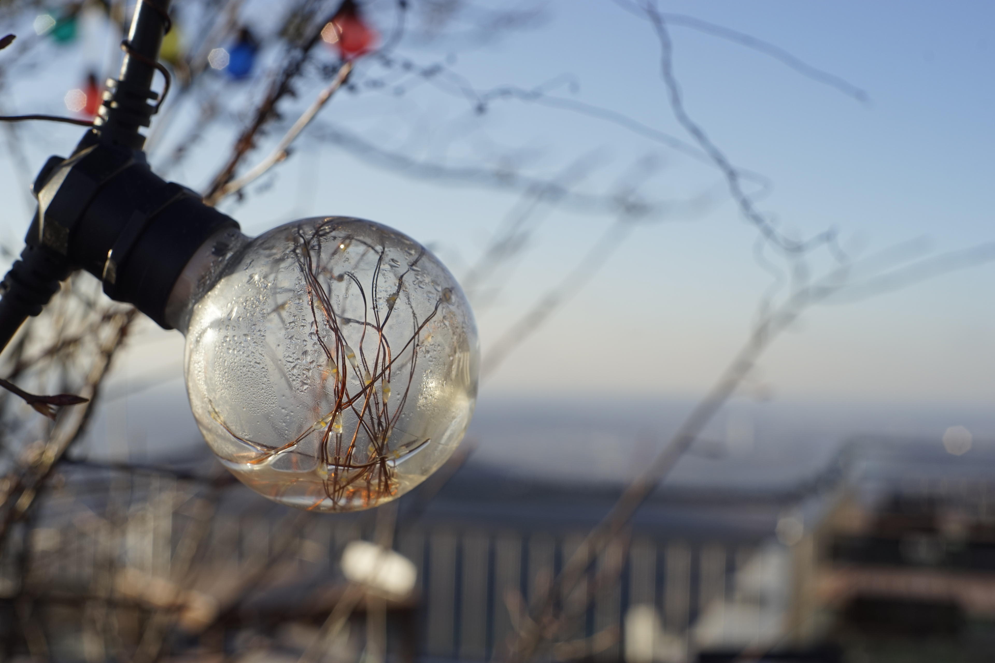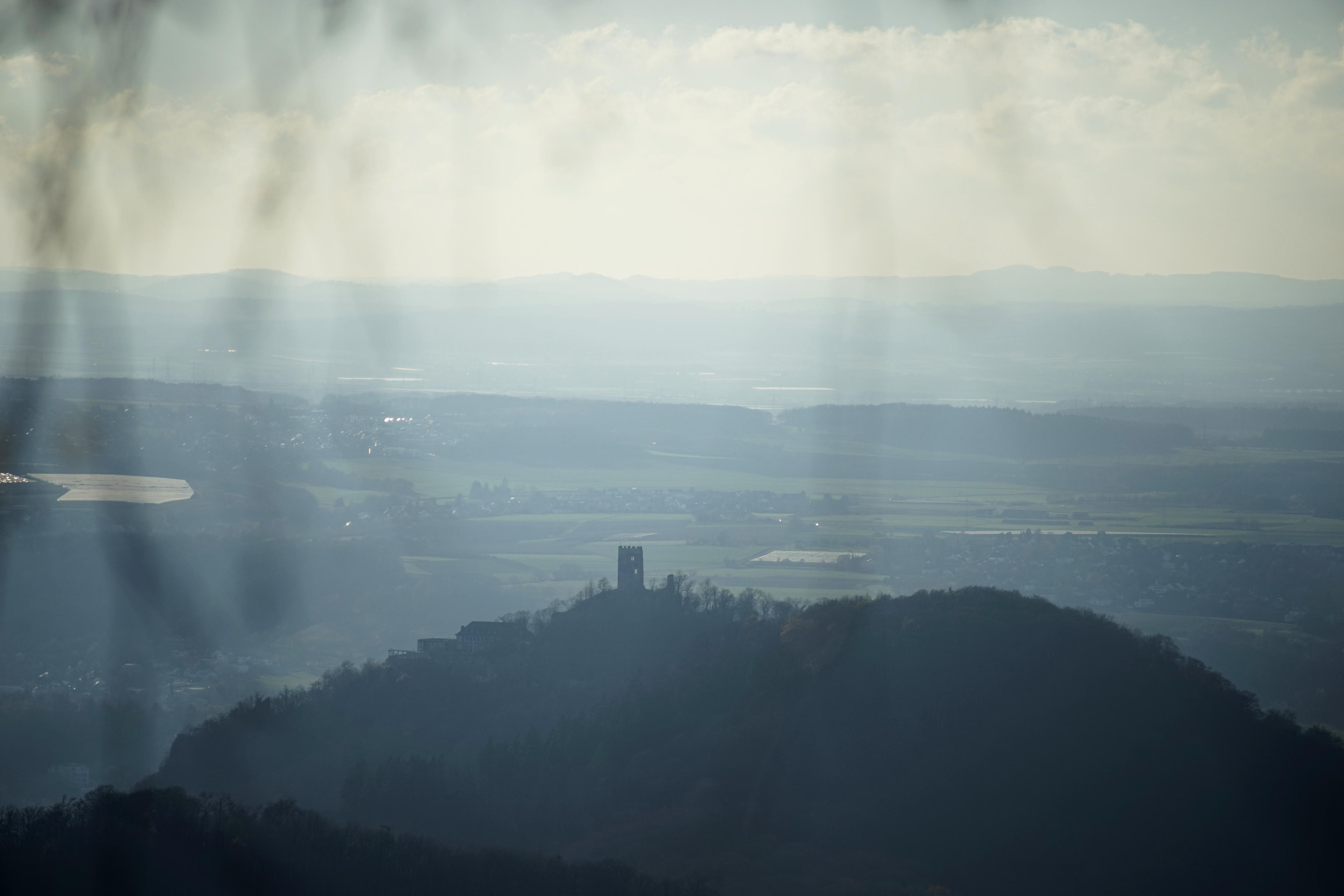 Die zerbrochenen Lampen der Lichterkette fotografiere ich hier oben ja scheinbar auch jedes Mal. Aber die kommen gerade in diesem knalligen Herbstlicht so richtig bunt rüber, da kann ich ja nicht einfach so dran vorbei gehen. Aber dann musste ich mich wieder mit dem Ausblick beschäftigen. Die Sicht war an jenem Tag aber auch mal wieder besonders gut. Sämtliche Ruinen ringsrum waren hervorragend zu erkennen und der Blick nach Bonn und Köln war den Aufstieg ebenfalls wert. In der Ferne über der Eifel und angrenzenden Gebieten war es dann allerdings schon ein bisschen dunstig, wobei das im Foto nachher seltsamer Weise mehr in Richtung grünlich statt bläulich geworden ist. Hab ich den Weißabgleich geärgert? Kam mir "in Echt" nicht so grün vor.