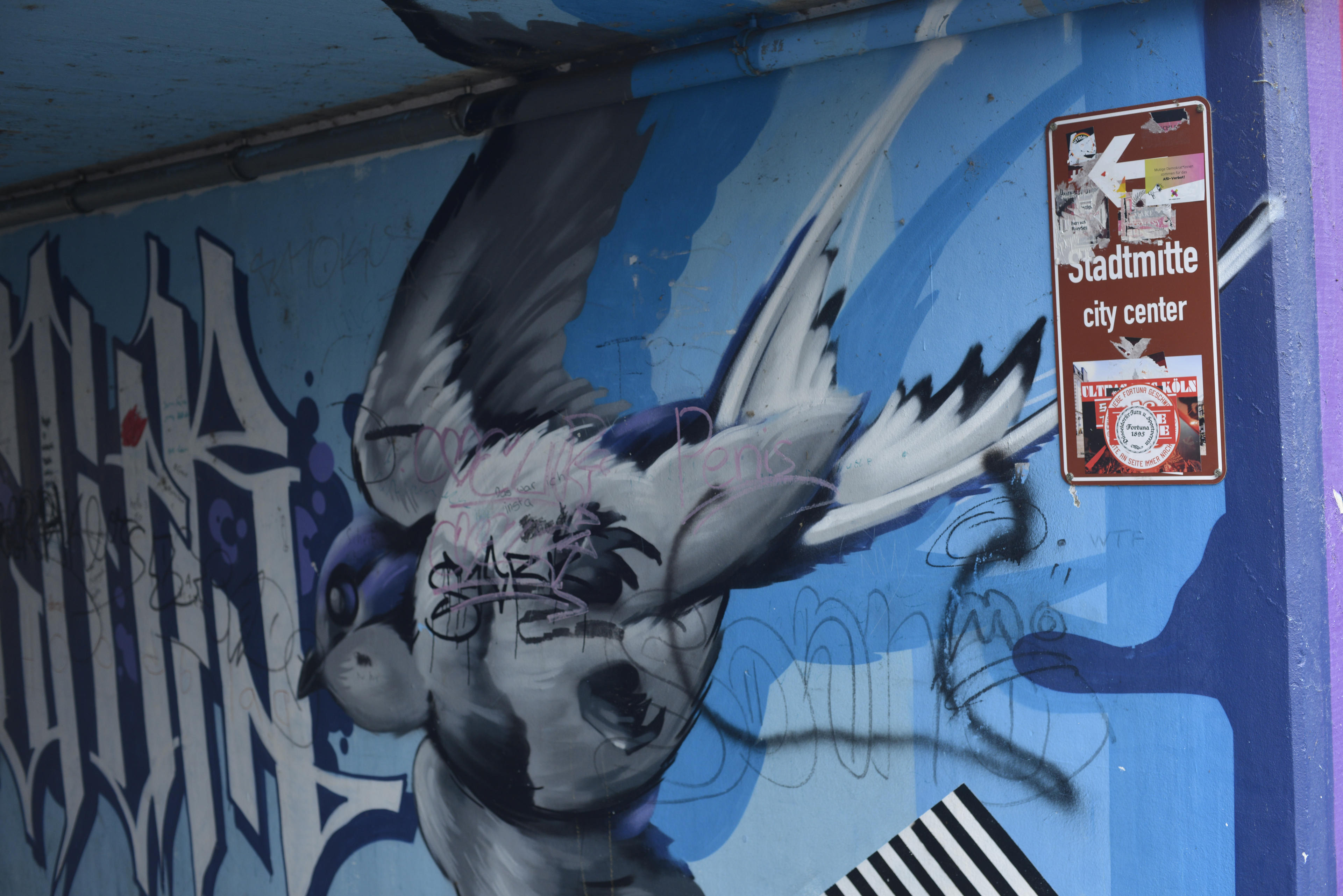 Zurück zum Auto ging es dann durch die Unterführung. Bunt bemalt. Ist das eine sehr dicke Schwalbe? Sieht danach aus. Zurück am Auto schnell den Weg nach Vettelschoss gesucht, denn da wollten wir ja auch noch hin. Das war dann der eigentliche Weihnachtsmarkt des Tages, denn da ging richtig die Post ab. Ist ja mitlerweile auch über die Grenzen RLPs hinaus bekannt. Ich mein, der WDR hat sogar drüber berichtet. (Dieses Jahr weiß ich nicht, seit die Sat-Antenne ausgefallen ist, können wir ja nur noch Streamen und da läuft meist der Kölner Regionalteil.) Jedenfalls, es gibt noch mehr Bilder von diesem Tag!