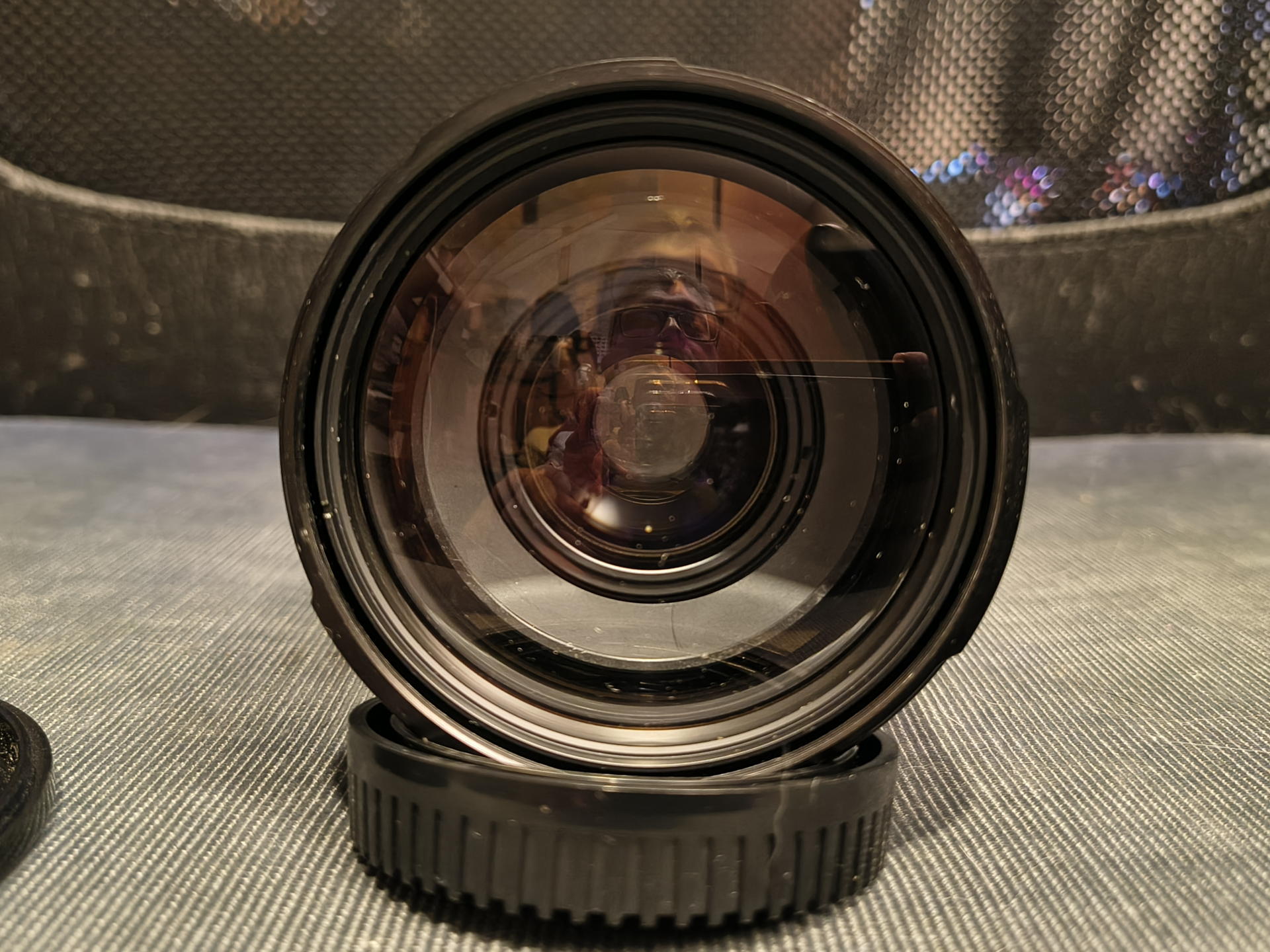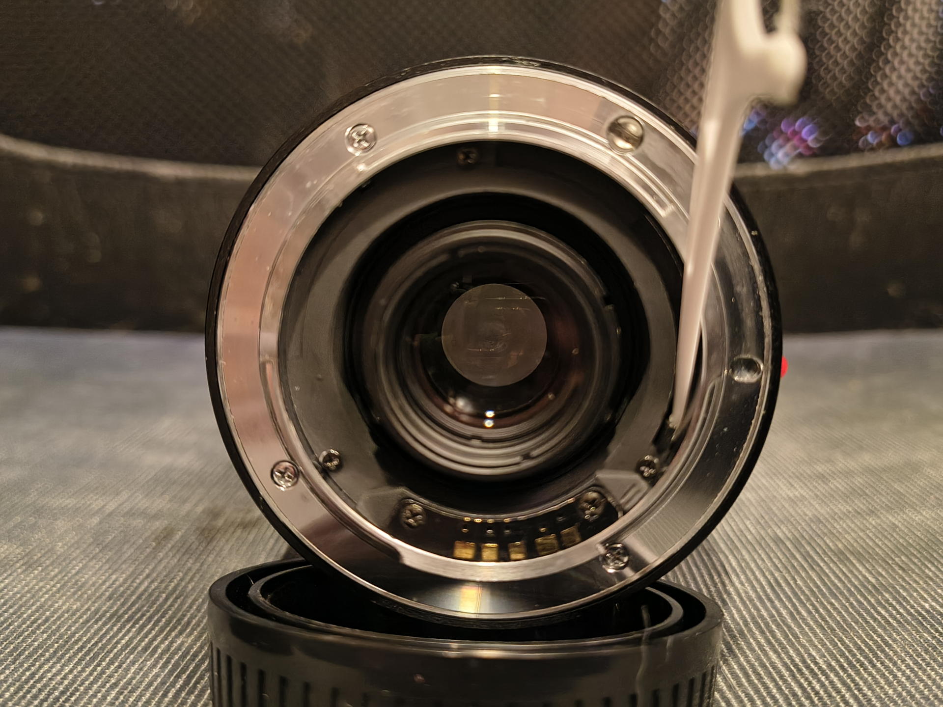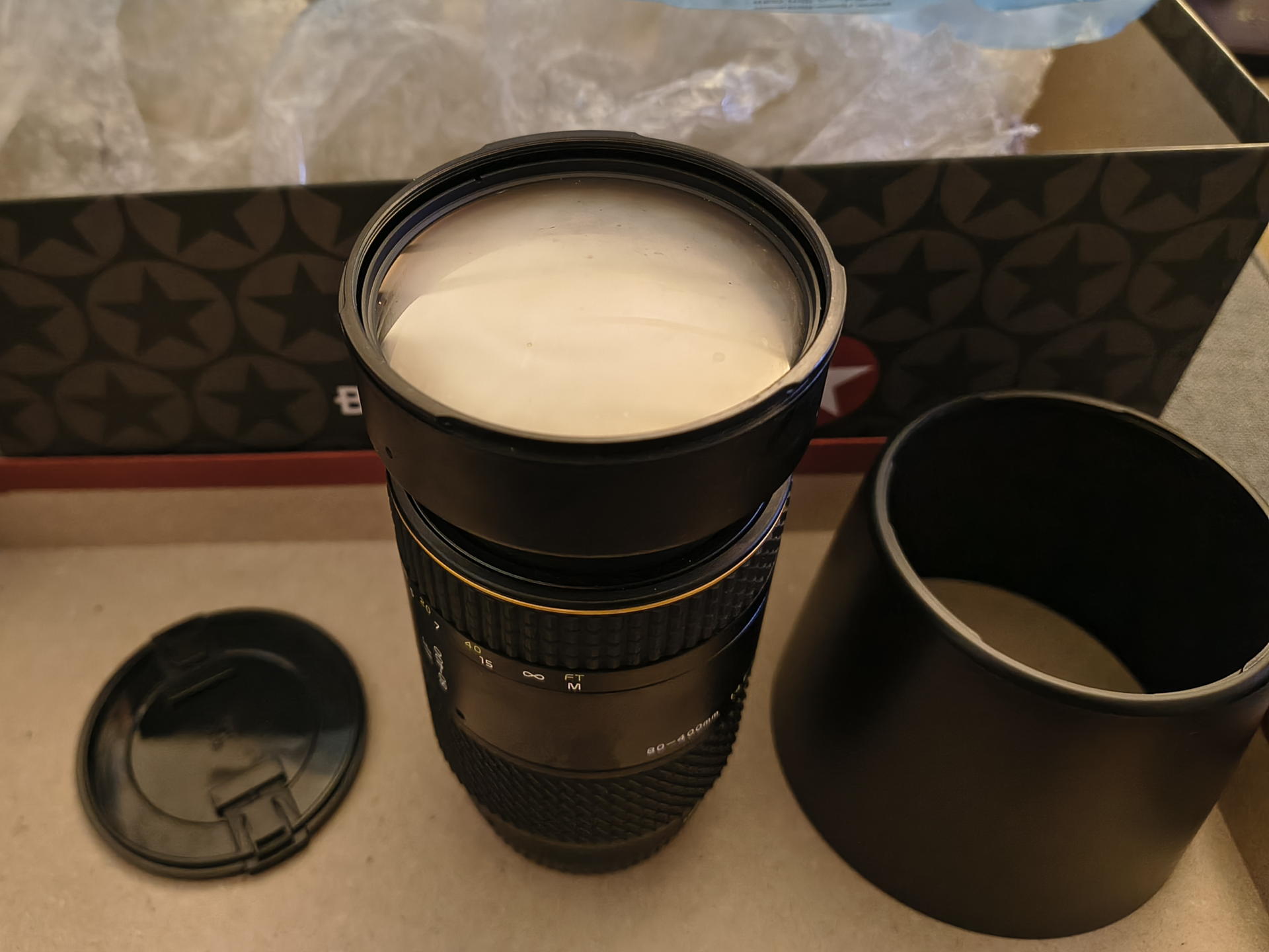 Nach dem Auspacken beschlug dann erst mal alles, was mit der warmen Heizungsluft in Berührung kam. Draußen war, wie gesagt, nass-kalt-novembrig. Aber so konnte ich direkt schon mal sehen, dass da keine Kratzer auf der Frontlinse sind! Immerhin schon mal ein guter erster Eindruck. Insgesamt sieht der ganze Tubus ziemlich unbenutzt aus, nur an den Schraublöchern fehlt ein wenig Lack. Für ein Teil, dass so mindestens 25 Jahre alt ist, nicht schlecht! (Eher mehr: Ich weiß ja nicht, wie viele davon in Minolta AF gebaut wurden, aber die Seriennummer mit 177 klingt niedrig!) (Das ist übrigens nicht die spätere D Version, die wohl für digitale Kameras optimiert wurde. Meiner Erfahrung nach bedeutet das aber meist eh nur, dass das Marketing da einen neuen Buchstaben hat drauf drucken lassen, ansonsten aber nur marginale Änderungen vorgenommen wurden - etwa eine neue Vergütung o.Ä. und vor allem mehr Plastik.
