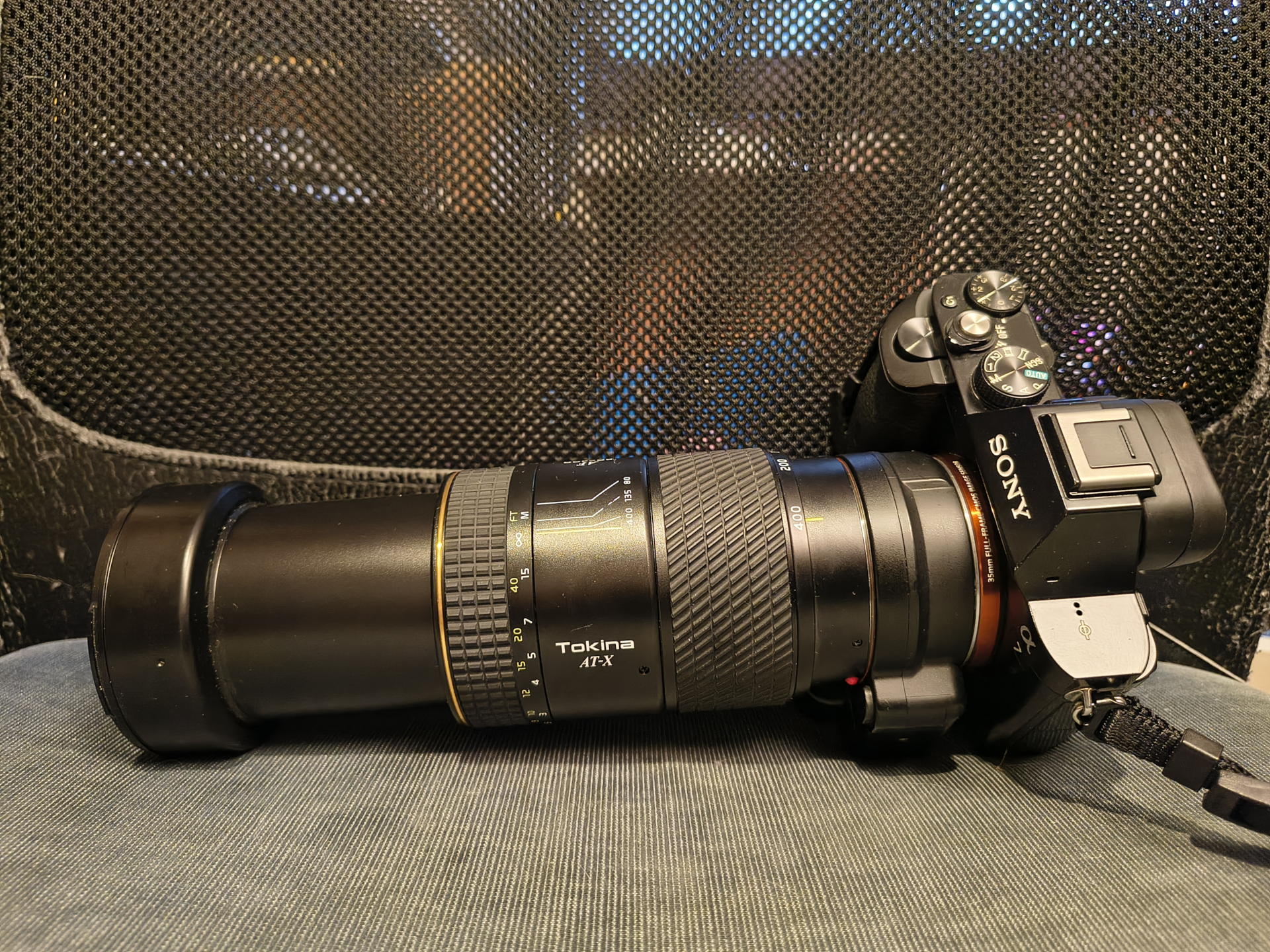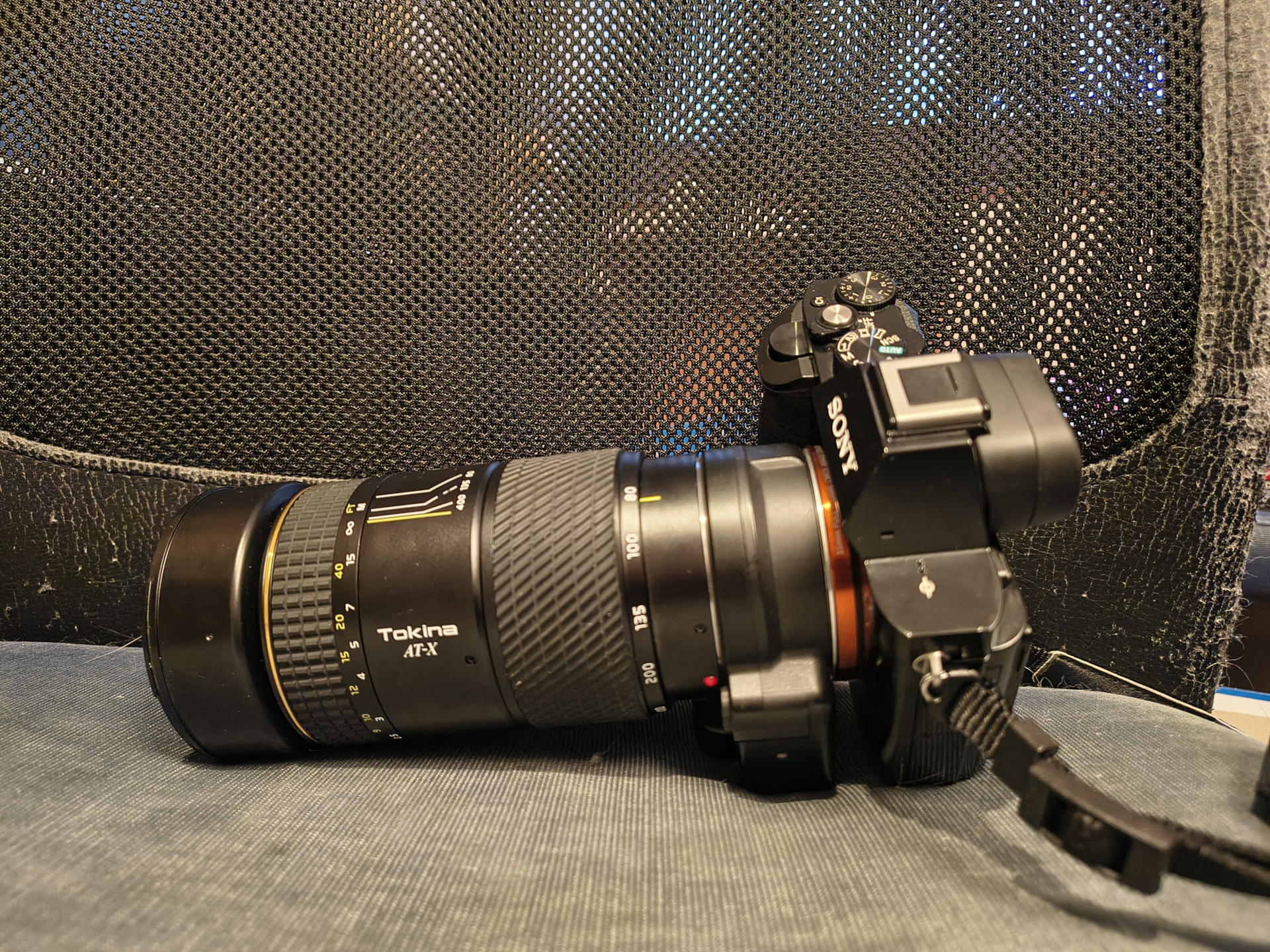 Dass dieses Objektiv noch aus der guten alten Zeit stammt, merkt man übrigens schon, bevor man es auspackt: Es wiegt bestimmt über einem Kilo. Bei 16 Linsen, die da in 10 Gruppen drin stecken sollen, kein Wunder, zusammen mit dem komplett in Metall gefertigten Tubus. Macht aber auch Sinn, das viele Metall: Bei dem Gewicht der Linsen würde Plastik wahrscheinlich irgendwann aufgeben.) Dabei ist es trotzdem recht handlich. Wenn es denn dann auf der Kamera steckt, liegt der Schwerpunkt recht handlich im Adapter bzw kurz davor - Die Alpha 7 ist ja doch sehr leicht. Da ist es schade, dass es keinen Stativ-Sockel hat. (Ich dachte ja, der Verkäufer hätte den einfach nicht mehr wieder gefunden und es deshalb ohne verkauft, aber scheinbar gab es wohl nie einen. Muss ich mal gucken, ob ich da was Passendes auf dem Gebrauchtmarkt finde.)