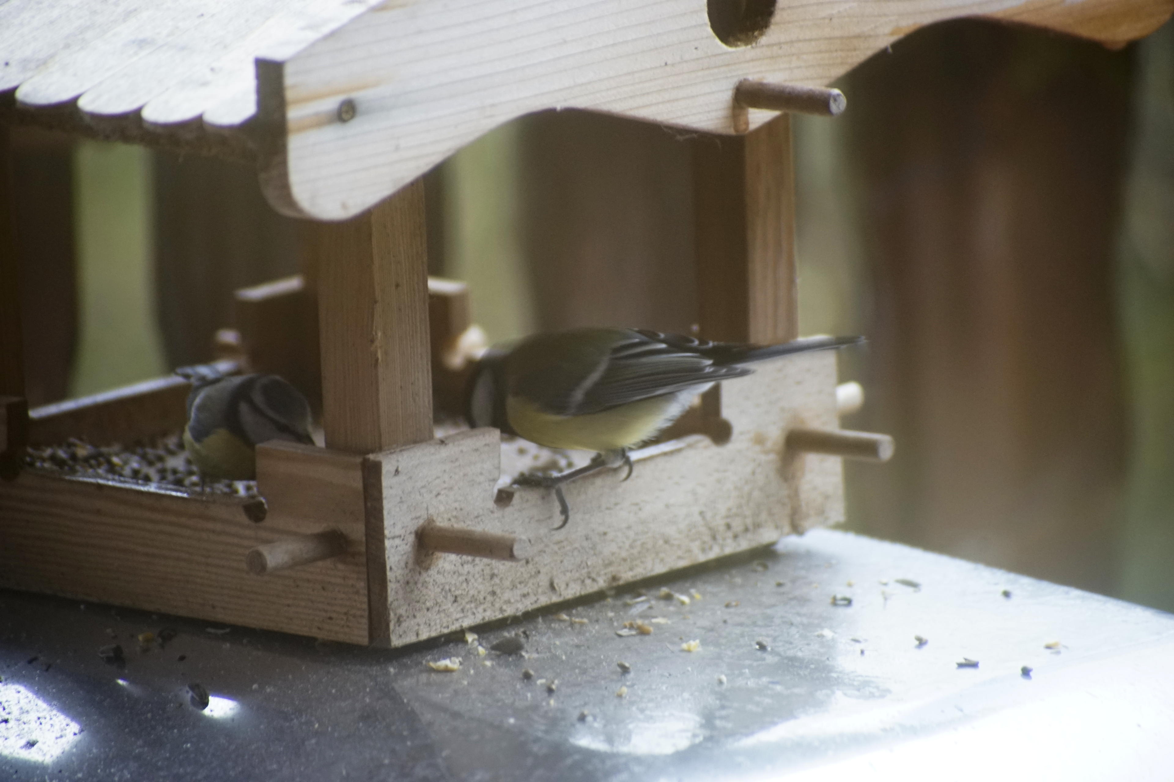 ) Dass die Bilder so matschig und kontrastproblematisch aussehen, liegt allerdings eher an der schmutzigen Verandatür mit Dreifachverglasung, durch die ich hindurch geschossen habe. Trotzdem sind die Meisen erstaunlich brauchbar geworden. Ich muss allerdings auf jeden Fall den Fokus in der Kamera noch genau justieren, denn auf diese Entfernung und bei dieser Brennweite ist selbst bei einem Weitoffen von f/5,6 bereits jeder Millimeter zu viel!