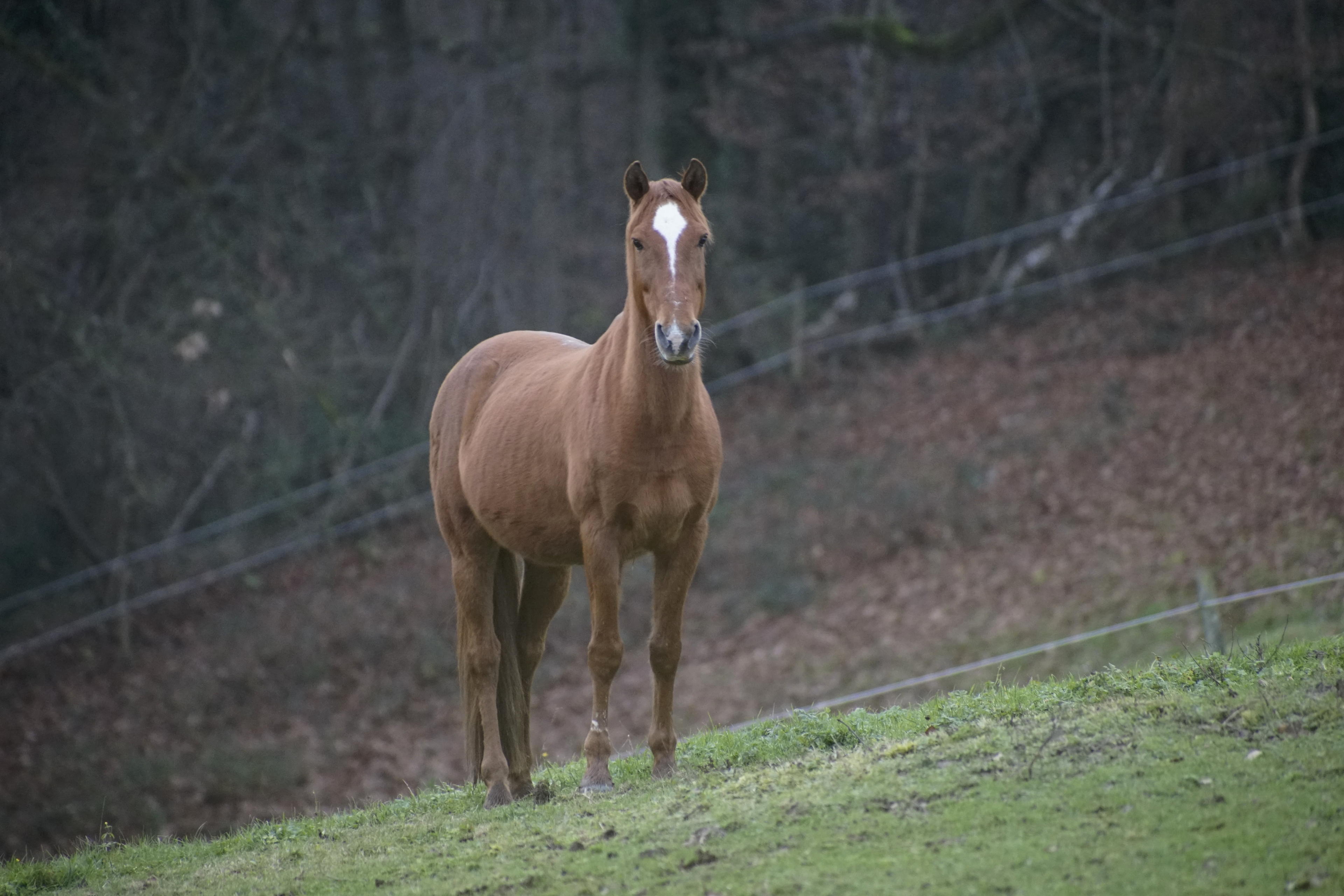 Habe dann den Kandidaten, den ich oben nicht eingebunden hatte, aber trotzdem mal frontal genommen, weil das alte Herbstlaub dahinter so schön usncharf wird. Zwar musste ich auch hier auf 3200 hoch - wie gesagt, das Pferd stand dann doch sehr weit unten hinter Bäumen Richtung unten -, aber eigentlich geht das noch ganz gut. Der Sensor der Alpha 7 ist sooo schlecht ja nun auch wieder nicht, die Probleme liegen wohl eher in der Signalverarbeitung und den daraus resultierenden Artefakten.