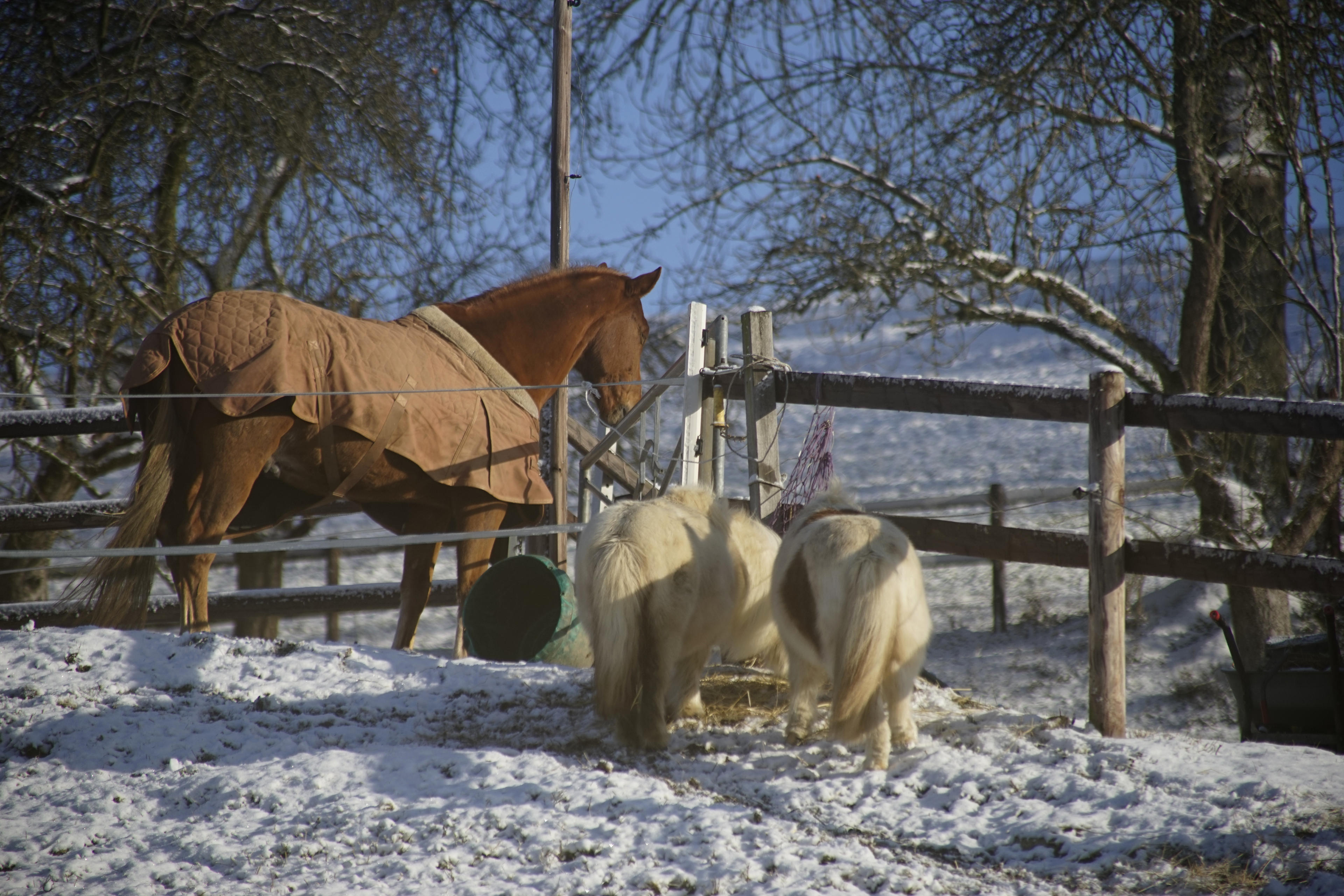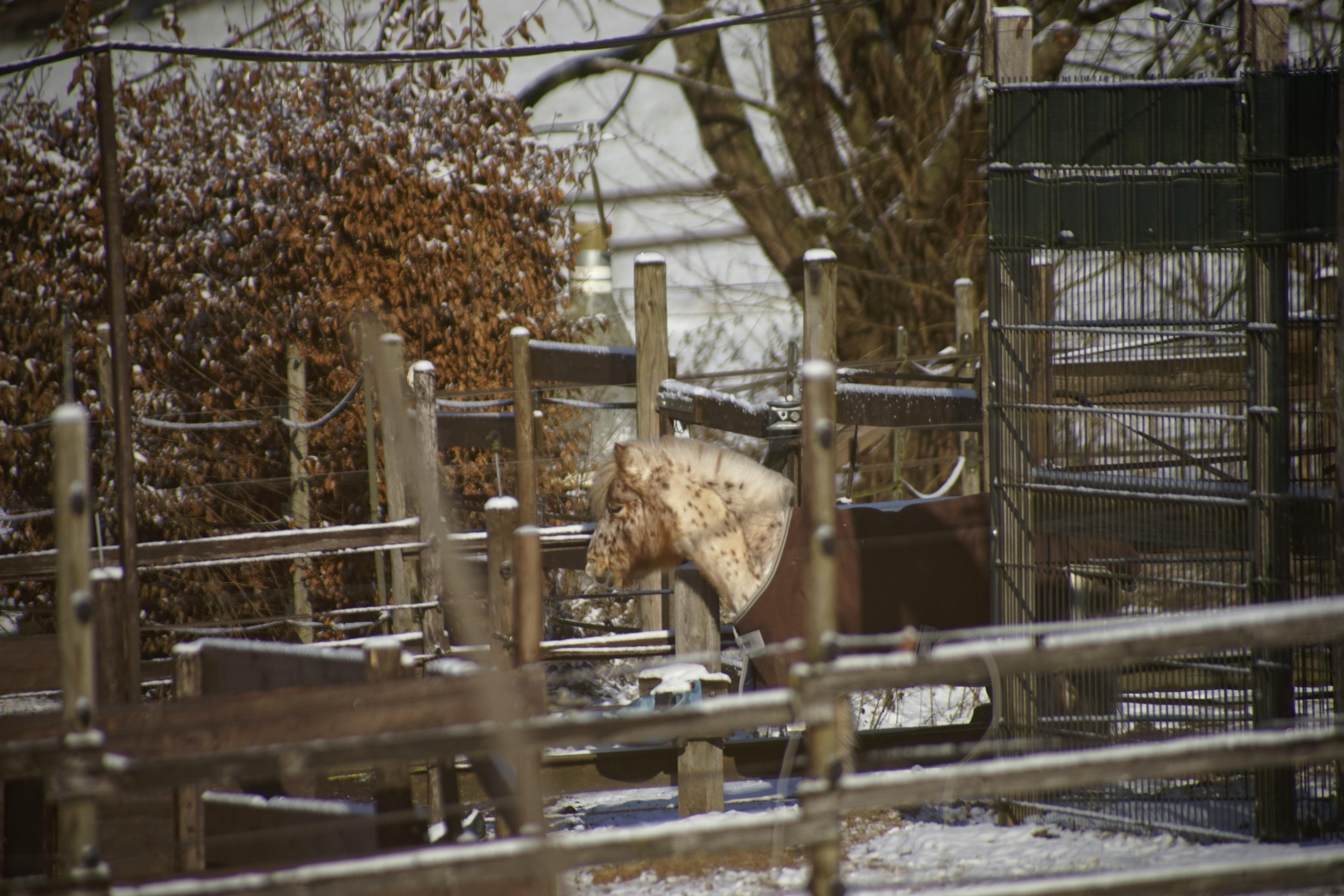 Jedenfalls. Ich habe meine D800 geschnappt, das 400mm Sigma drauf geschraubt und bin los, raus in die Welt und mal schauen, was ich alles vor die Linse bekomme. Wie immer sind da eher abstrakte Dinge dabei, wie der Haken an der Plane über den Anhänger unten am Ende der Straße. Oder seltsame Dinge wie die Rolle mit dem Schlauch drauf. Aber hauptsächlich habe ich versucht, die ersten Boten des Frühlings einzufangen: zB trauen sich die Pferde langsam wieder aus ihrem Unterstand heraus, es scheint also nicht mehr arschkalt zu sein, sondern nur noch kalt. (Also, damals, am 24. Zwischendrin haben wir ja wieder Schnee und Frost gehabt.)