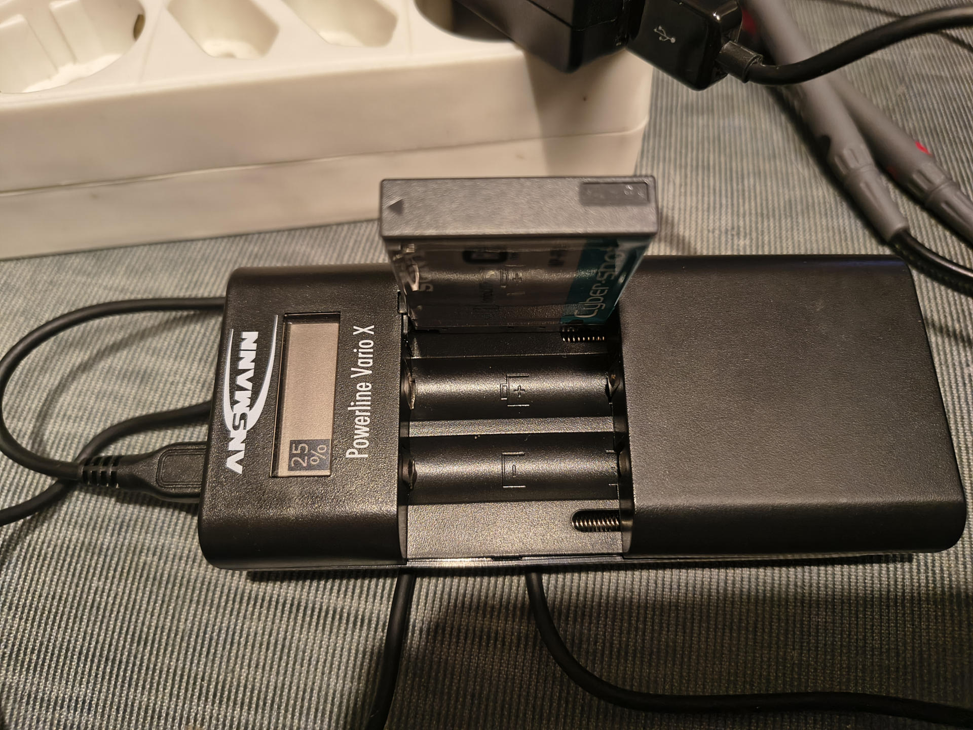 Also, was tun? Logisch schließend ging ich davon aus, dass der Akku zumindest die normale Abschalt-Restspannung haben sollte, damit das Ladegerät ihn überhaupt als solchen erkennt. Also habe ich mir was zusammen macgyvert: Das Li-Ion-Ladegerät für die CR2 genommen, ein bisschen Kabel, das ich hier eh abisoliert rum liegen hatte, da rein gefummelt, das ganze mit dem Messgerät verbunden und erst mal Spannung gemessen: 3,66V kommen da raus. Das klingt korrekt. Dann mit den beiden Messgerät-Sonden ran an die Akkukontakte, Augen zu und durch! (Vorher mit Edding die Plus- und Minus-Kontakte extra auf der Rückseite auch noch markiert, damit es da auf keinen Fall zu Verwechselungen kommt!) Erst Mal nur ganz kurz und den Ausschlag des Messgeräts beachtet, welches bei Kontakt von 3,6 auf unter 3,1 Volt fiel. Also irgendein Strom geht da rein in den Akku. Das ganze zwei, drei Mal wiederholt und sowohl die Temperatur von Akku und Ladegerät unter Kontrolle gehalten. Wie gesagt, ich habe mir jetzt kein "teures" Ladegerät gekauft, um dann selber die Bude abzufackeln! (LIEBE KINDER: NICHT NACHMACHEN! AKKUS BRENNEN UND EXPLODIEREN, WENN SIE FALSCH BEHANDELT WERDEN!) Nach etwa einer halben Minute zeigte das Ladegerät dann schon 3,15V an, nach zwei war die Spannung auf 3,2V gestiegen und auch, wenn ich die Steckdosenleiste abgestellt habe, blieb die Spannung, die der Akku jetzt abgab, einigermaßen stabil. An dieser Stelle schnell in das Ansmann-Gerät eingelegt und siehe da: Akku erkannt, wird geladen!