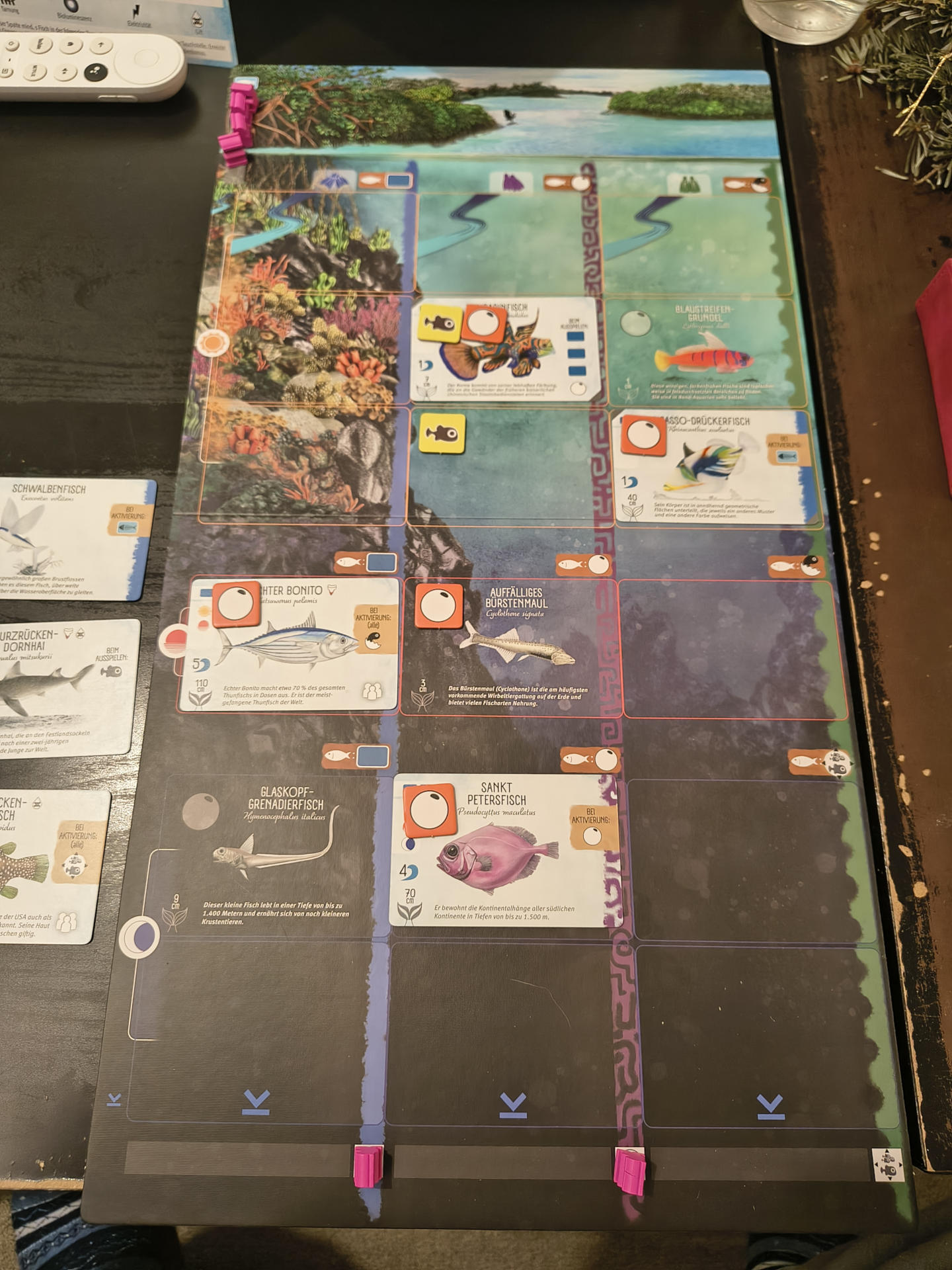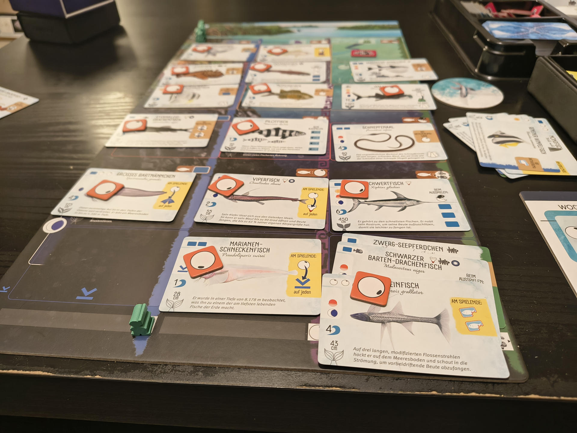 Dann spielt man ähnlich dem bekannten Spielprinzip Fische in diese jeweiligen Zonen, wobei kleinere Fische von größeren überdeckt werden können, wenn einem der Platz ausgeht bzw. man einfach einen viel viel besseren Fisch auf der Hand hat, den man unbedingt los werden möchte. Manchen brauche Eier, manche manche fressen Jungfische, wenn man sie ausspielt, manche können nur in ein bestimmtes Habitat gelegt werden - was wir beim ersten Playtrough mal wieder nicht geschnallt haben, siehe Bild drei, wo ein auf der rechten Seite blau berandeter Freiwasserfisch im Kelpwald liegt. Viele kann man aber auch einfach überall hin spielen. Um Fische zu spielen, Eier zu legen und diese schlüpfen zu lassen, führt man Tauchgänge in den entsprechenden Habitaten durch. Möchte man zB einen neuen Fisch auslegen, taucht man im Riff und für jedes bereits von einem Fisch belegte Habitat in dieser Zone darf man einen Fisch spielen, unter Beachtung der entsprechenden Karten-Voraussetzungen. Ebenso kann man in der Freiwasserzone Eier legen lassen und im Kelpwald vorhandene Eier schlüpfen lassen. Dabei ist zu beachten, dass - sobald sich drei Jungfische auf einem Feld treffen - sich diese zu einem Schwarm vereinen. Schwärme bringen zusätzliche Punkte oder sind ebenfalls für seltene, große Räuber eine Vorbedingung (Futter).