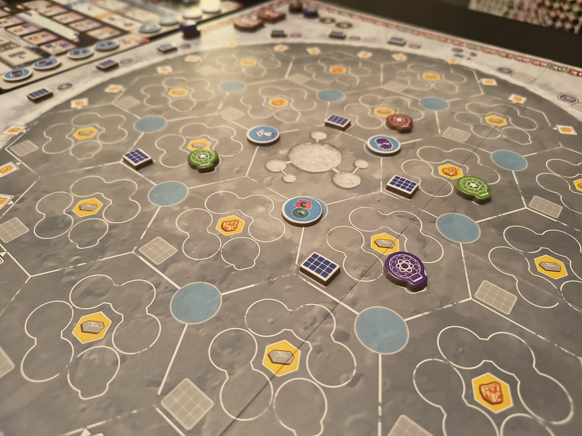 Shackelton ist also durch und durch ein kapitalistisches Spiel mit Space-Setting: Am Ende gewinnt, wer den meisten Gewinn (auf der Siegpunktleiste) gemacht hat. Aber wir sind noch nicht mal am Anfang, ganz im Gegenteil: Hat man die Corporations aufgedeckt, wird das Setup des Kraters vollendet, soll heißen: Rund um das zentrale Hex in der Mitte des Plans werden (bei nur zwei der maximal vier möglichen Spieler) zwei "neutrale" Habitate platziert und natürlich die der beiden Spieler. Jedes der Hexes hat dabei mittig das Symbol für "Titan" oder "Seltene Erden", die beiden Ressourcen des Spiels. Jedes Starthabitat bekommt außerdem einen Sonnenkollektor, rund um die zentrale Station werden zudem die Startplättchen der sponsornden Firmen auf die "Kreuzungen" ausgelegt - also so, dass je drei Hexes an diese angrenzen. Dann werden (n+1) - in unserem Fall also drei - Transportfähren gezogen, auf denen die aktuelle Lieferung an Astronauten und Ressourcen aufgezeichnet sind. Jeder Spieler entscheidet sich für eine und die übrig gebliebene geht ins Lunar Gateway, von wo sie später über eine bestimmte Aktion abgerufen werden können.