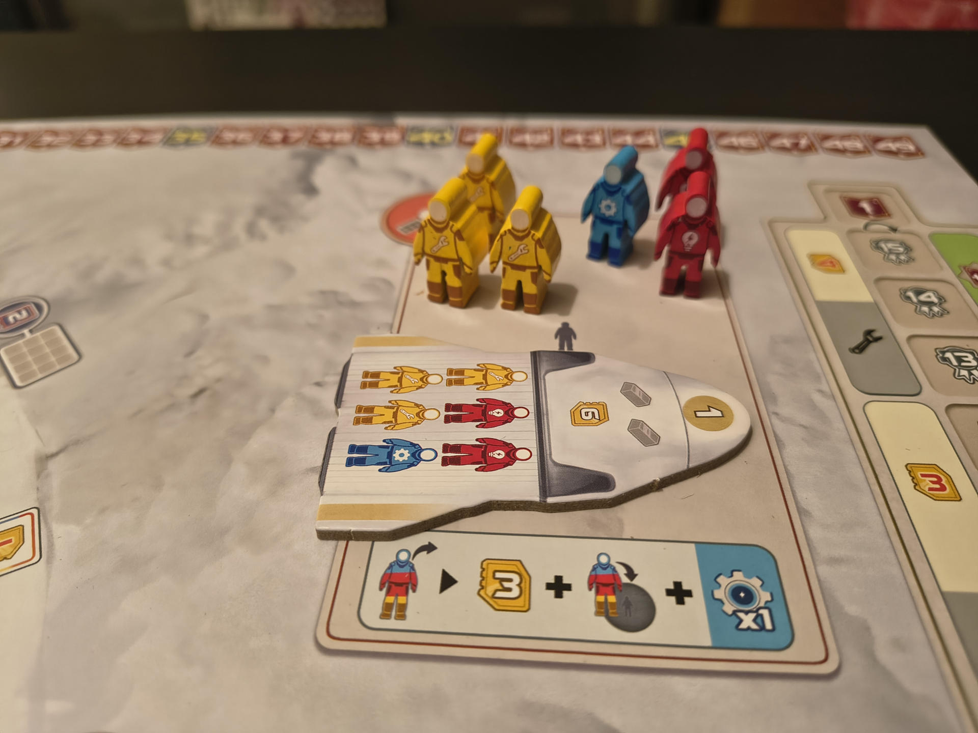 Und dann geht es auch schon los. Im Großen und Ganzen gibt es nur drei verschiedene Aktionen, die ein Spieler machen kann, die er durch das Einsetzen seiner Astronauten aktiviert: Auf dem Plan kann er entweder mit gelben Astronauten nach Bodenschätzen graben, die sich entlang eines gerade Pfades von seinem Startpunkt aus befinden. Jedes bebaute Hex wirft Ertrag ab, aber Achtung: Hat man auf diesem Hex selber nicht das größte Gebäude, muss man seinen Mitspieler bezahlen! Setzt man hingegen einen blauen Astronauten aus, erhält man die Ressourcen auf den blauen Firmen-Tokens an den Kreuzungen der Hexes. (Im Einführungsspiel sind dies Helium, Touristen-Astronauten oder Forschungstokens.) Setzt man jedoch einen roten Astronauten ein, bekommt man einfach nur Geld. Was auch hilfreich sein kann, wenn man mal wieder total pleite ist. So eine Mondbasis ist im Unterhalt nämlich recht teuer und so muss man nach jeder der Runden einen Upkeep/Maintenance zahlen, je nach Menge und Größe an Gebäuden, die man besitzt. Astronauten im Krater werden übrigens am Ende der Runde in die Basis einziehen - je nachdem, wer die Mehrheit an Gebäuden in dieser Reihe hat - und dadurch weitere Vorteile generieren! Etwa sind gelbe Astronauten im obersten Labor (den zweiteiligen Habitaten) gut, um die Wartungskosten zu verringern!