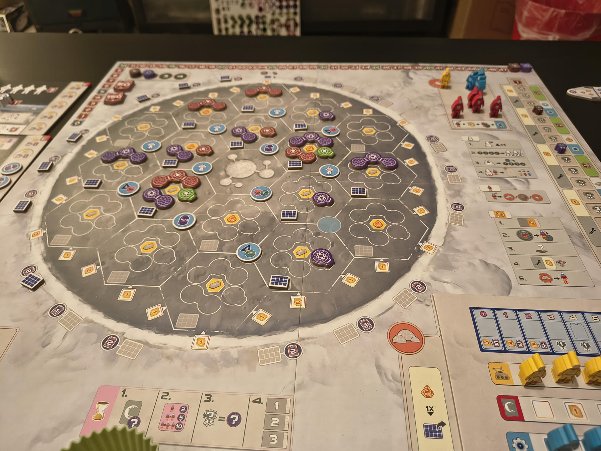 Für wen ist das Spiel was? Spieler, die gerne komplexe Aufgaben lösen und mit Worker Placement vertraut sind. Zum Einstieg in das Thema ist es glaube ich etwas zu kompliziert, da sollte man mit einfacheren Spielen beginnen. Wer hingegen das Weltraumthema mag und gerne seine Arbeiter in die Wüste schickt, um gegen Fremen und Sandwürmer... nein, Moment, das ist ein anderes Spiel! :-D Aber ihr versteht, was ich meine! Dieses Spiel ist nicht einfach, aber abwechslungsreich und hat tolles, sehr knackig buntes Spielmaterial, das - obwohl größtenteils aus Pappe - eine gewisse Wertigkeit hat. Die verschiedenen Konzerne sorgen für Abwechslung, die unterschiedlichen Gebäudetypen bringen sehr unterschiedliche Boni. Alles in allem ein sehr komplexes und kopflastiges Spiel. Wer lieber aus dem Bauch heraus spielt, sollte vielleicht etwas anderes zuerst testen. Wer sich Worker Placement auskennt und gerne drei Schritte im Voraus plant, kann zugreifen, muss sich aber auf ein recht langes Einlesen in die Betriebsanleitung gefasst machen.