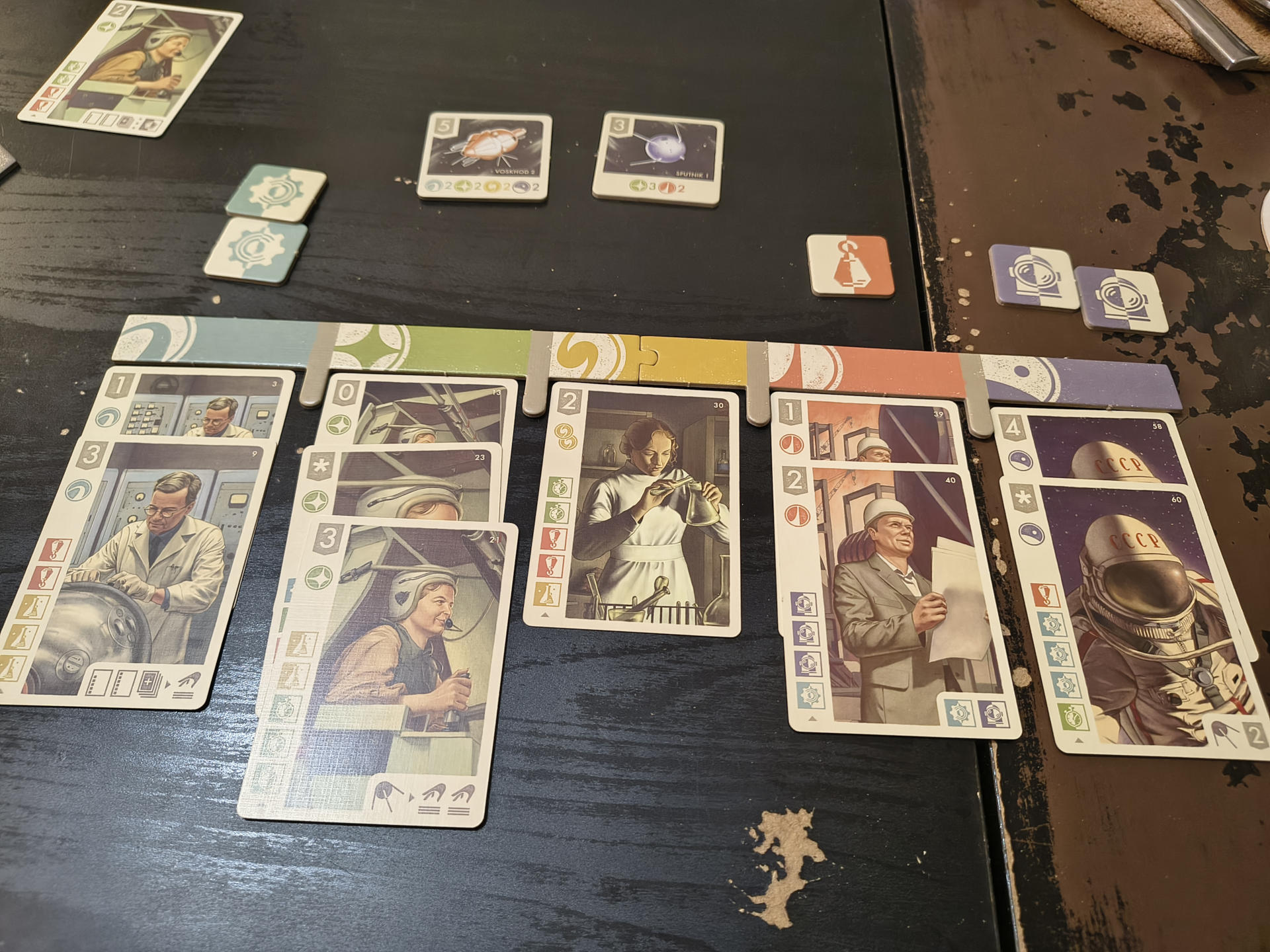 Jeder Experte bringt mindestens ein Symbol oben links unter der Punktzahl, die er wert ist, mit. Dieses gibt den Bereich an, in dem dieser arbeitet und in welches Feld er gelegt werden muss. (Es gibt Experten mit unterschiedlichen Symbolen, bei denen man sich dann entscheiden kann, wohin man ihn oder sie spielt.) Hat man genügend dieser Symbole gesammelt, kann man im Weltraum-Wettrennen ein entsprechendes Projekt realisieren, welches einem zusätzliche Punkte bringt. (Hier im Beispiel etwas die Voyager-Sonde (Grand Tour des Sonnensystems, amerikanisch) für 3x blau, 2x grün und 2x rot oder Voskhod (Erster Außenbord-Einsatz eines Kosmonauten, sowjetisch) für je 2x blau, grün, gelb und lila. Wie man an dem Beispiel sehen kann, sind im Spiel sowohl die Kapitalisten als auch die Kommunisten vertreten, das Spiel modelliert eben genau das Wettrennen ins All, das während des kalten Krieges stattfand.)