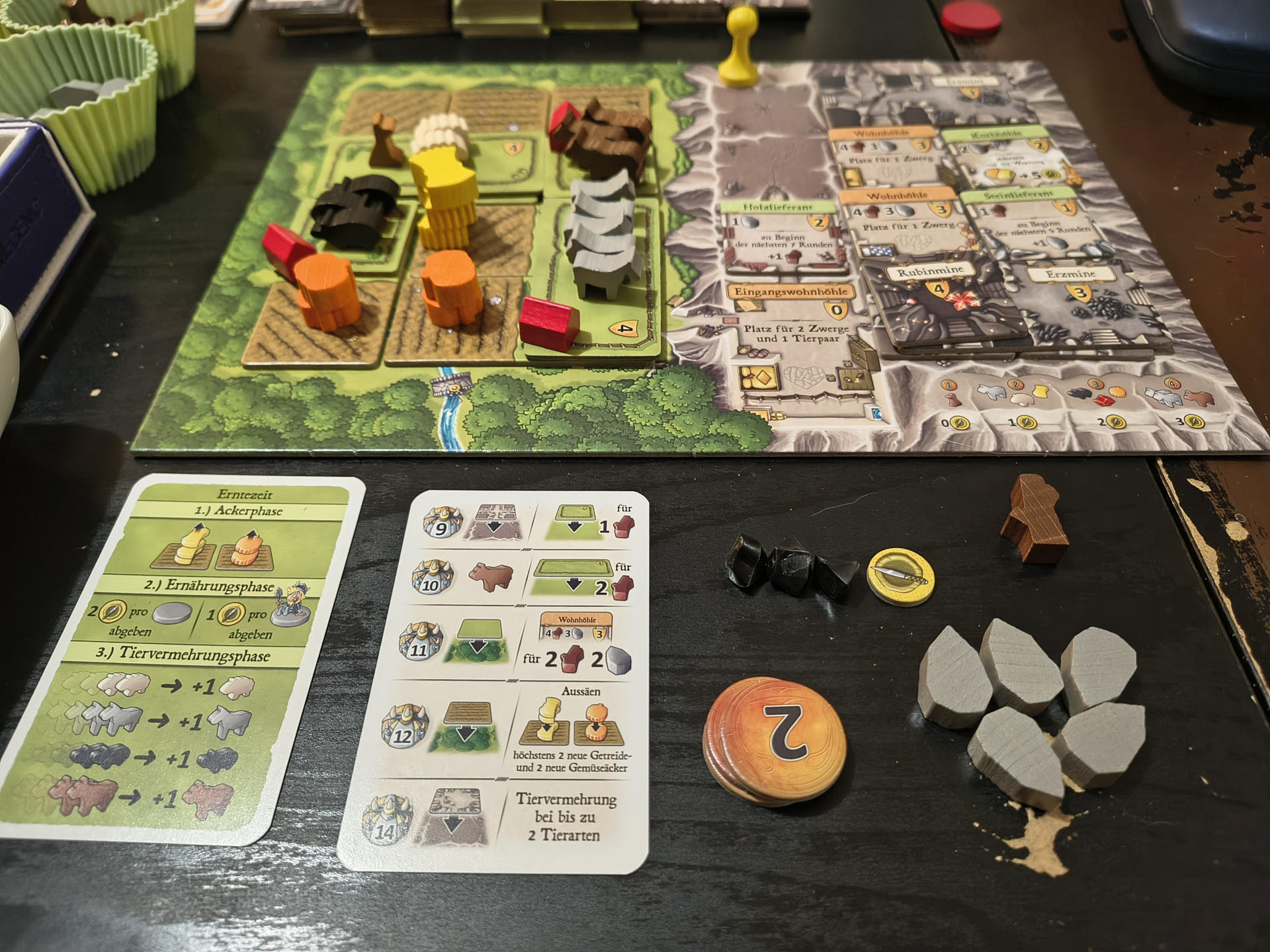 Man beginnt mit zwei Zwergen, die auf dem ausliegenden Plan verschiedene Aktionen durchführen können: Stollen und Höhlen bauen, Erz- und Rubin-Minen graben, den Wald roden, Äcker bewirtschaften und Weiden anlegen, Tiere züchten und, ganz wichtig, auf bewaffnet auf Streifzüge gehen, um das Umland zu erkunden und Loot nach Hause zu schleppen. Mit jeder Runde wird eine weitere Karte aufgedeckt, die die möglichen Aktionen erweitern. Zudem sammelt sich mit der Zeit, je länger die Karten nicht benutzt wurden, immer mehr Ressourcen auf diesen an. Wer geduldig ist, kann so richtig viel Holz oder Stein oder Erz abgreifen, aber wer zu lange wartet, dem wird einer seiner Gegenspieler irgendwann zuvorkommen und dann geht man erst Mal leer aus. Irgendwann keimt in der jungen Familie dann der Wunsch nach Nachkommen auf und man kann seine Zwerge vermehren. Aber Vorsicht: Am Ende der einzelnen Runden kommen immer öfter Ernte-Zeiten vor, in denen alle Zwerge in der Höhle auch etwas zu Essen haben müssen.