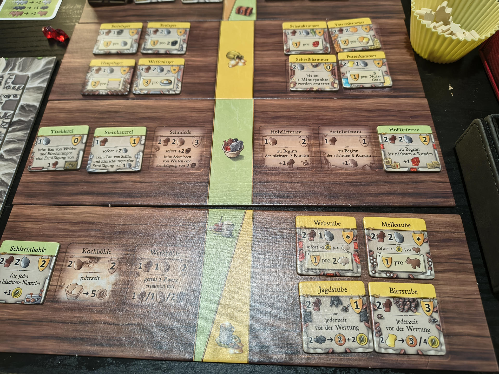 Was macht das Spiel also so schwer? Die Interaktionen zwischen den einzelnen Karten sind am Anfang einigermaßen schwer zu durchschauen, die allgemeine Komplexität ist bereits im Einführungsspiel mit einer geringeren Auswahl von Höhlen-Ausbaumöglichkeiten recht hoch, ganz zu schweigen vom ständigen Ressourcen-Mangel. Manche Nahrungsmittel und Tiere sind nur schwer über Streifzüge zu beschaffen, für die man seinen Zwerg auch erst mal in der Schmiede mit Waffen ausstatten muss. Und am Ende gibt es auch noch negative Punkte, wenn man nicht alle Felder seiner Höhle und seines Waldes mit Plättchen überdeckt hat oder Tiersorten fehlen. Es ist also einigermaßen kompliziert, den Überblick über alle seine Baustellen zu bewahren - wie im echten Leben. Zum Glück vermehren sich - Rosenberg-typisch - alle Tiere, von denen zwei am Ende einer Runde auf dem Plan sind, automatisch und deren Nährwert ist relativ hoch.