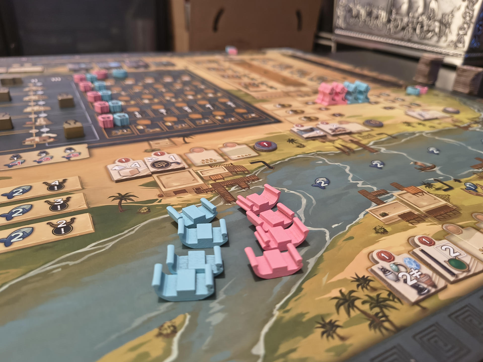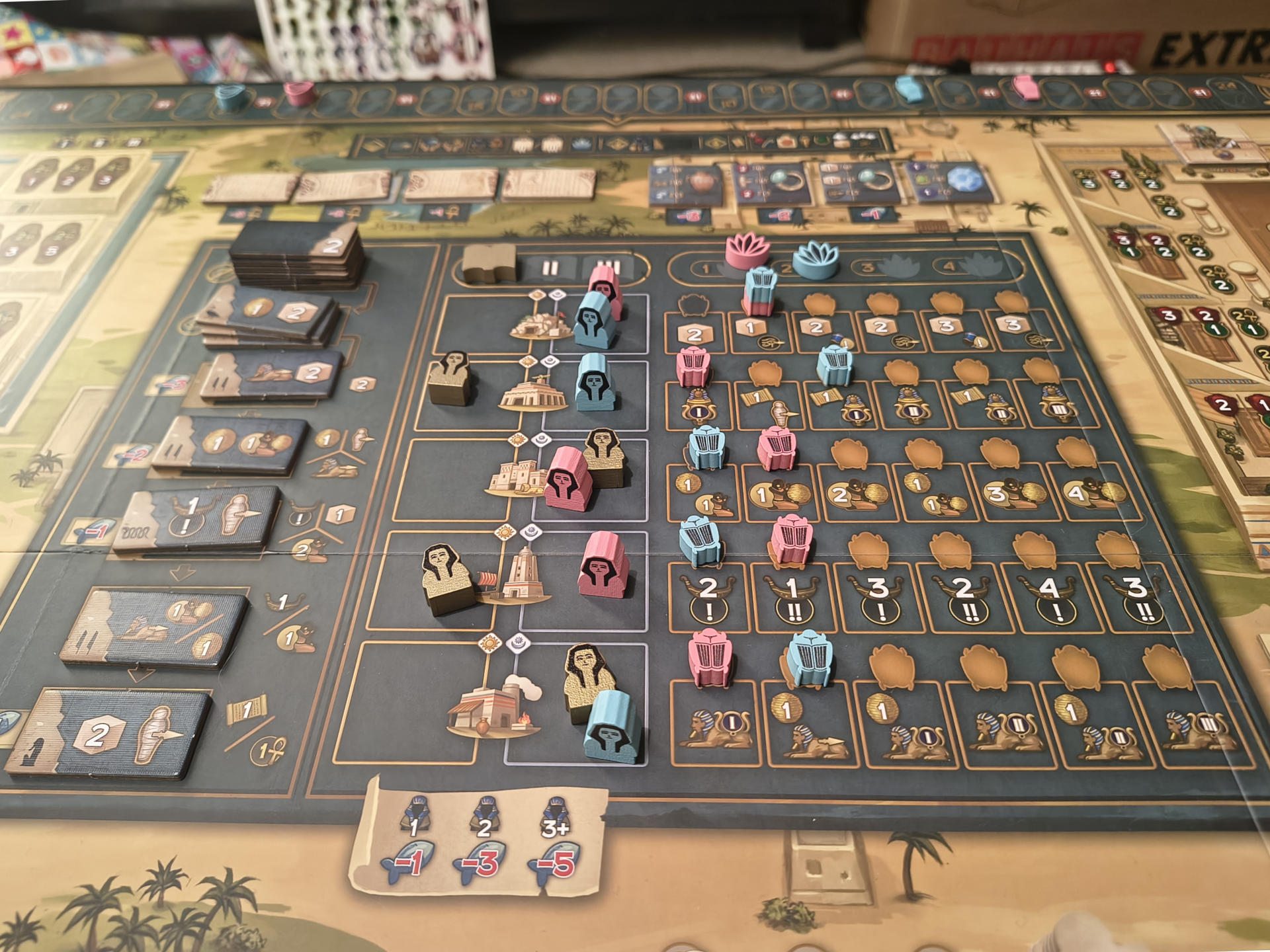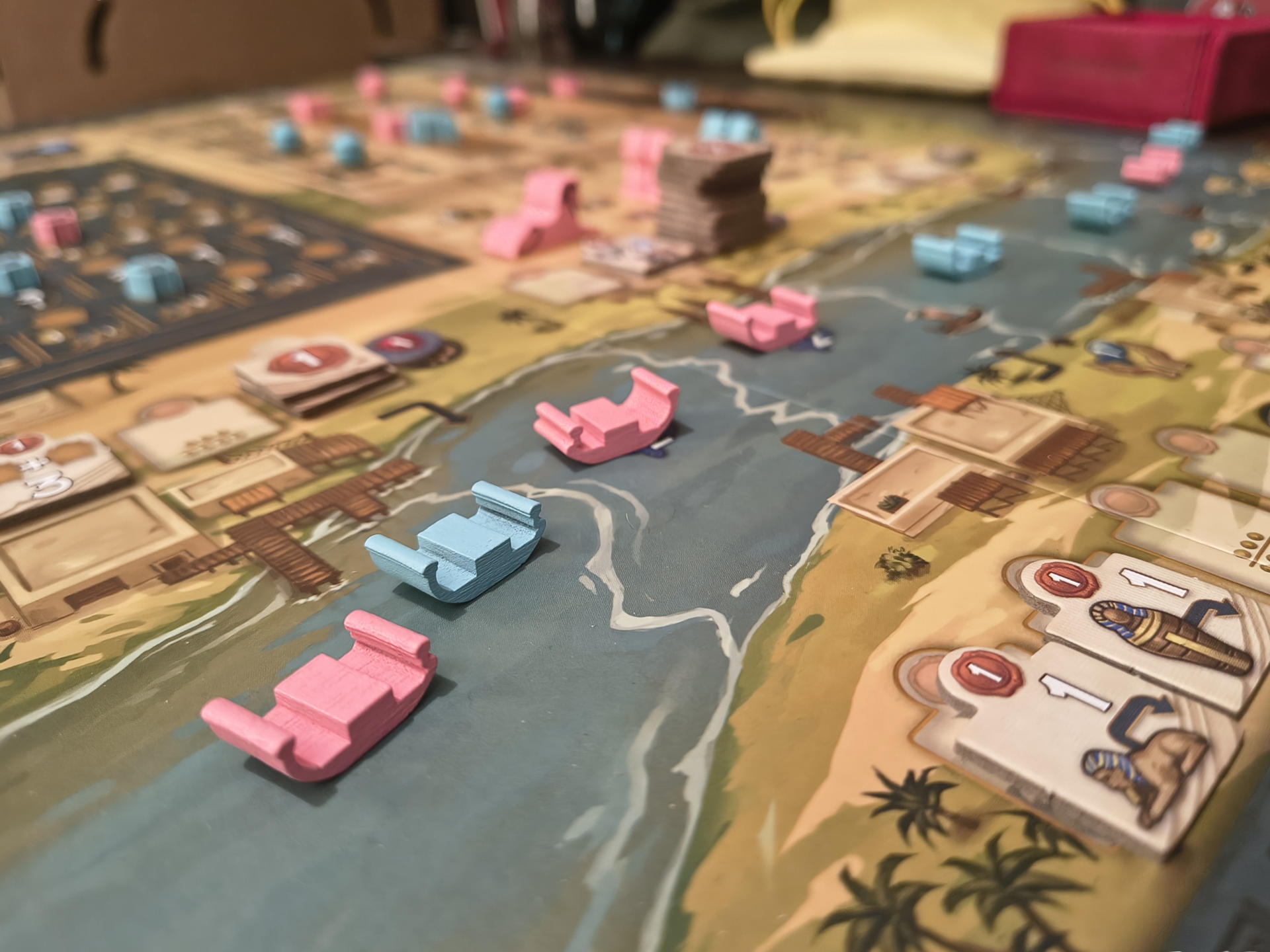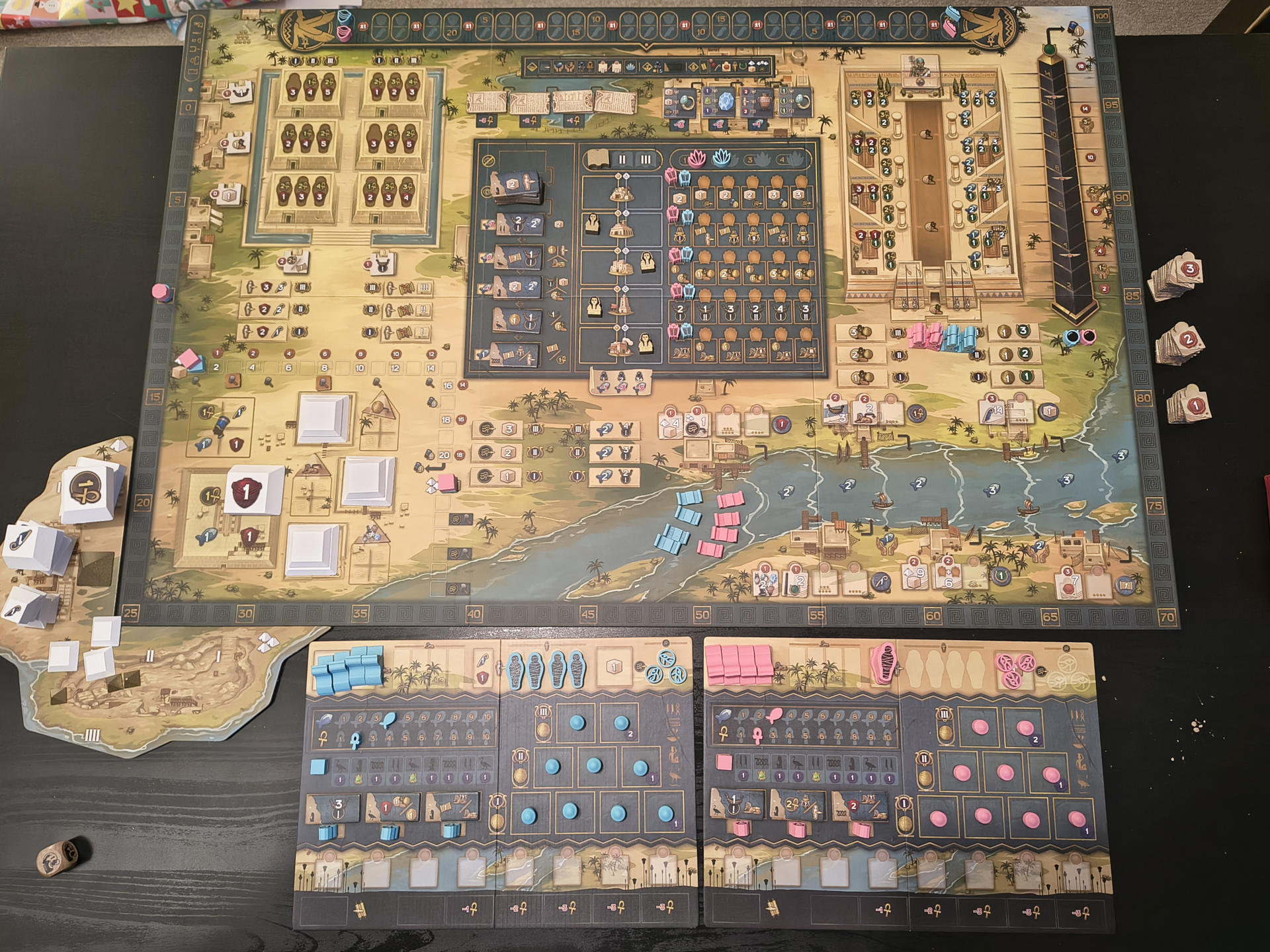 Die sekundären Aktionen enthalten diverse verschiedene Möglichkeiten: Man kann mit seinen Booten den Nil hinauf fahren und in den angrenzenden Städten Handelsverträge einsammeln oder fischen (Nahrung ist eine der "Währungen" oder Ressourcen im Spiel). Man kann an der großen Pyramide arbeiten und dadurch des Pharaos Gunst erwerben oder an den drei kleinen Königinnenpyramiden, die einem durch ein ausgeklügeltes Wertungssystem Punkte bringen. Man kann, wie gesagt, ein Sphinx meißeln oder diese aufstellen, wodurch man verschiedenste weitere Boni abgreifen kann. Genau so kann man eine Mumie in ihren Sarkophag legen und diesen dann schließlich in einer Mastaba bestatten, um direkte Vorteile abzugreifen und des Weiteren ebenfalls wieder in der Rundenwertung Punkte mitzunehmen. Schließlich kann man Waren erwerben und durch die Priesterin in den Tempel bringen lassen, wo sie der Stadtgottheit dargebracht werden. Oder man kann Papyri sammeln und an seinem Totenbuch schreiben. Das alles tut man hauptsächlich, um beim Wiegen von Herz und Maat im Jenseits nicht von Amet gefressen zu werden - spricht: Die hart erarbeiteten Punkte wieder abgeben zu müssen. Es gilt also, auf der Duat-Leiste Herz und Feder möglichst schnell aneinander vorbei bewegt zu bekommen, um stattdessen zusätzliche Punkte zu bekommen!