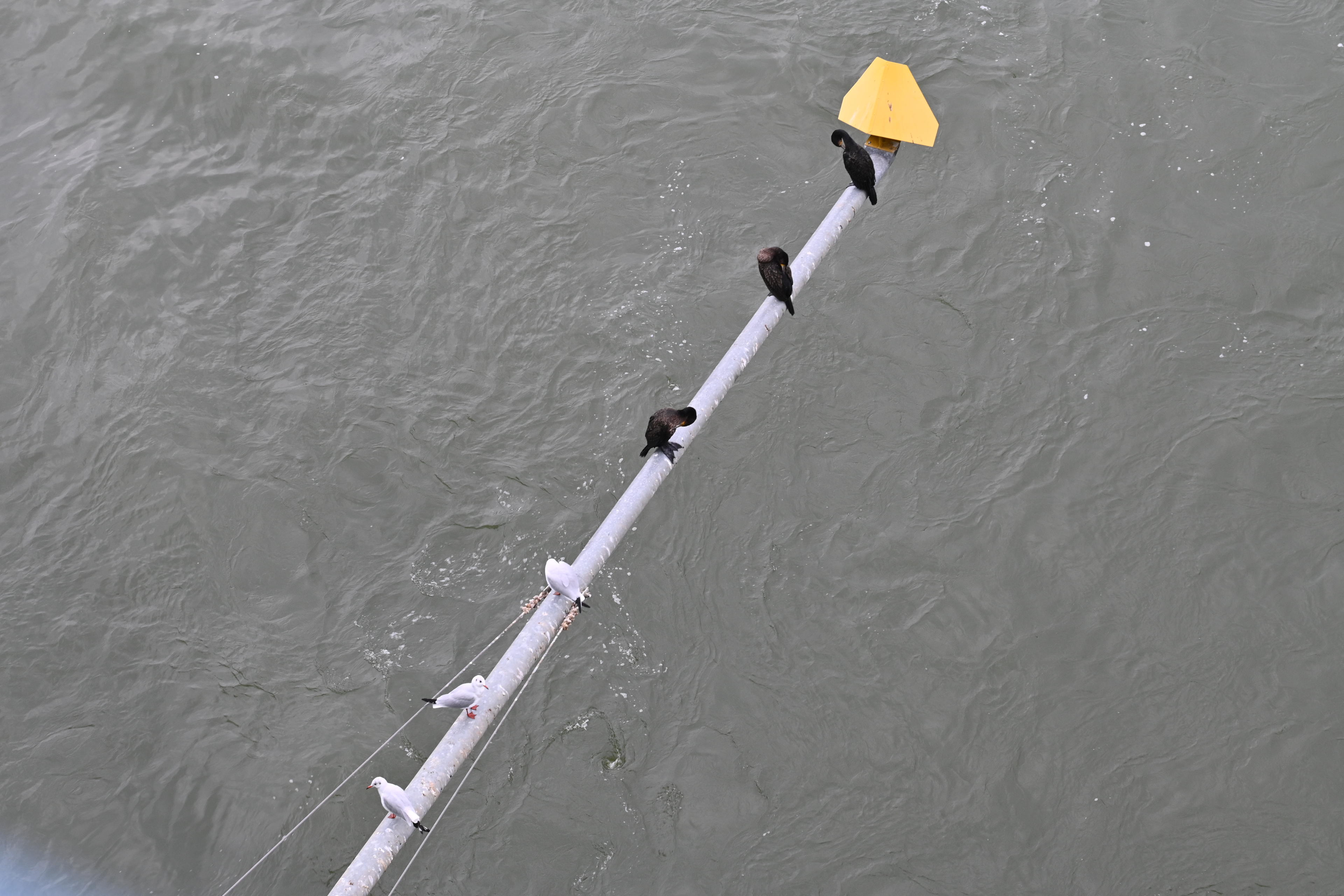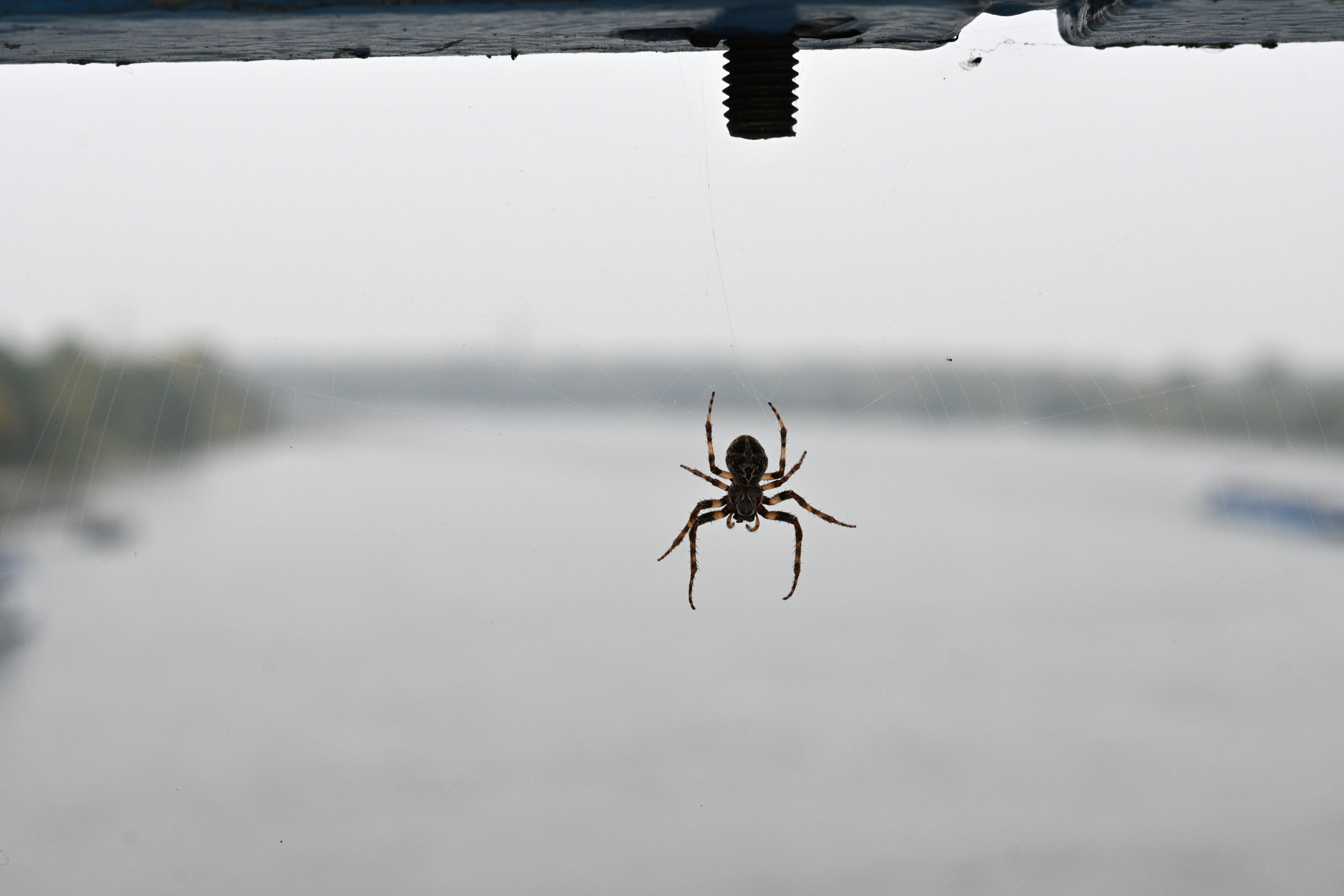 Die Brücke bietet überhaupt mal wieder interessante Motive. Gerade mit dieser Kamera/Objektiv-Kombination. Die Lampe und das Geländer hatte ich ja bestimmt schon mal hier drin, aber die Metallschienen am Übergang zwischen Brückenkopf und eigentlicher Brücke sollte neu sein in meiner Sammlung. Und der Mast mit dem PT drauf glaube ich auch. Außerdem leben da oben einige Viecher, so zum Beispiel die üblichen Kormorane, die heute Besuch von den Kollegen von der Möwenfraktion hatten. Und Spinnen. Mit extrem hübschem Muster. Ich find Spinnen ja total interessant, sorry an alle Arachnophoben. Ihr solltet den folgenden Bilderblock vielleicht überspringen!