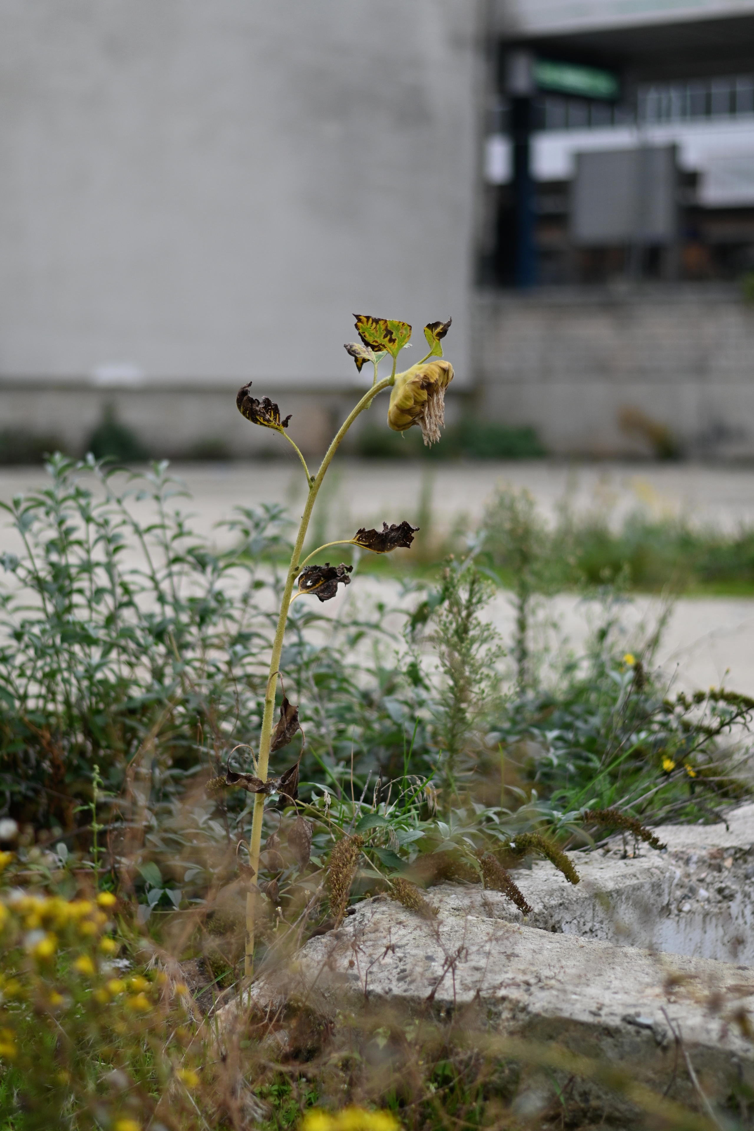 Naja, wahrscheinlich nicht. Aber auch egal: Da wir keine größeren Böcke mehr hatten, noch länger das schwere Spiel durch die Stadt zu schleppen, haben wir uns dann möglichst schnell durch den Keller des Bahnhofs gequetscht, um zum Japaner auf der anderen Seite zu gelangen. Da dann noch die Sonnenblume mitgenommen, die da zwischen dem Beton heraus brach.