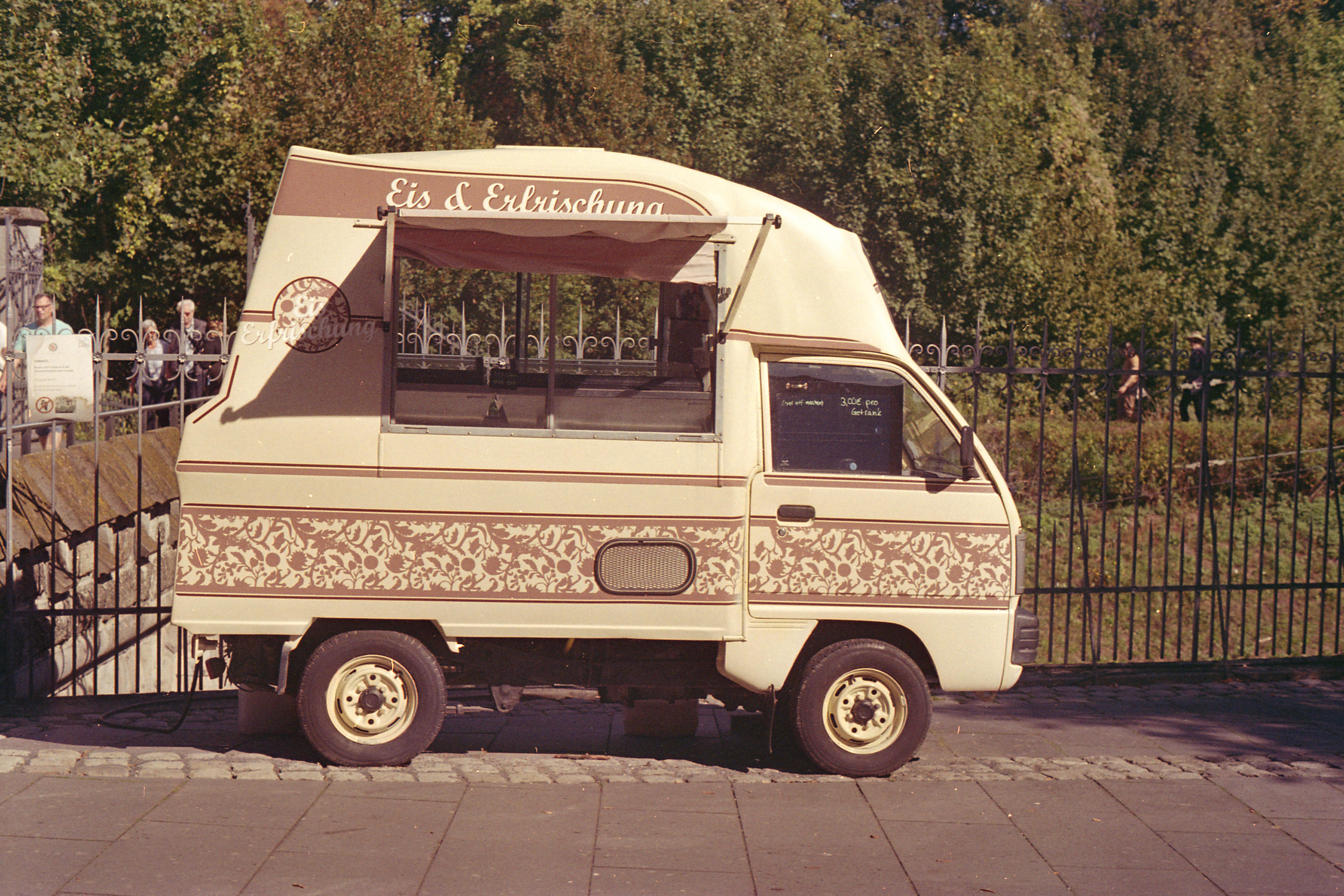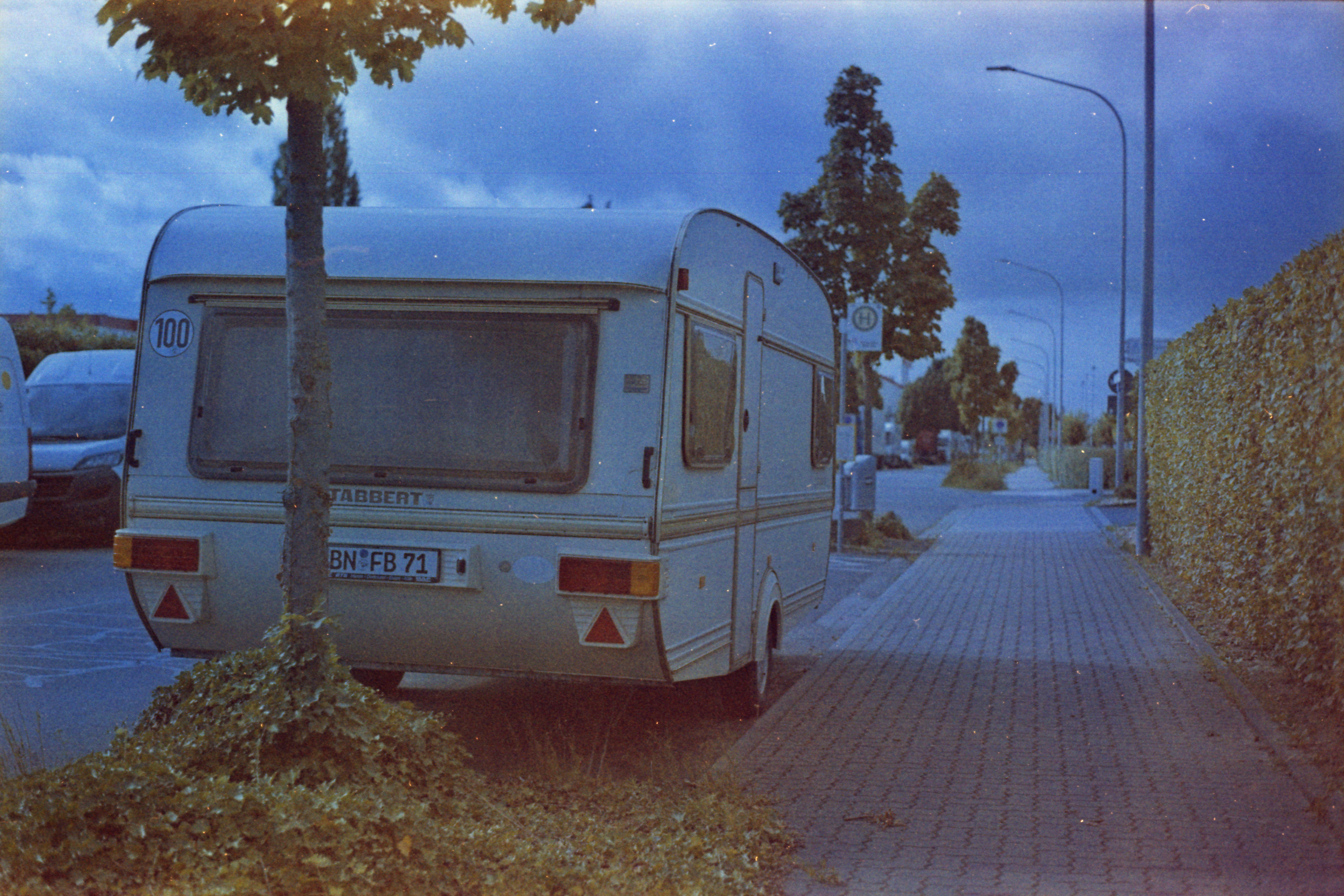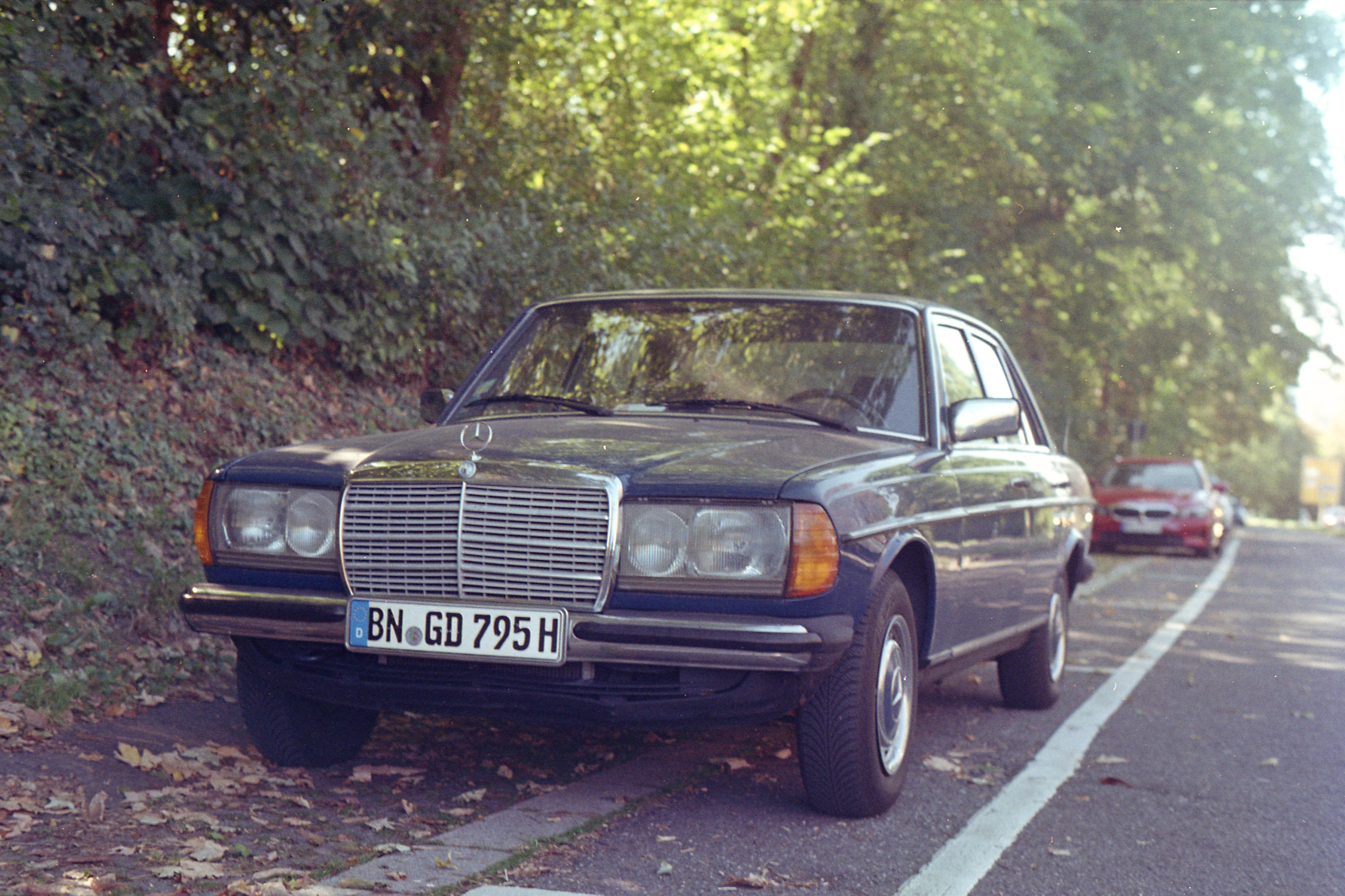 Und ganz zum Schluss, das tatsächlich letzte Foto auf dem Film: Ein alter Mercedes. (55mm, 1/60s, f/4.) Sowas sieht man ja nicht mehr allzu oft rum fahren. Schon ein seltsames Gefühl, wenn man zurück blickt und denkt: Joah, das waren die Autos meiner Jugend. Und jetzt gibt es die praktisch nicht mehr und alles sieht rund gelutscht und windschnittig aus oder ist ein SUV. Für mich ist das da ein normales Auto. Und die Blagen von heute werden das wahrscheinlich über diese angeblich so schrecklich verarbeiteten Teslas denken. Ob die noch in 40, 50 Jahren rum fahren werden? Ich glaube es nicht, dann ist deren Akku längst im Popo. Nicht, dass ich der Meinung wäre, dass wir alle weiter mit Benzin fahren müssen.
