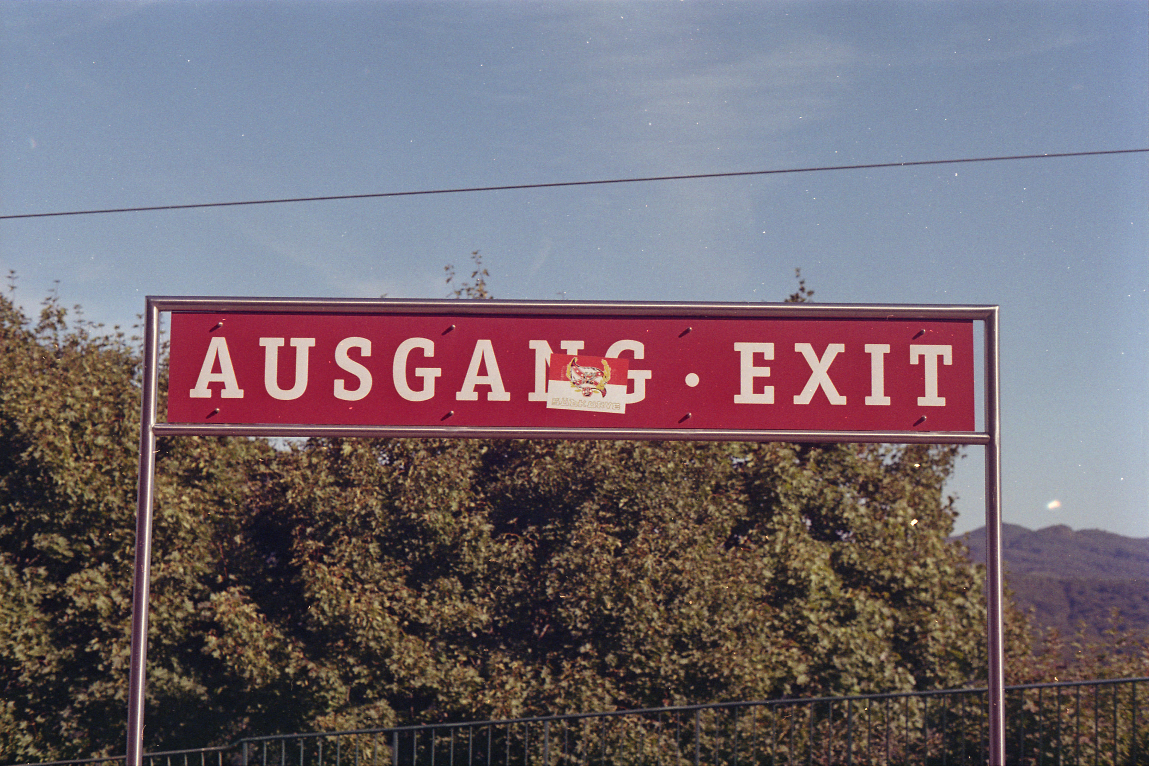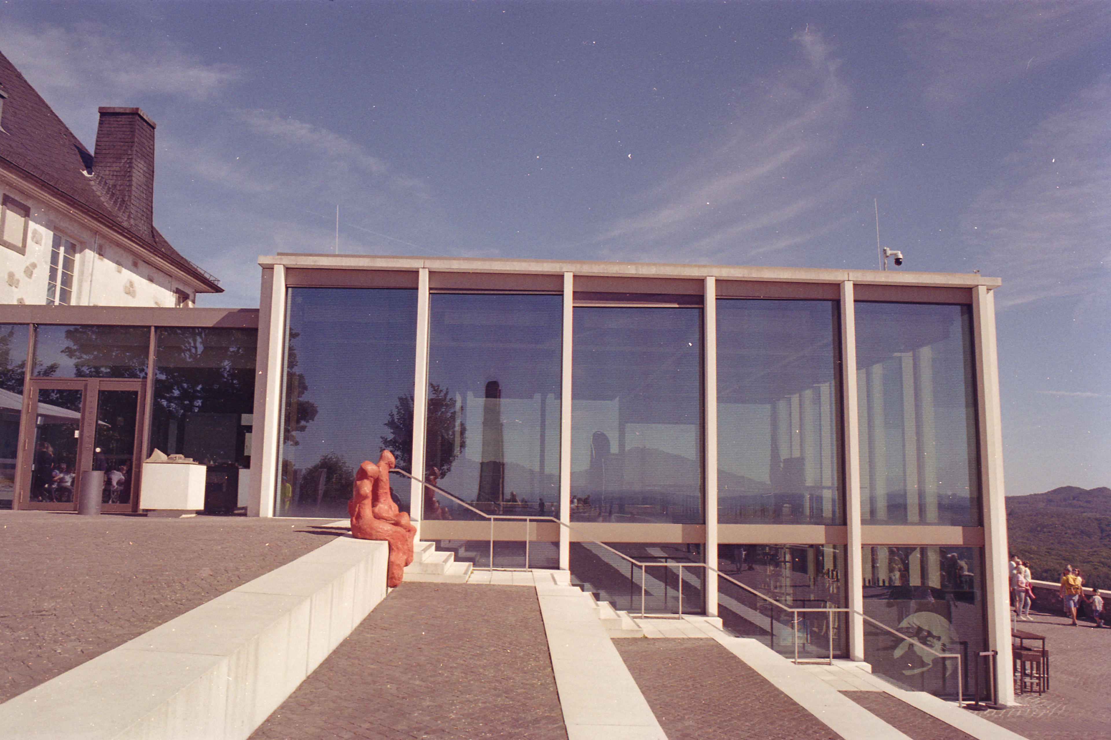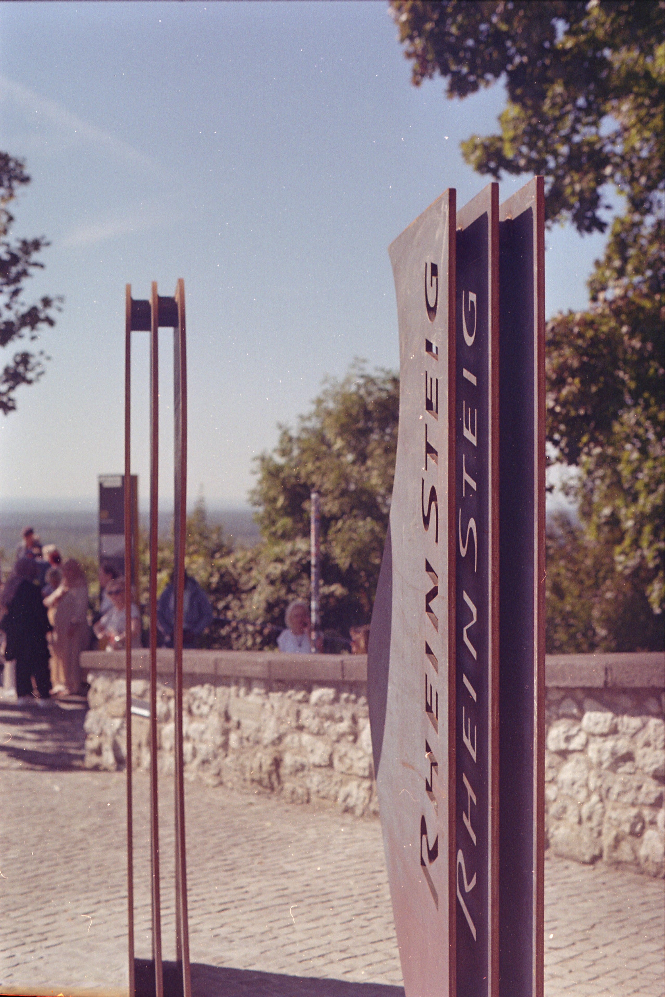 Bevor wir uns dann endgültig auf den Weg nach Unten gemacht haben, habe ich noch das knallrote Ausgangsschild mit genommen, das mit dem Aufkleber vom 1. FC. (55mm, 1/750s, f/5,6.) Einfach so als bunten Kontrapunkt. Was immer man über den Drachenfels sagen kann, viel Rot gibt es da oben auf dem Berg nicht. (Die "Two Forms" sind ja eher sehr orange.) Ansonsten ist das Bild allerdings eher langweilig, muss ich zugeben.
