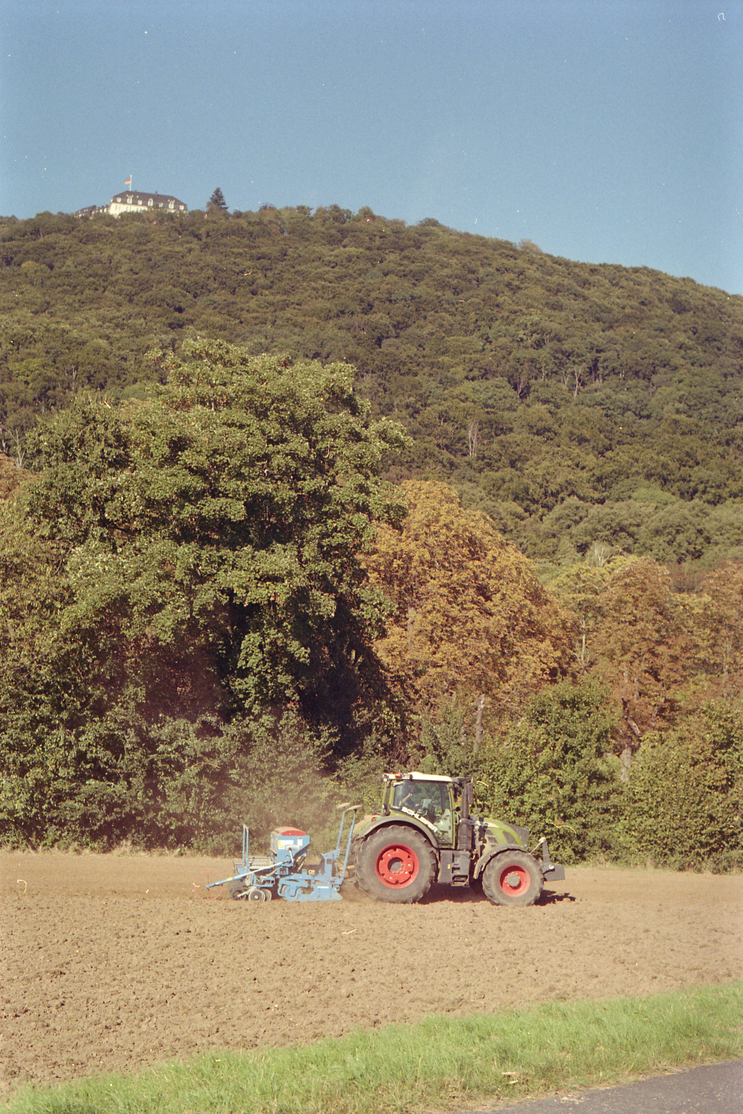 Als wir schon fast wieder am Parkplatz waren, kam der Bauer angestaubt, der gerade damit beschäftigt war sein Feld aufzulockern. (55mm, 1/375s, f/5,6.) Winkt der eigentlich? Oder hält der sein Handy hoch, um zurück zu schießen?!