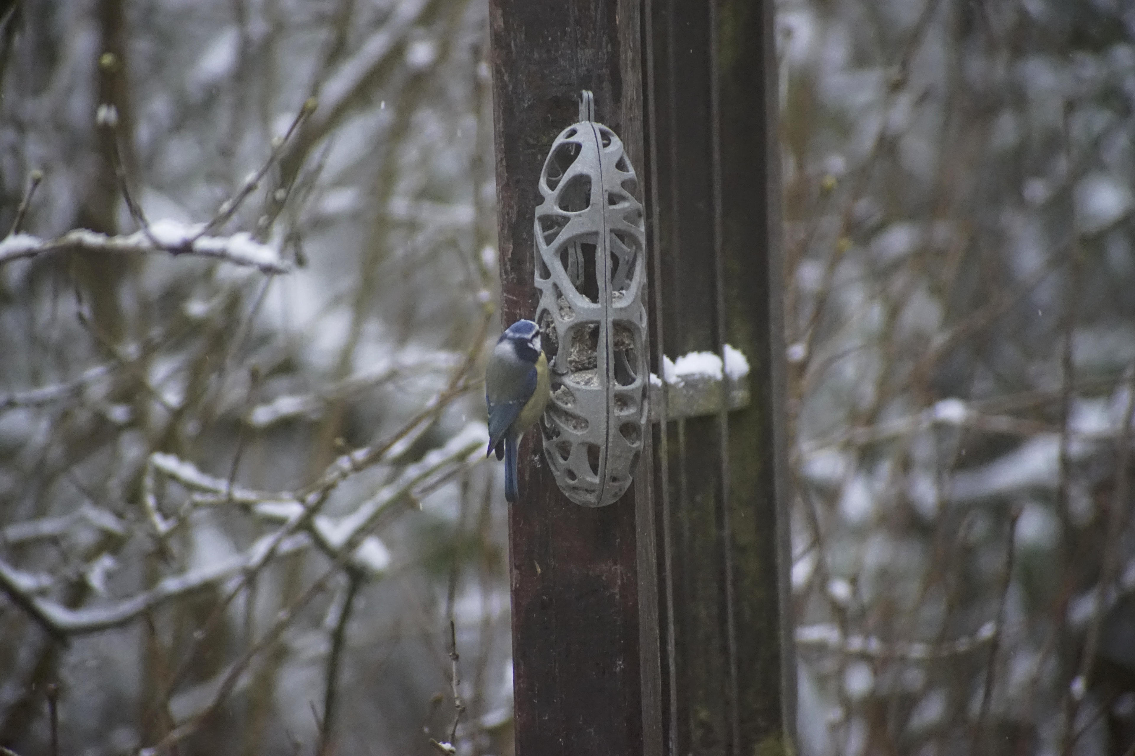 Zurück zu den Fotos: Hier sehen wir (wahrscheinlich) eine Sumpfmeise. (Ich kenn mich nicht aus. Grüße an Finchen, die hat das in ihrem Vogelbuch nachgeschaut.) Ist aber auch eigentlich egal, wie das Tier heißt, Hauptsache Vögelchen! (Kann auch eine Weidenmeise sein. Da wir hier viele Weiden entlang des feuchten Hanfbachs haben und ich mal davon ausgehe, dass bei beiden Vögeln der Name Programm ist,... hilft das auch nicht weiter, kann beides sein.) Aber man kann sehr gut erkennen, dass mit dem Sigma sogar aus der Mitte das Bildes noch hervorragend Crops gemacht werden können. Das ist jetzt sozusagen 1:1, nur eben auf Web-Größe runter komprimiert, was ein paar Artefakte hauptsächlich im Farbverlauf des Hintergrunds produziert hat. Aber der Vogel ist ausreichend scharf. Und niedlich! Glück gehabt: Auf dem nächsten Bild ist er schon aufgesprungen und aus dem Fokus geflogen!