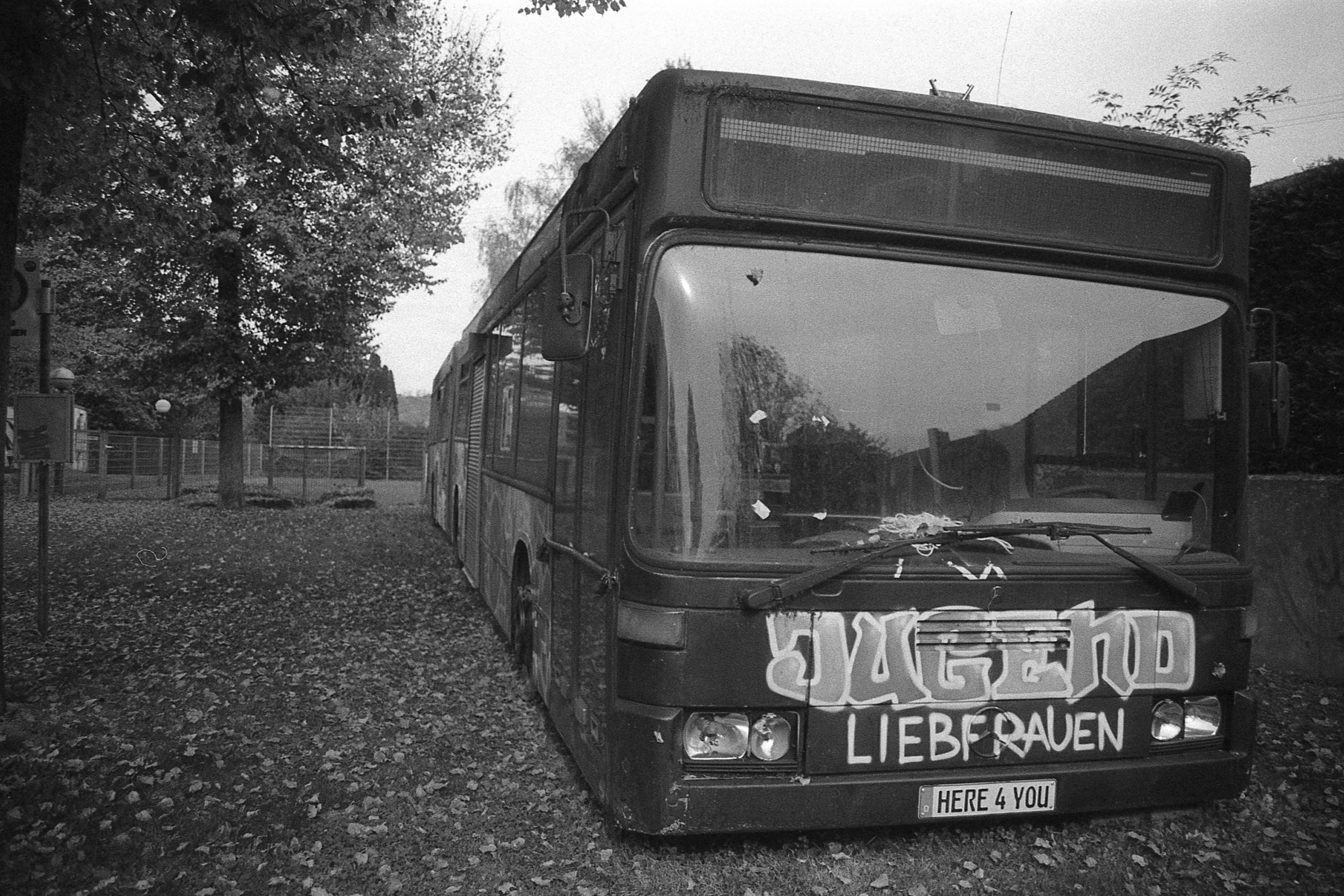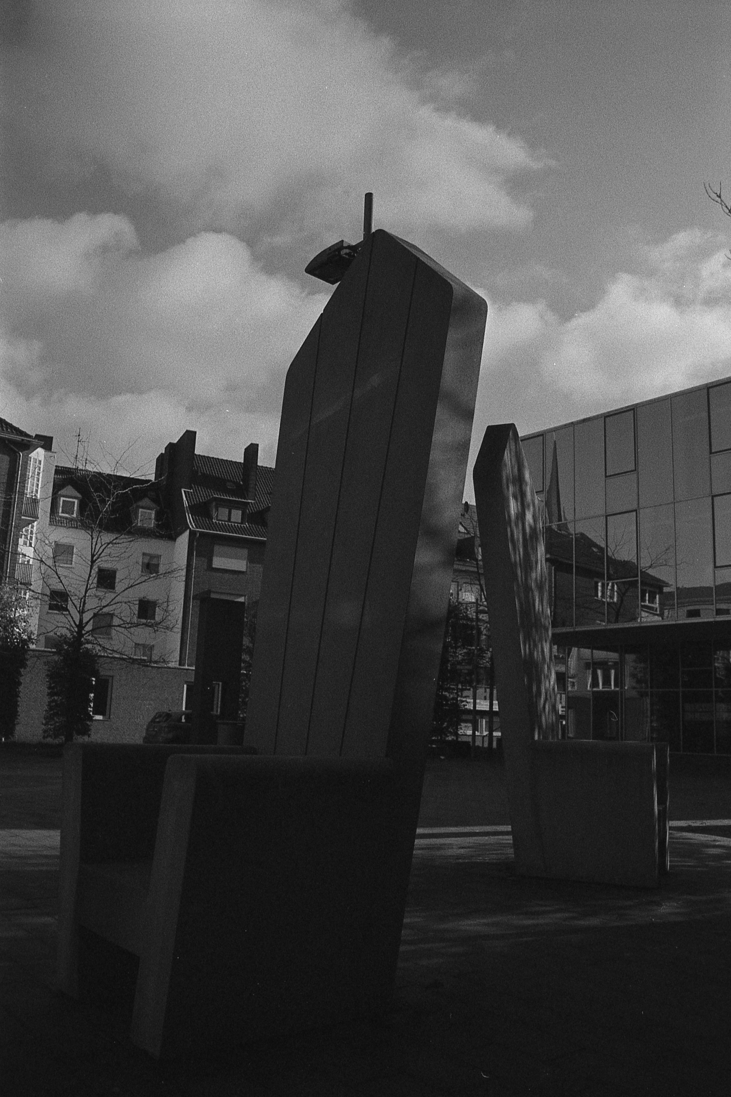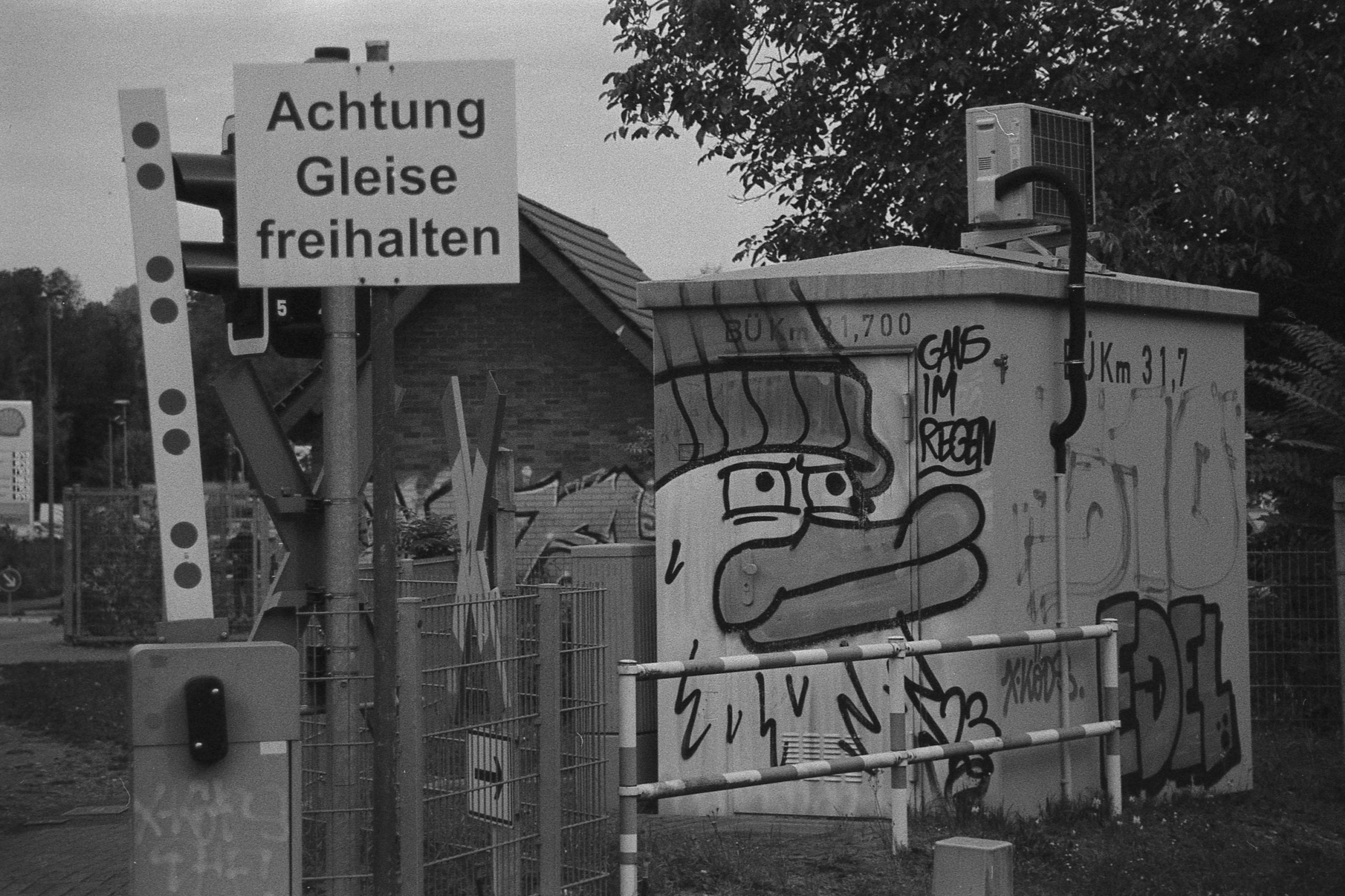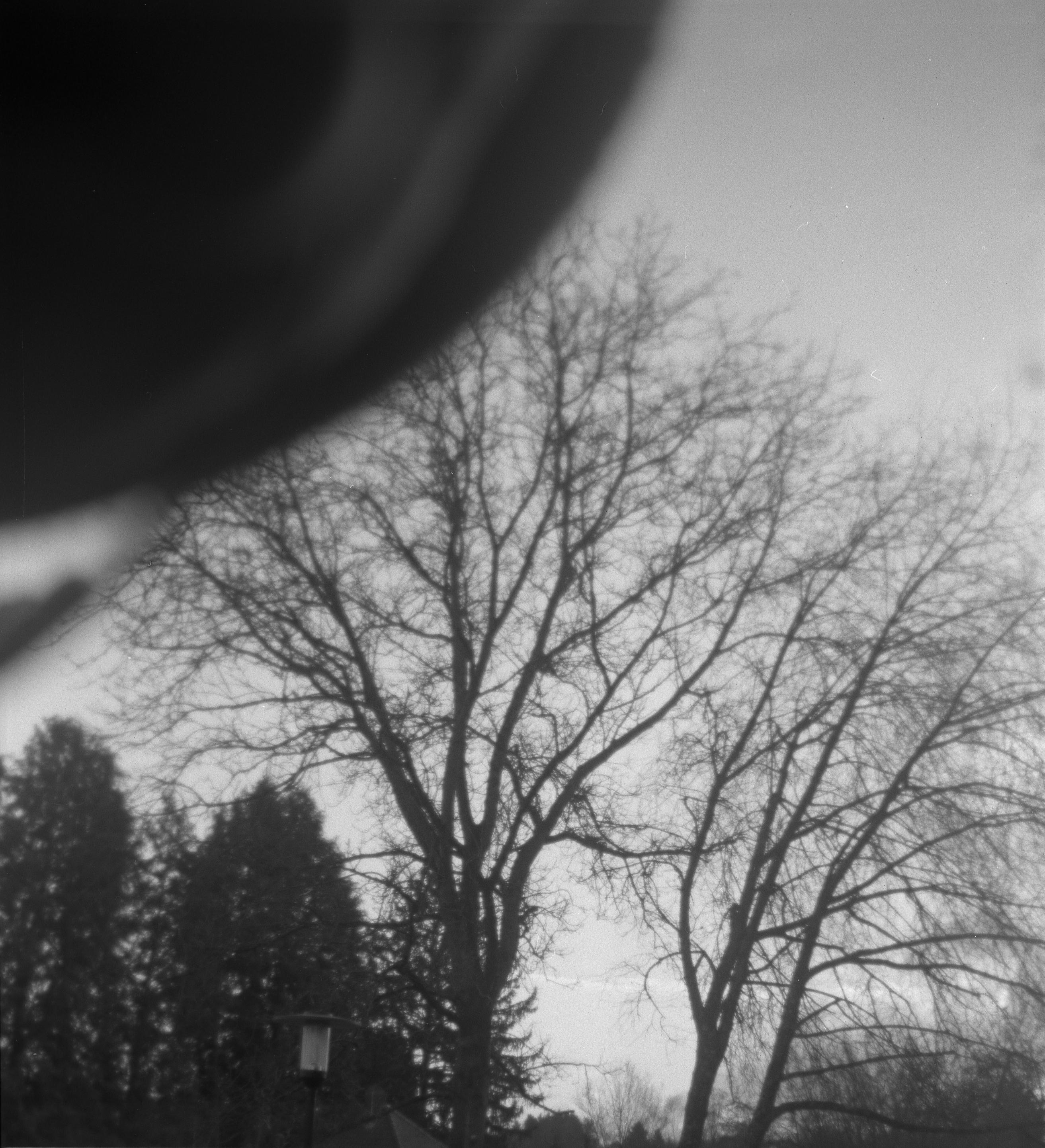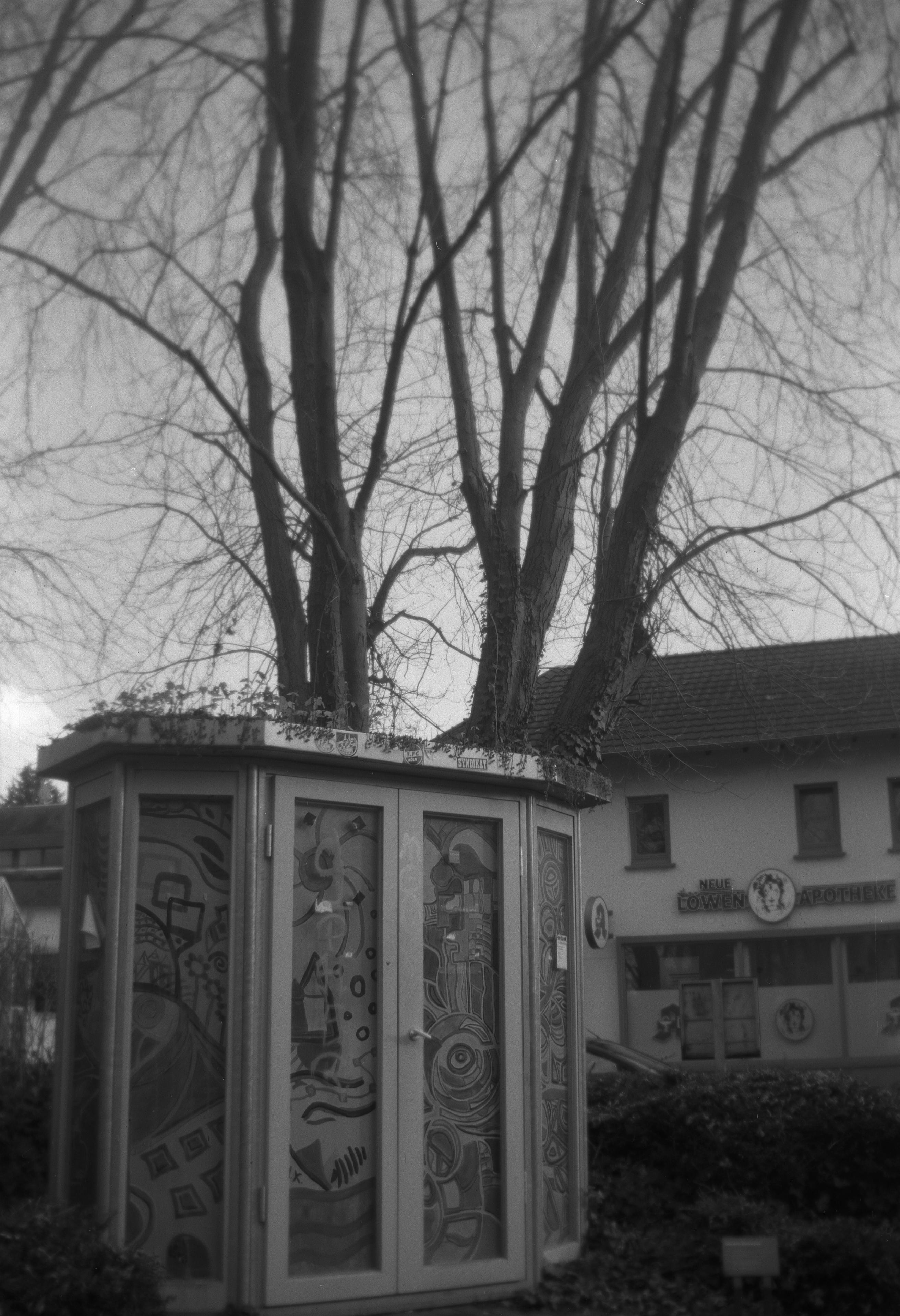 Ich kann mich nicht mehr genau erinnern, was bei dem Bild mit der Laterne schief gelaufen ist, aber das ist irgendwie nur noch quadratisch brauchbar. Hatte ich da den Film nicht weit genug gedreht? Dann müsste da aber irgendwo ein Restbild von Doppelbelichtung auf einem der anderen sein. Ist es aber nicht. Oder habe ich die nicht in der richtigen Reihenfolge gescannt? Das könnte sein, das ist bestimmt das erste oder das letzte auf dem Film und die Hälfte ist im Klebestreifen des Papierrückens verschwunden. (So sieht das jedenfalls auf meinem unbearbeiteten Originalscan aus.) Keine Ahnung.
