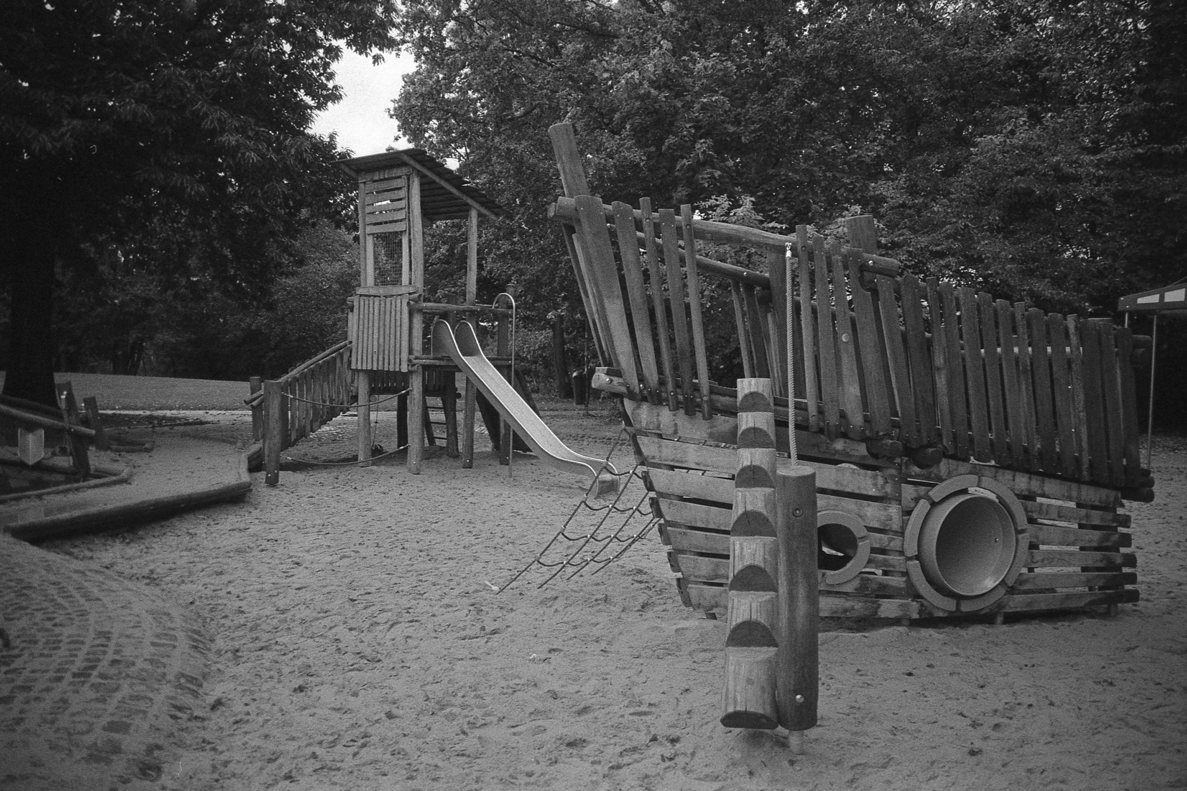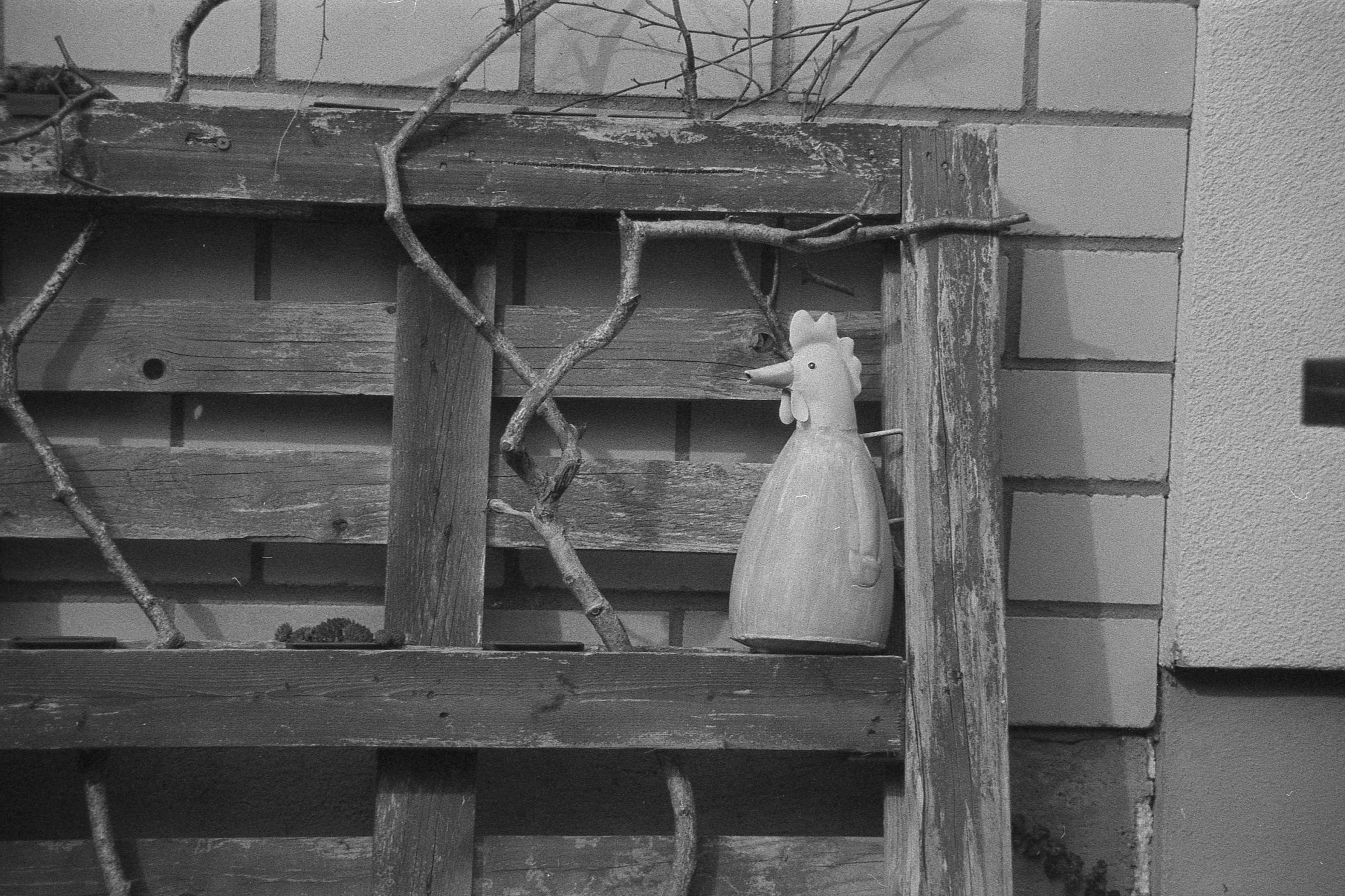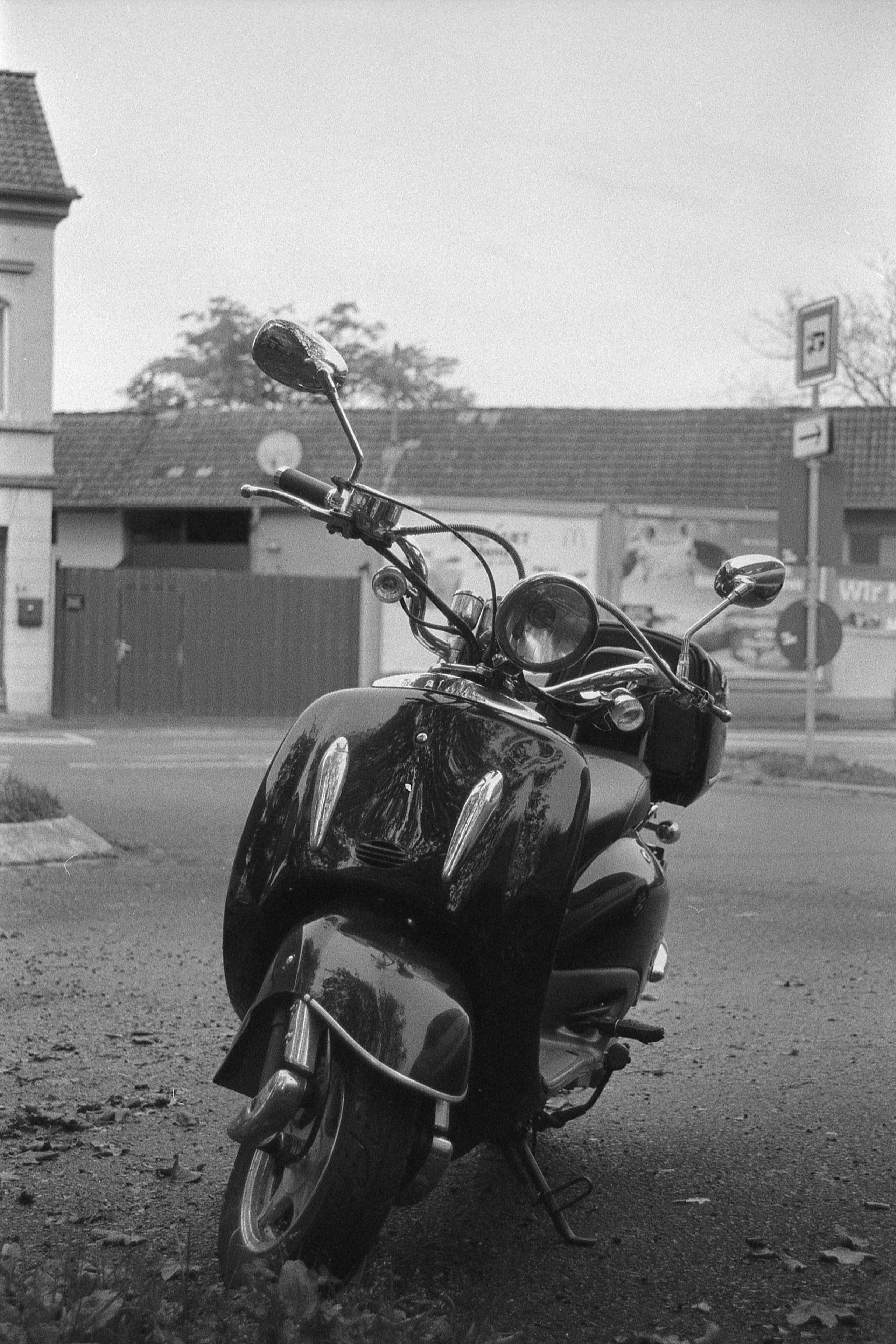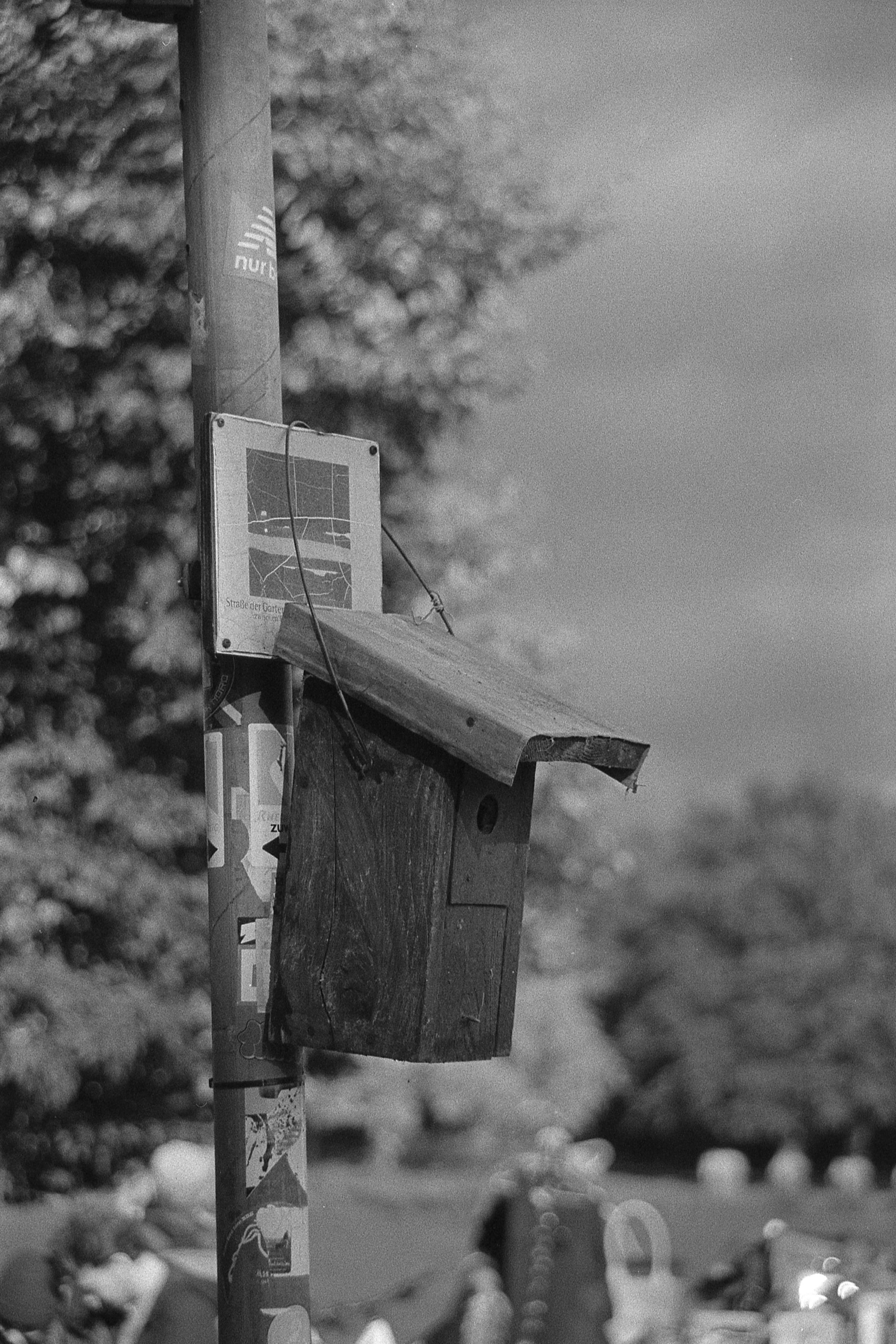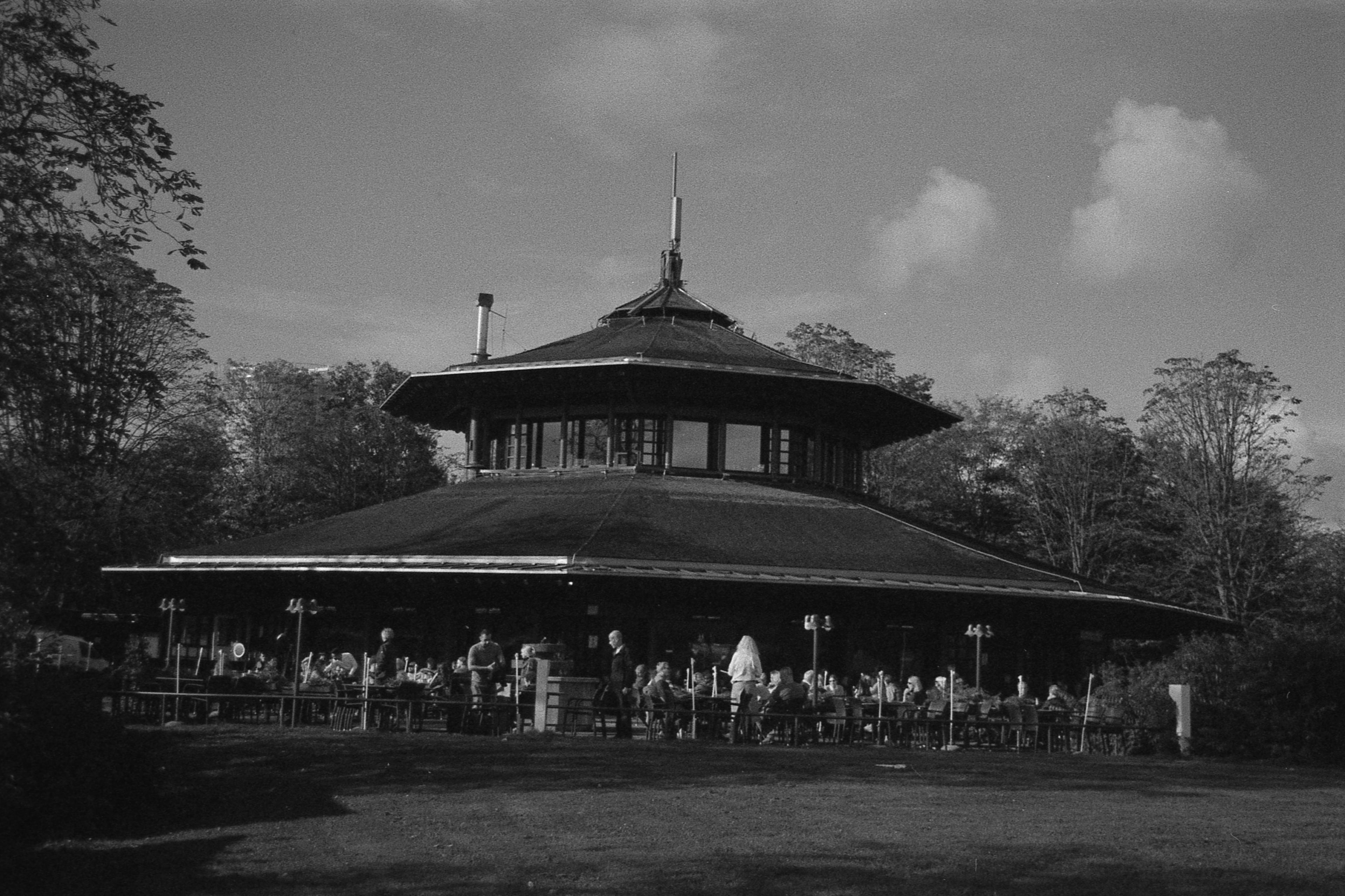 Ich kann mich nicht mehr genau erinnern, was bei dem Bild mit der Laterne schief gelaufen ist, aber das ist irgendwie nur noch quadratisch brauchbar. Hatte ich da den Film nicht weit genug gedreht? Dann müsste da aber irgendwo ein Restbild von Doppelbelichtung auf einem der anderen sein. Ist es aber nicht. Oder habe ich die nicht in der richtigen Reihenfolge gescannt? Das könnte sein, das ist bestimmt das erste oder das letzte auf dem Film und die Hälfte ist im Klebestreifen des Papierrückens verschwunden. (So sieht das jedenfalls auf meinem unbearbeiteten Originalscan aus.) Keine Ahnung.