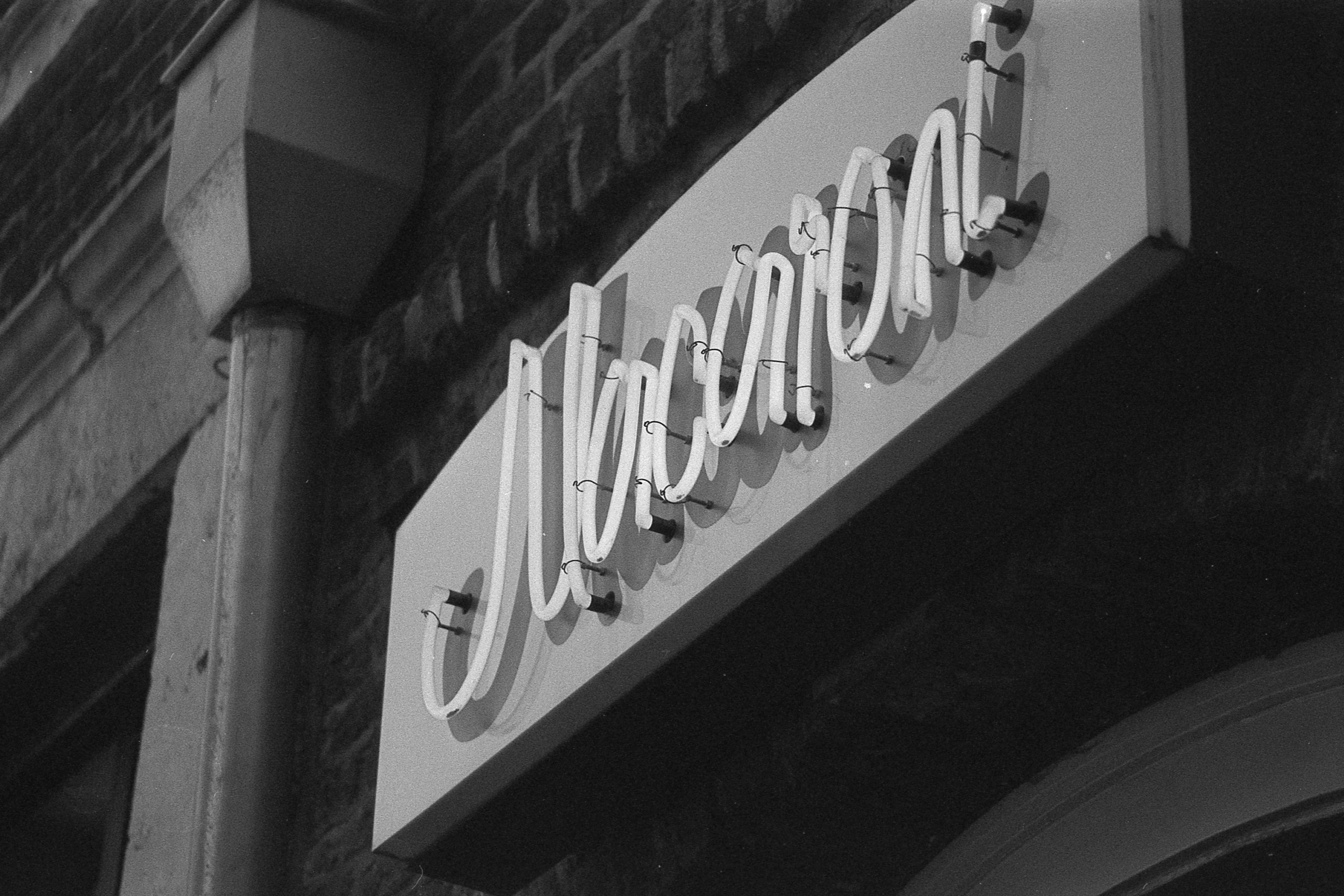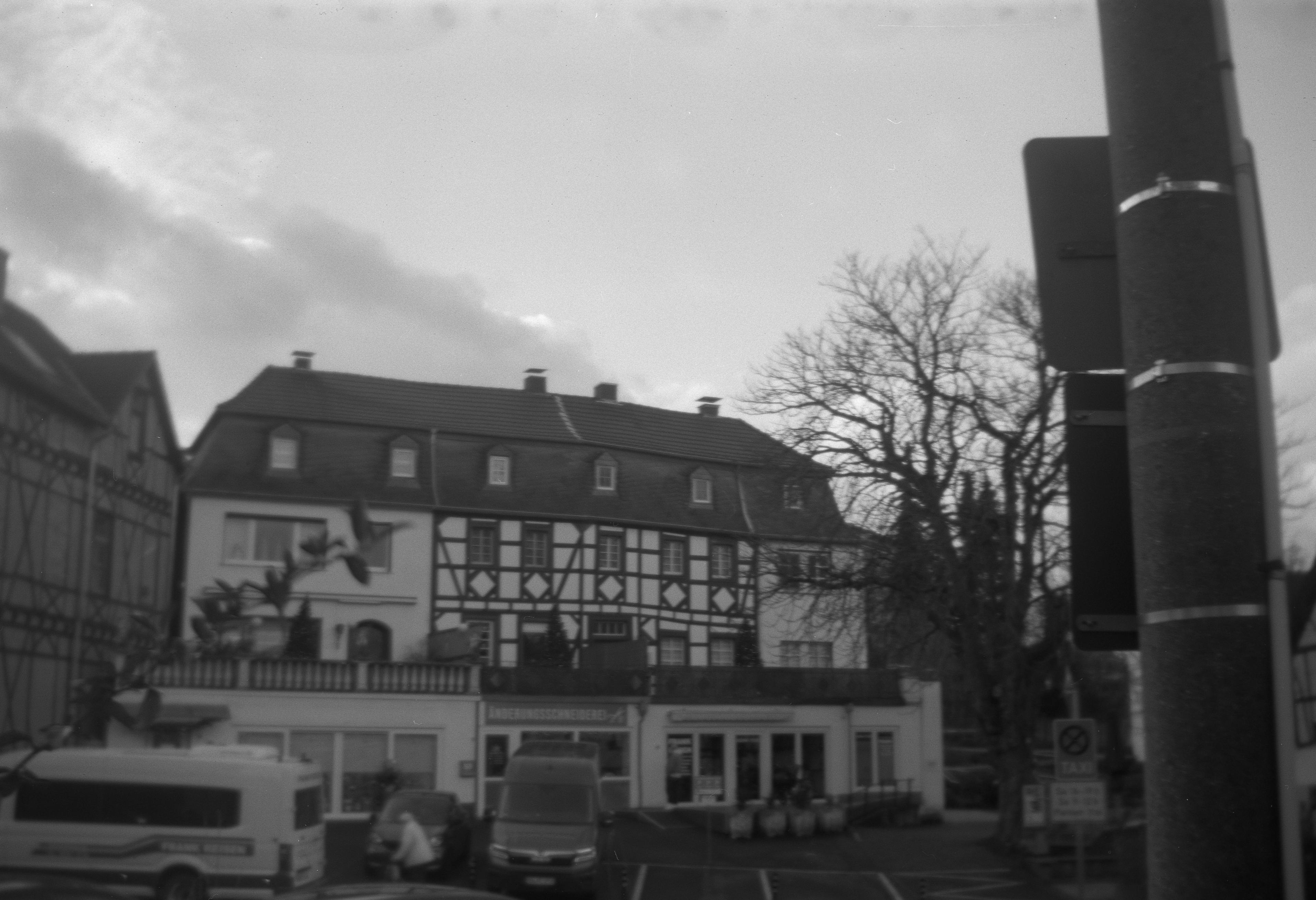 Je mehr Bilder ich mir anschaue, desto mehr habe ich den Eindruck, dass vielleicht auch die Andruckplatte nicht mehr richtig andrückt und der Film sich aufgewellt hat. Das würde einige der Unschärfen erklären, aber vielleicht auch, weshalb sich der Laternenmast da am rechten Rand so sehr durchbeult.