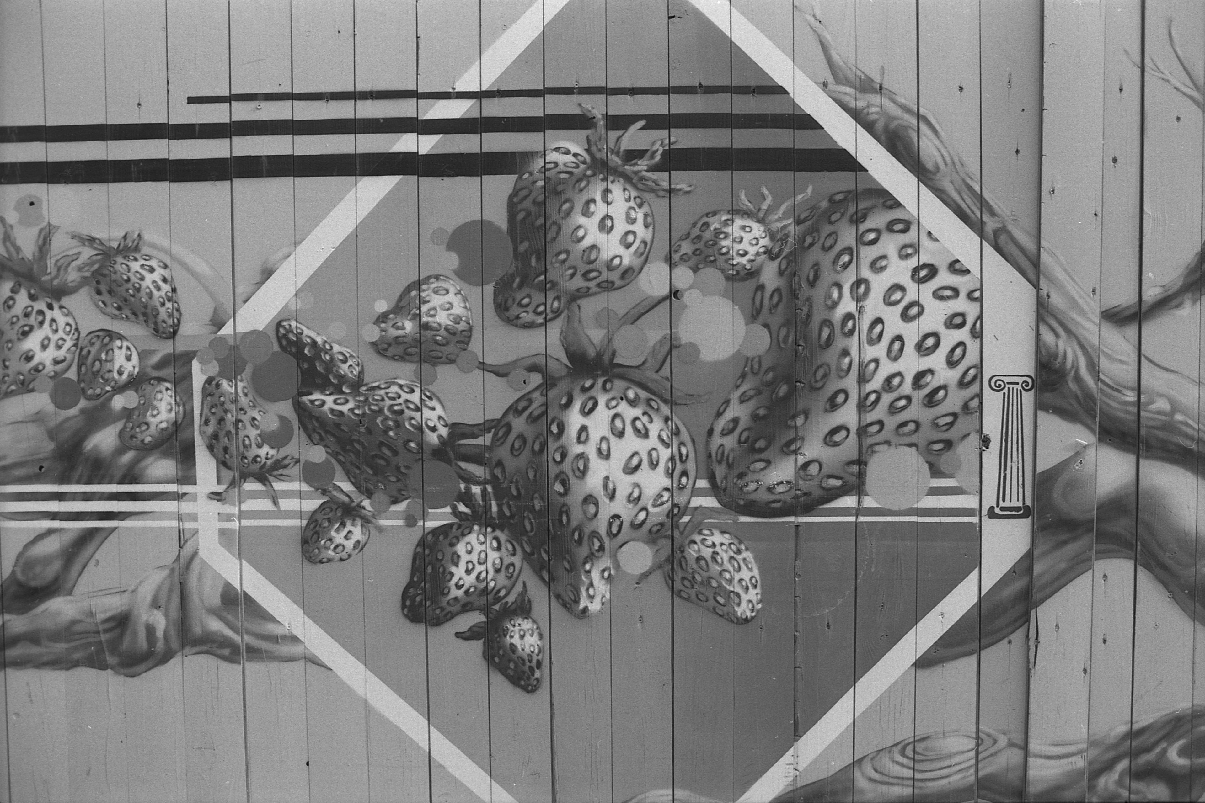 Architektur wird übrigens so ein Thema sein auf diesem Film, da sind immer wiede rso ein, zwei, manchmal auch drei Fotos dazwischen, auf denen hauptsächliuch Mauern und Gedöns zu sehen sind. Manchmal habe ich mir dabei was gedacht, aber meistens nicht. Den Bauzaun mit den Erdbeeren konnte ich allerdings auch nicht links liegen lassen, der war schon interessant. Überhaupt war der von allen Seiten angemalt.