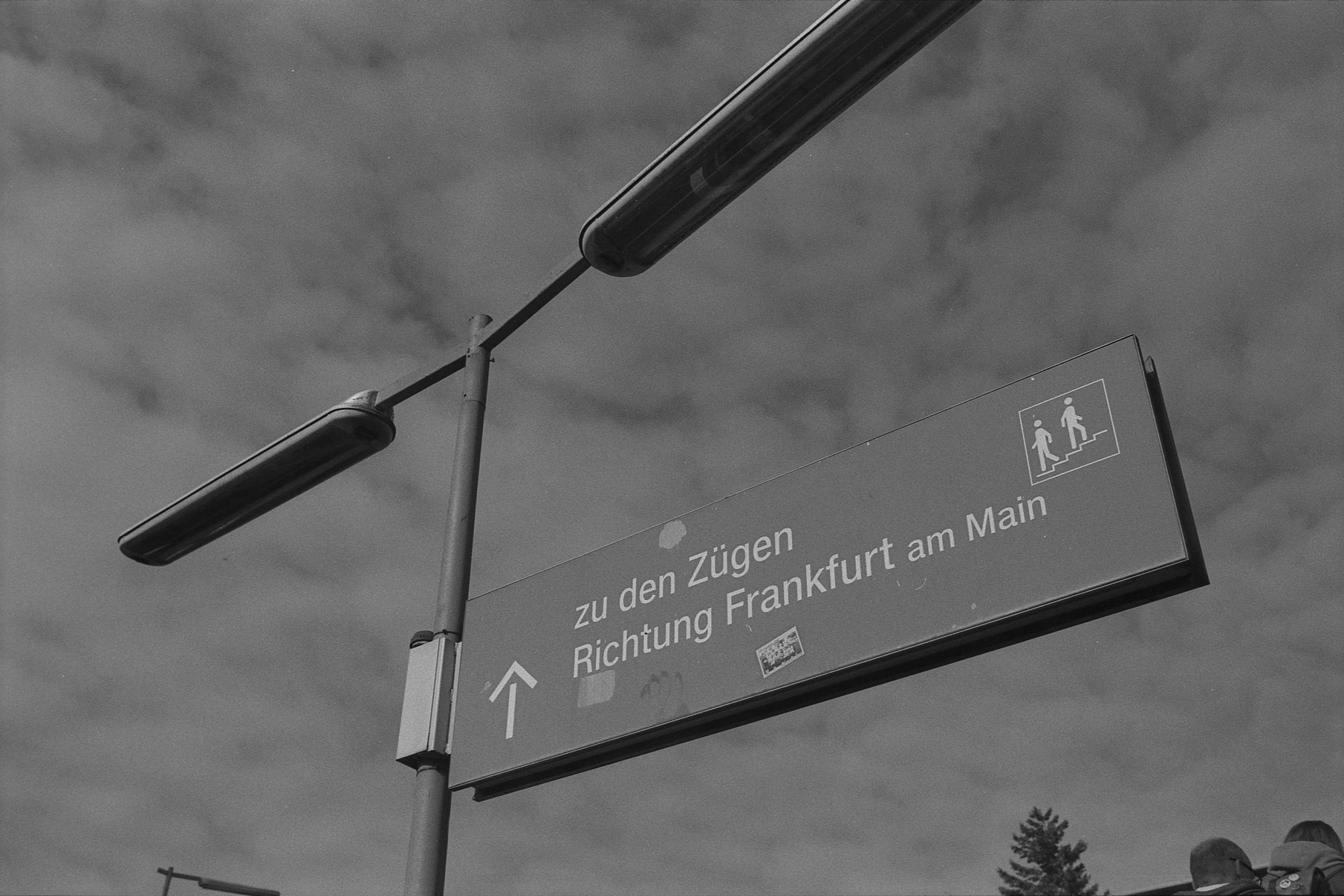 Fangen wir also am Bahnsteig in Homburg an: Ich mag ja Gelsänder und Brücken und alltägliche Szenen. Diese ist ein bisschen schief geworden, aber das macht nichts, da kann ich mit leben. Wir hatten es eilig, der Zug kam, das sieht man in diesem Foto deutlich. Deswegen gibt es auch nur noch ein einziges weiteres Bild vom Bahnsteig: Den Wegweiser zu den Frankfurter Zügen.