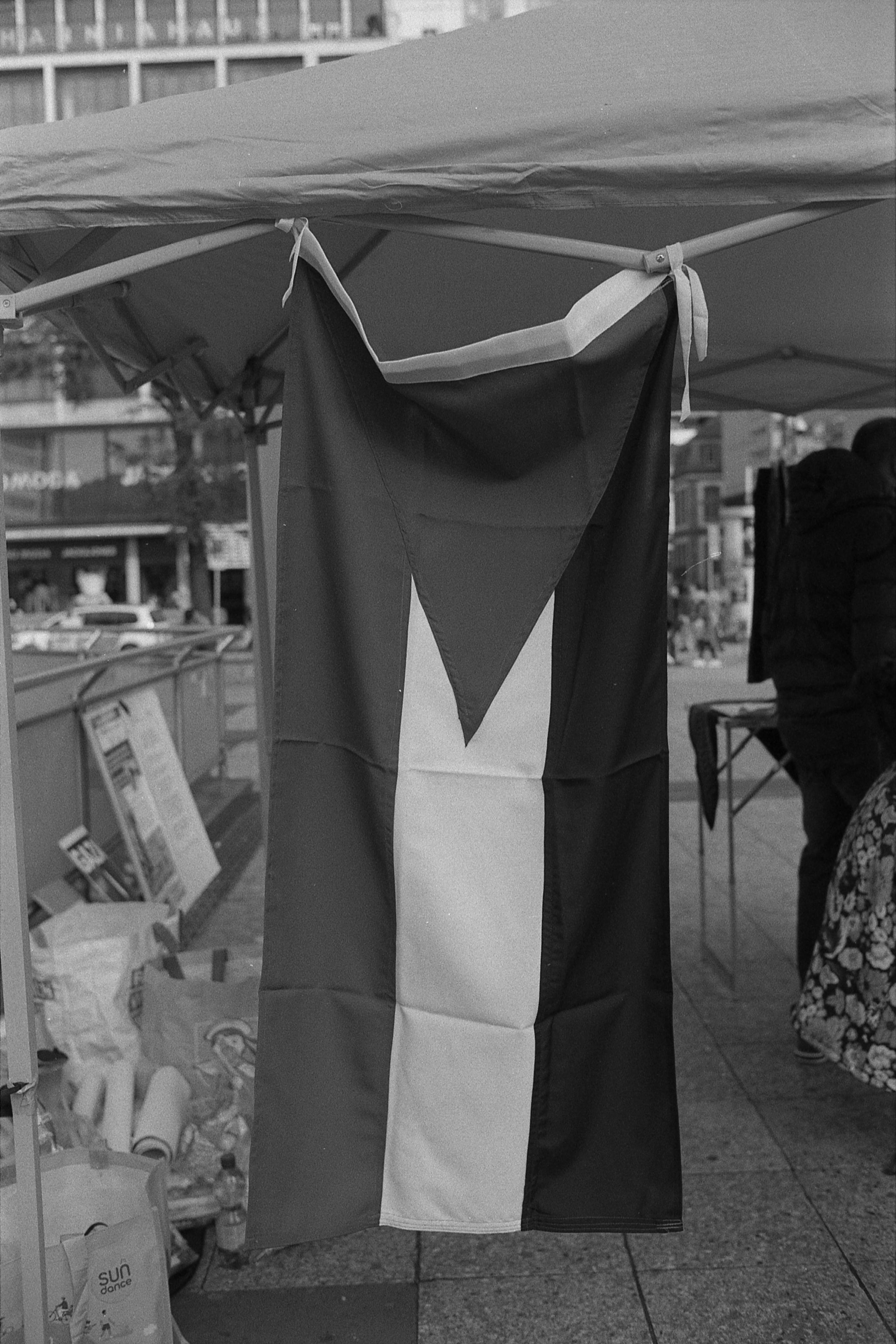 Dann waren wir auch schon - zack - in der großen Stadt mit den ganzen Banken und Versicherungen und Börsen-Gedöns. Am Bahnhof habe ich dann mal die Uhrzeit dokumentiert. Weil ich es konnte. Und weil ich wie gesagt den Film wechseln wollte. Bei dem Wetter, das sich ankündigte, war der 400er nämlich zu schnell, bzw. die Kamera zu langsam, was ich von der F90 normalerweise nicht gewohnt bin, die kann immerhin 1/8000s. Aber für einen Schnappschuss der ersten Hochhäuser hat es dann doch noch gereicht. Der 400er Kentmere ist doch deutlich körniger als der 100er, das sieht man hier ganz genau bei dieser direkten Gegenüberstellung. Nebenan wurde für Palästina demonstriert, daher die Fahne. So eine Art Mahnwache. Die Gegendemo habe ich allerdings nicht gesehen. Hätte ich eigentlich eine erwartet.