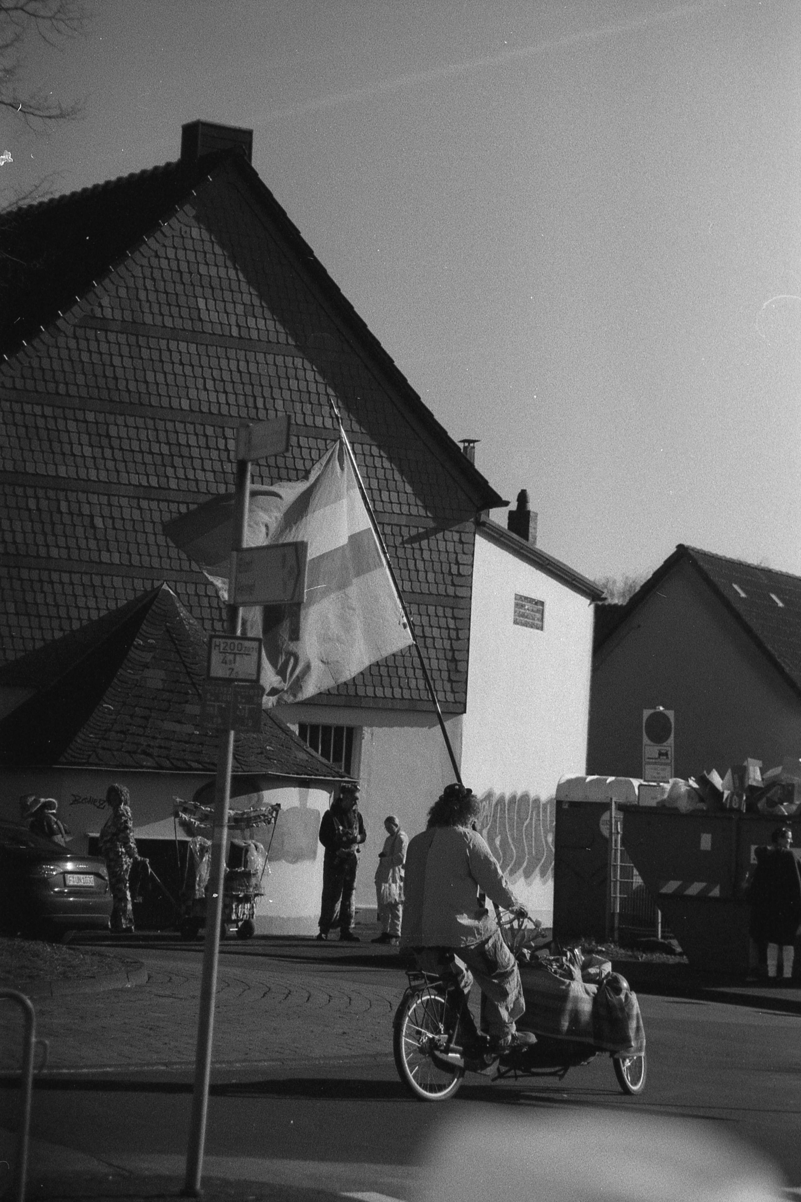 Und den Clown auf dem Lastenfahrrad mit der großen Fahne wollte ich auch nicht einfach so entwischen lassen. Man muss ja auch mal den ein oder anderen lebendigen Menschen auf den Fotos haben, gerade beim Karneval. Und bunte Clowns kommen auf s/w-Film immer besonders gut! Ist ein vollständig aus der Hüfte geschossenes Bild, also schon erstaunlich, dass ich überhaupt was getroffen habe.