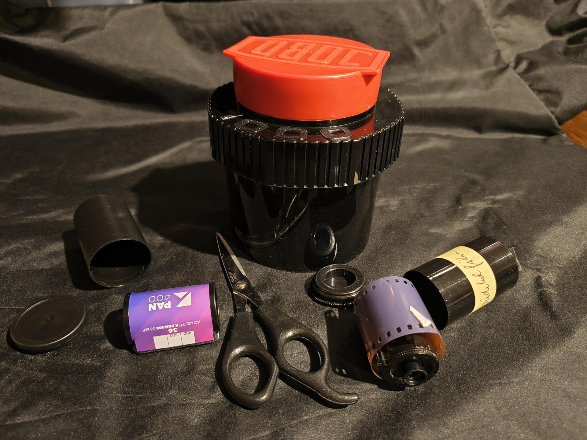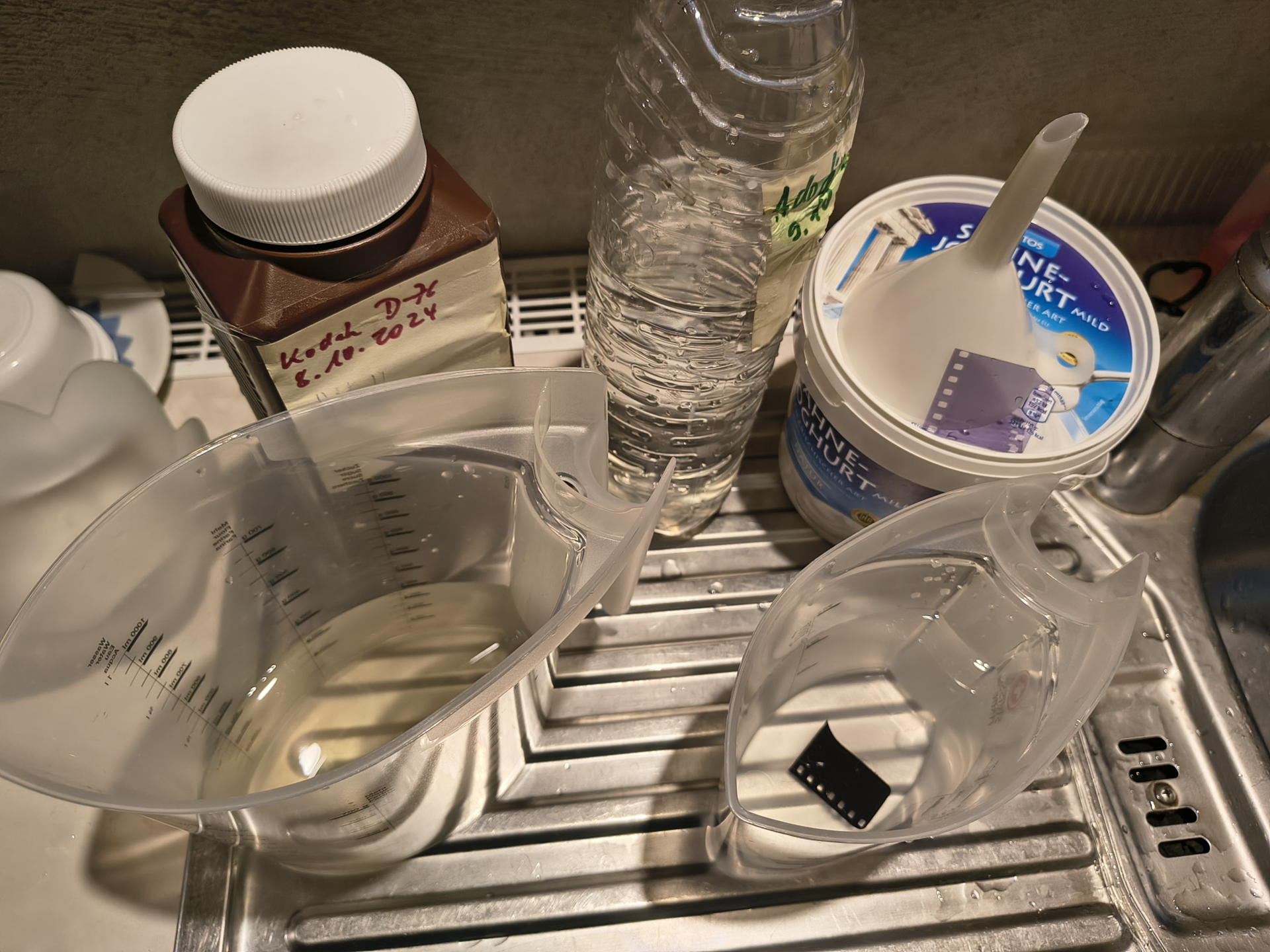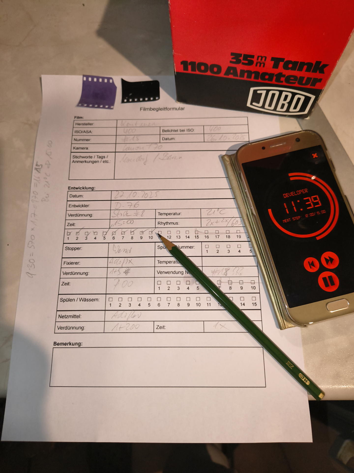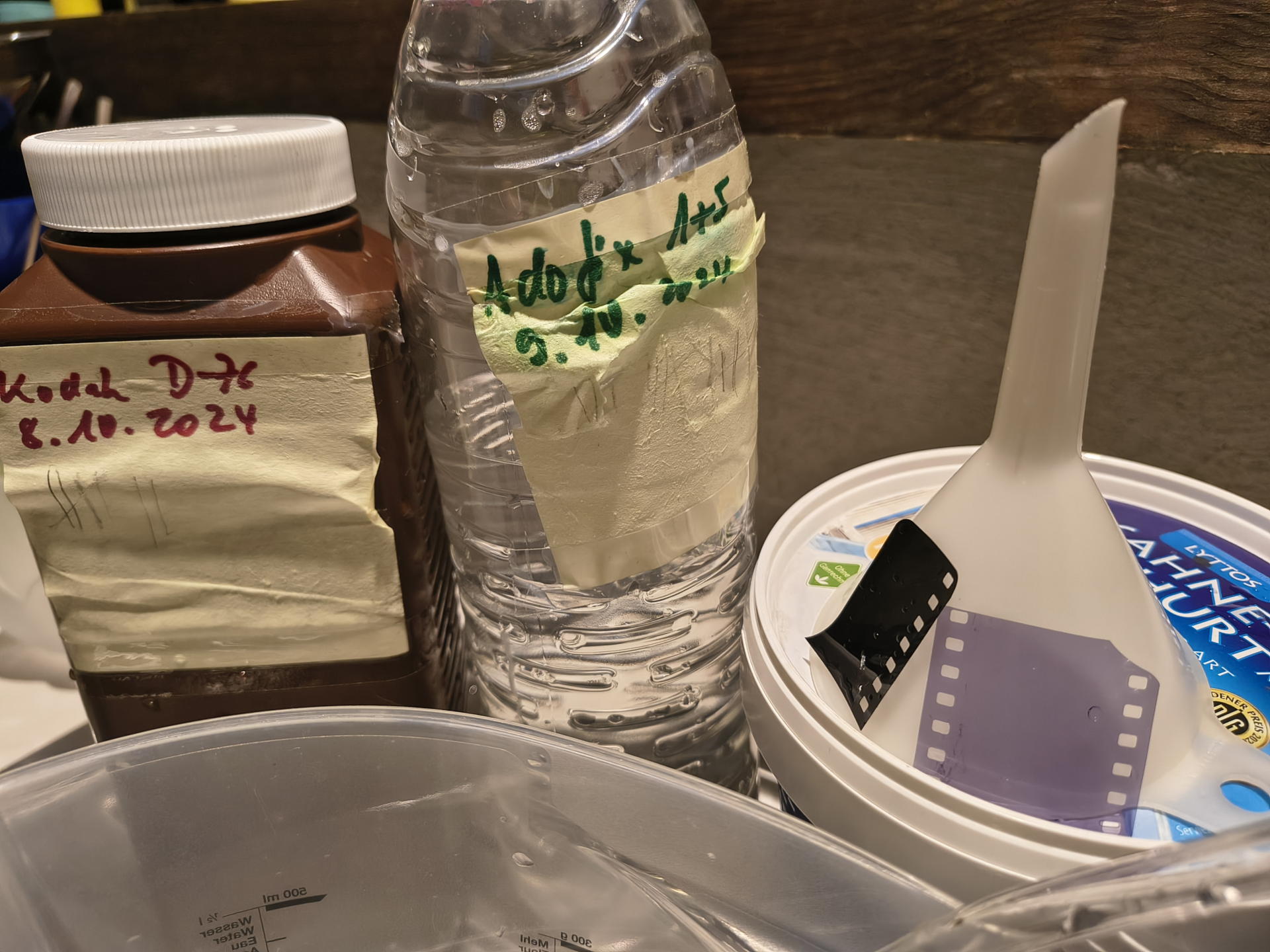 Die Entwicklung habe ich mal wieder mit dem uralten Kodak D-76 vorgenommen, das muss ja echt dringend weg. Aber noch funktioniert es einwandfrei, auch wenn es sich langsam ein bisschen gräulich verfärbt. Bin ja jetzt auch beim achten Film gewesen. Wie gesagt, ich sollte dazu übergehen, das als One Shot Verdünnung zu verwenden, dann müsste ich auch nicht so viel rechnen. Aber das produziert einfach noch viel mehr Abfall, das will ich ja eigentlich auch nicht.