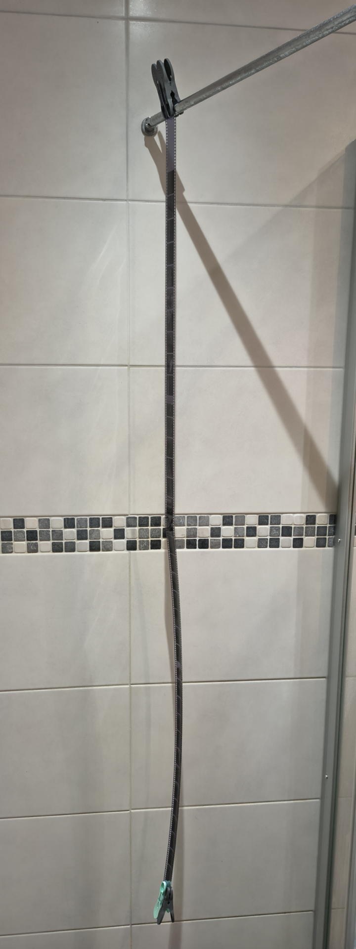 Apropos rechnen: Erst mal habe ich meinen üblichen Verlängerungsfaktor von 10% pro Film drauf gerechnet. Dann hatte ich das Wasser aber nicht richtig temperiert bekommen: Drehe ich den Wasserhahn auf "kalt", kriege ich zZt so 15°C da raus. Aber stelle ich nur minimal in Richtung "warm", schon bin ich bei 25°! Die Mischung hat in meinem großen Pufferbecken dann ungefähr 21° ergeben. Also noch mal eine Minute wieder runter, sodass ich mich für diesen Kentmere 400 schließlich auf 15 Minuten geeinigt habe. Das habe ich dann erst mal an einem Stück des Leaders getestet, der so ab Minute 10 anfing, sich zu verdunkeln, und bei Minute 14 praktisch nicht mehr schwarzer wurde. Ich hab dann einfach mal angenommen, dass 15 Minuten OK sind. Nach dem Fixen sah das dann auch sehr gut aus, gerade so, dass ich die Stromsparbirne dadurch noch sehen konnte.